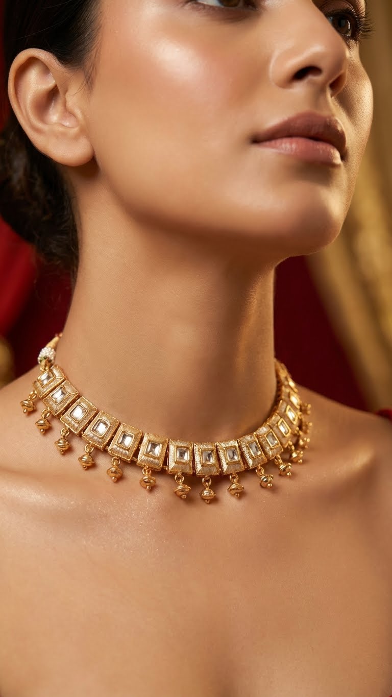 Bold, radiant, and effortlessly regal — the Ambera Gold Choker Set is designed for women who appreciate timeless glamour with a modern edge. This striking choker features meticulously aligned gold-toned panels accented with high-shine stones, finished with graceful drop charms that create captivating movement. The matching geometric earrings complete the ensemble, delivering a look that is powerful, elegant, and unforgettable.
