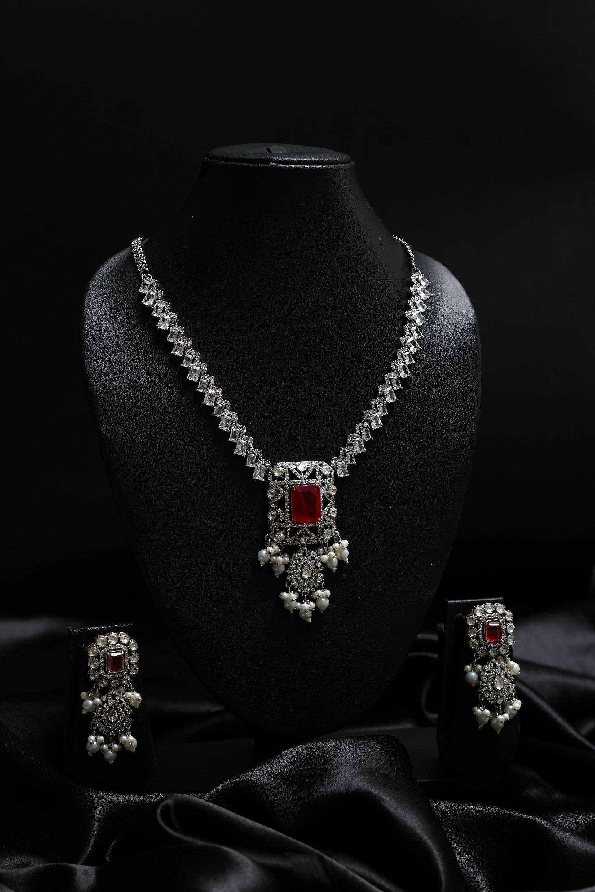 The Ruby Heirloom Pearl Royale Necklace Set brings together the majestic beauty of heritage jewellery with the brilliance of contemporary diamond craftsmanship. Designed in premium brass and finished in a radiant rhodium-polished silver sheen, this masterpiece captures the essence of royal elegance.