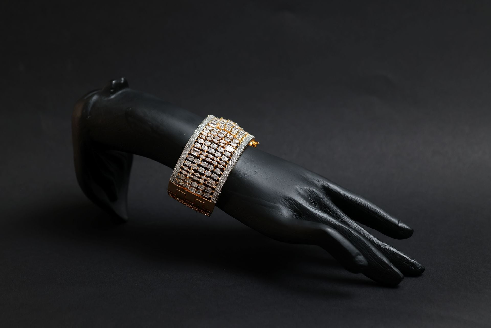 Its clean, geometric silhouette is elevated with delicate micro-pavé accents, giving it the sophisticated finish seen in high-fashion designer jewellery. Lightweight yet sturdy, this kada wraps the wrist with effortless glamour—perfect for weddings, parties, festive occasions, and high-end evening wear.