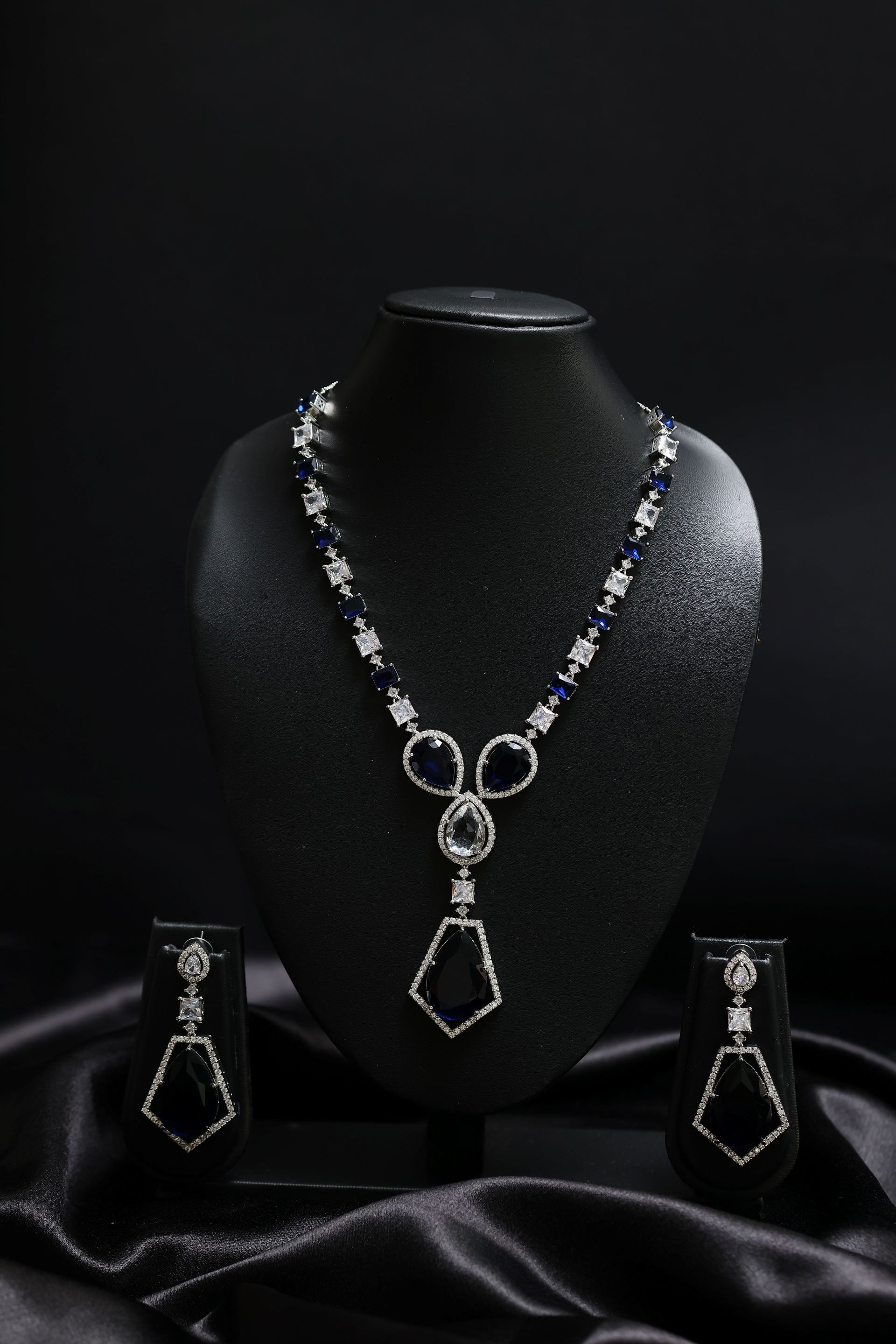 • Polish: Rhodium-Finished Silver • Stones: AAA+ Midnight-Blue Crystals · Premium Brilliant-Cut CZ • Design: Alternating Blue & CZ Link Chain · Dual CZ Loop Connector · Geometric Prism Pendant • Earrings: Matching Prism Drop Earrings with CZ Halo • Closure: Secure Lobster Clasp • Occasion: Gala · Reception · Cocktail · Festive · Red-Carpet Evenings