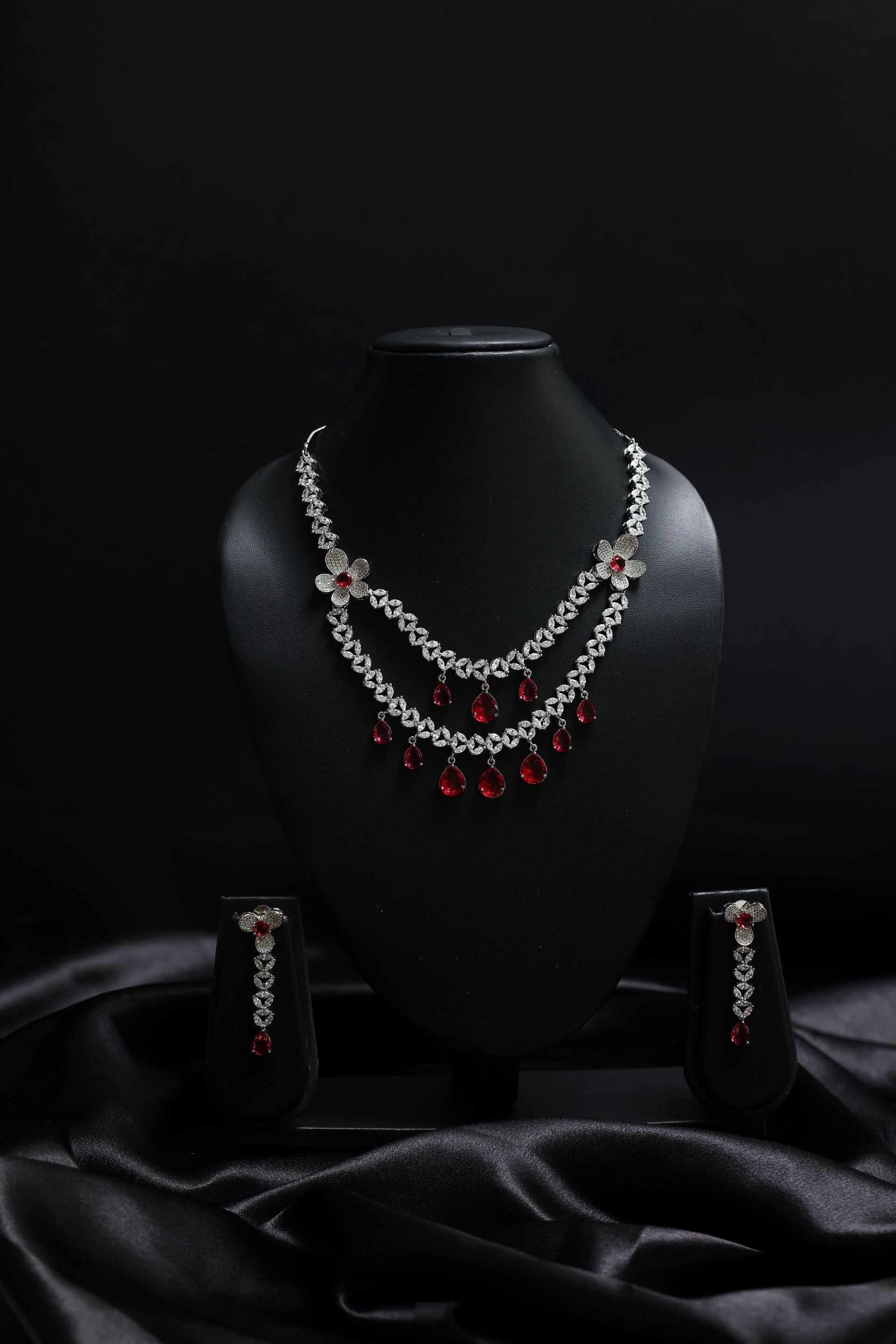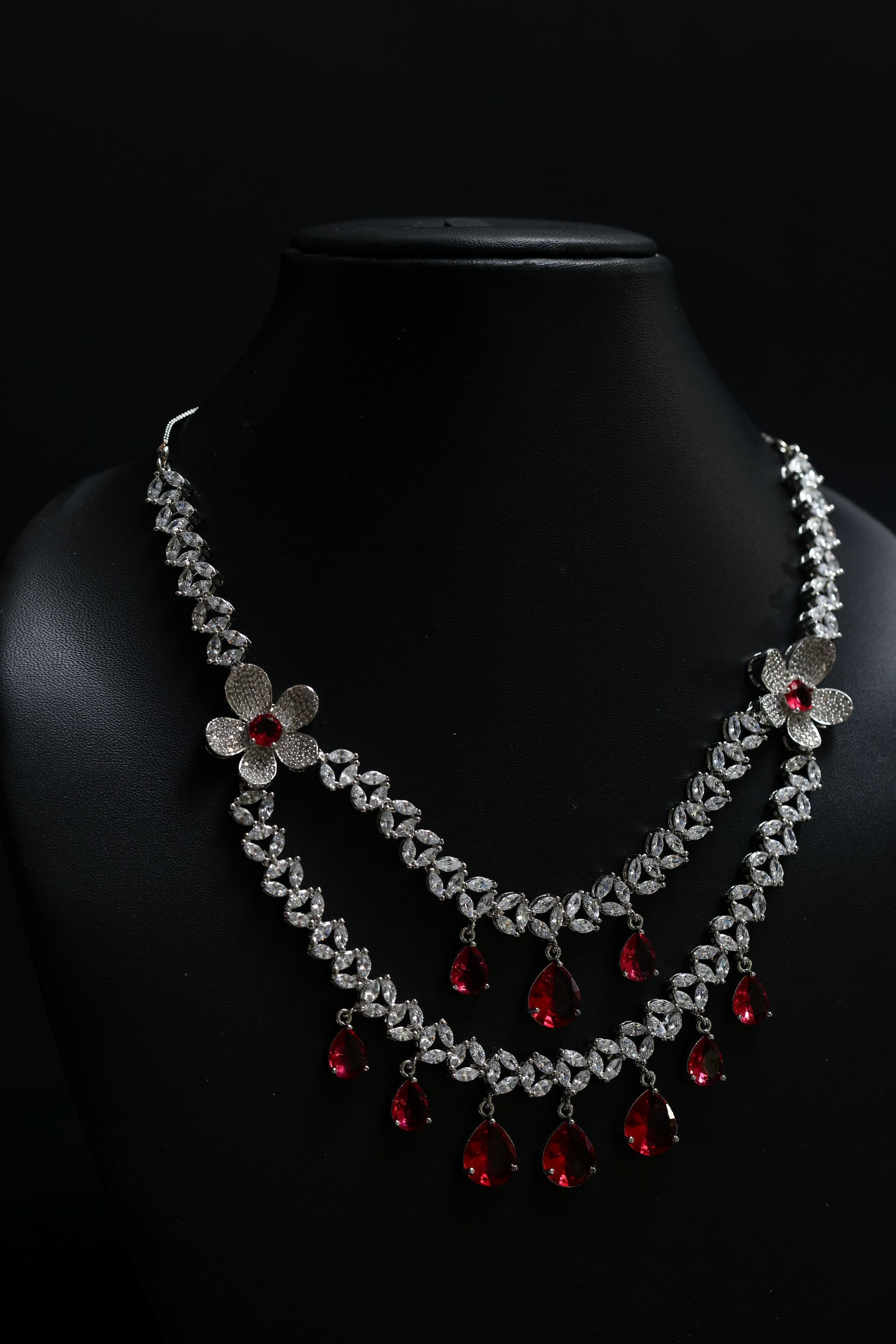 The Ruby Cascade Blossom Diamond Necklace Set is a breathtaking blend of floral elegance and high-fashion brilliance. Handcrafted in premium brass and finished with a radiant rhodium-polished silver shine, this necklace reflects the luxurious charm of fine designer jewellery.