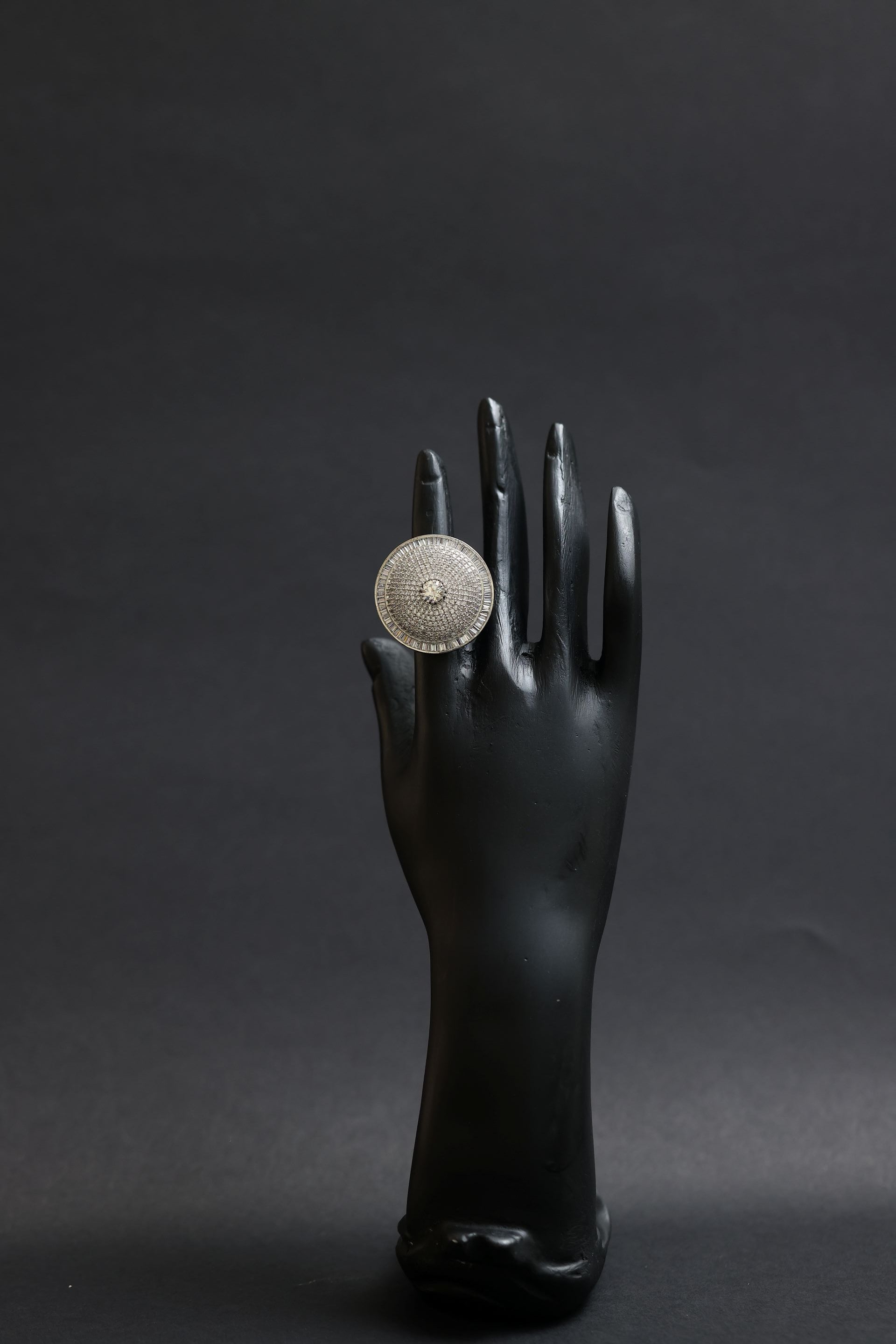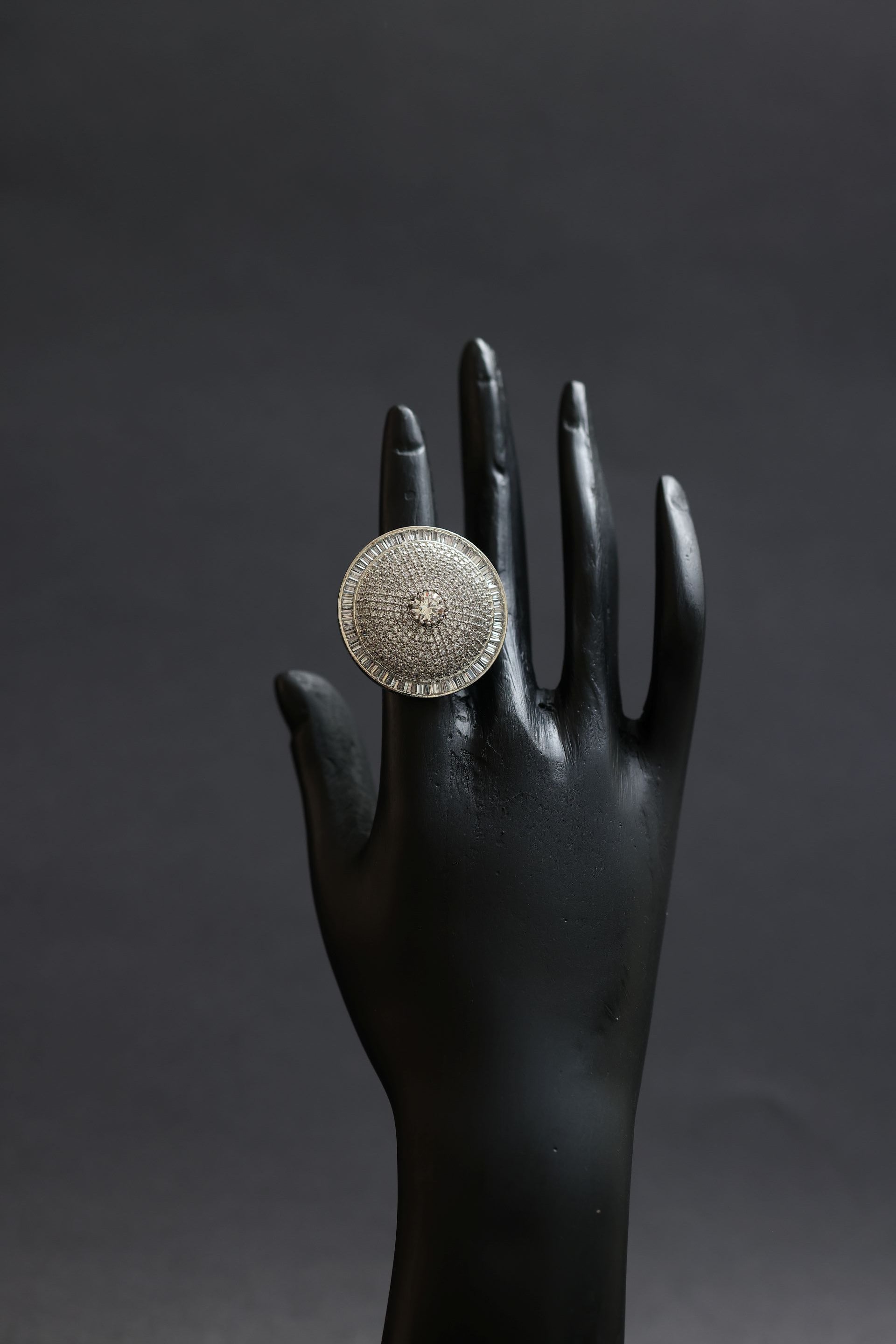 The radiant round shape elongates the fingers beautifully, while the cool silver-toned rhodium finish enhances the icy brilliance of the stones. Perfect for bridal glamour, festive occasions, cocktail soirées, and sophisticated evening wear, this ring stands as an iconic statement piece — bold, timeless, and undeniably luxurious.