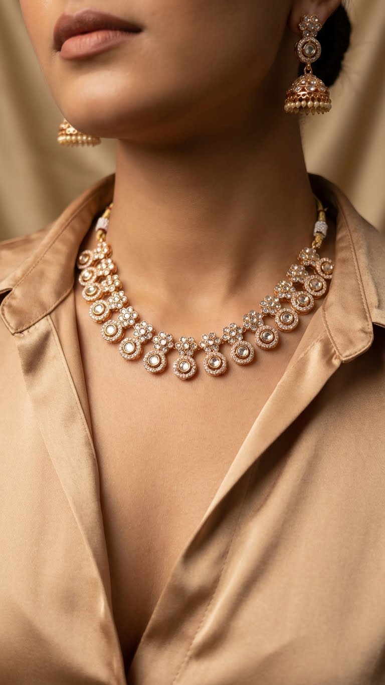 Graceful, radiant, and exquisitely refined — the Chandrakala Diamond-Look Kundan Necklace Set is designed to capture timeless bridal elegance. Featuring a flowing sequence of circular kundan motifs crowned with delicate floral clusters, this necklace reflects brilliant sparkle with every movement. The matching jhumka earrings and coordinated maang tikka complete the ensemble, creating a majestic look that feels both traditional and contemporary.