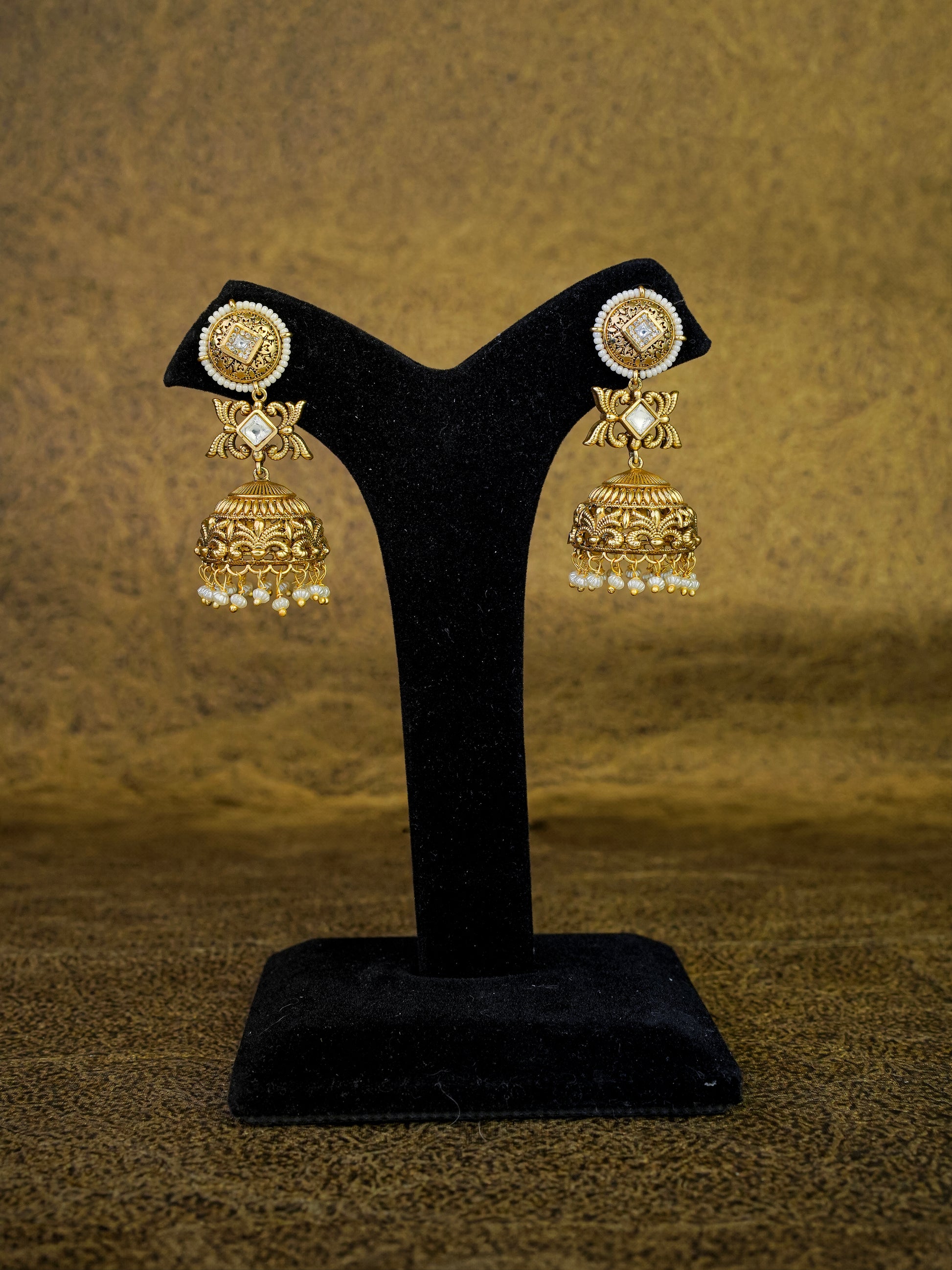 A sublime expression of understated opulence, this choker-style necklace set is inspired by the timeless elegance of classical Indian heirloom jewellery. Crafted in luminous antique gold tones, the necklace features intricate hand-carved motifs layered with delicate pearl accents and rhythmic gold elements that create a rich, sculptural silhouette around the neckline.