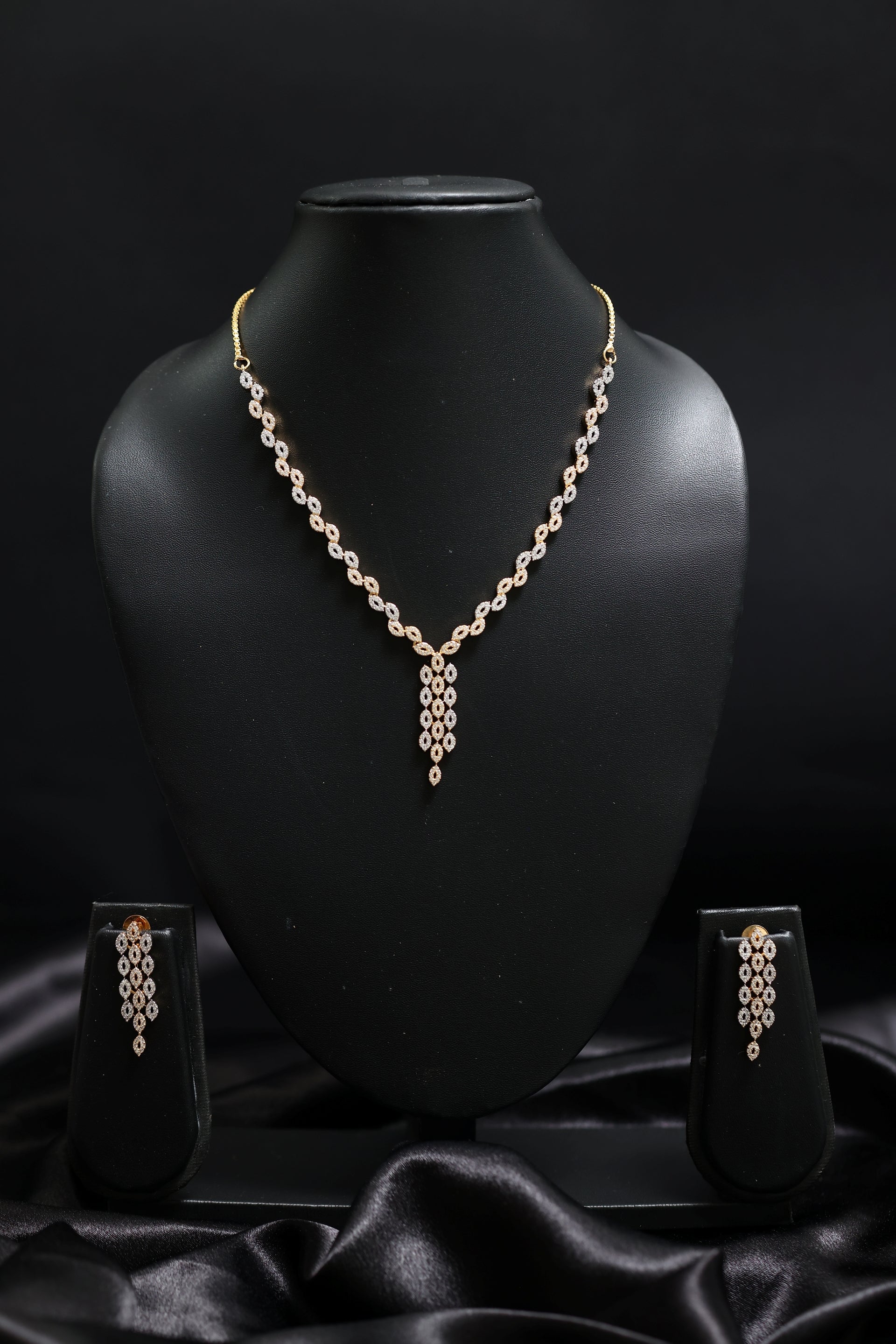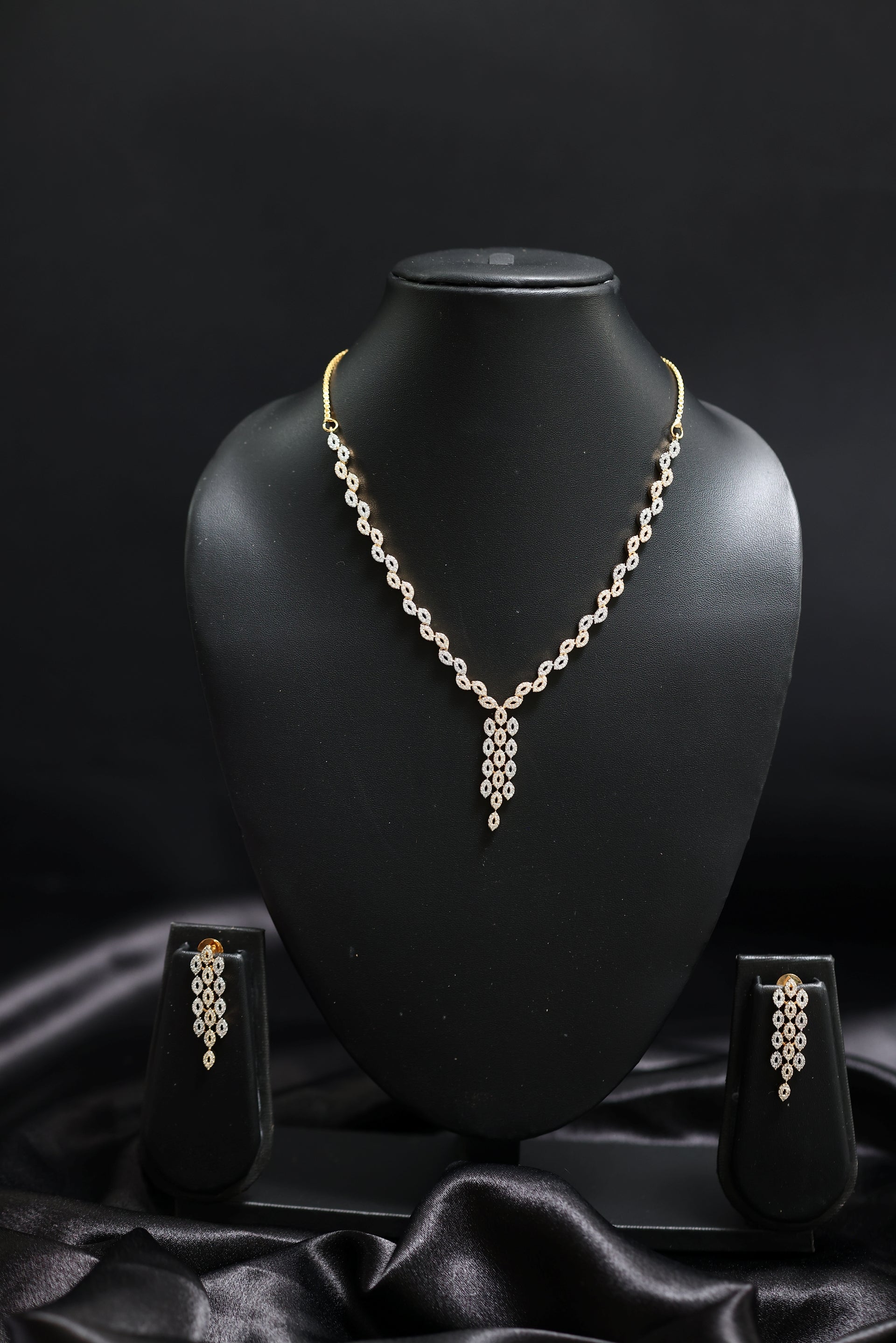 The Diamond Lattice Drizzle Necklace Set is a delicate fusion of modern elegance and understated luxury. Crafted from premium brass and finished in a radiant dual-polish—rhodium-bright silver paired with subtle golden accents—this piece echoes the refined craftsmanship seen in high-end designer jewellery.