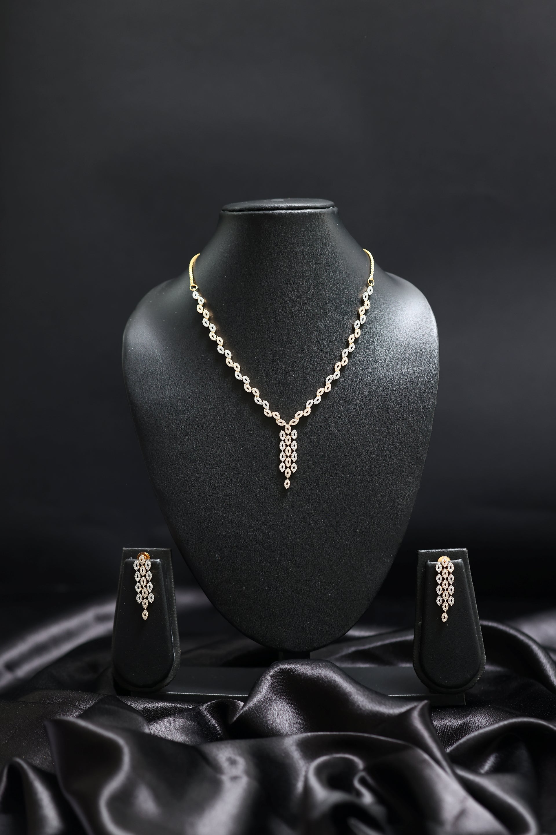 The necklace features a graceful V-shaped cascade made of miniature marquise-cut elements, each reflecting light with diamond-like brilliance. The lattice arrangement gives the design a fluid, shimmering movement, creating a soft waterfall effect at the neckline. Accompanied by matching long-drop earrings, the set delivers a sophisticated sparkle perfect for both contemporary and traditional ensembles.