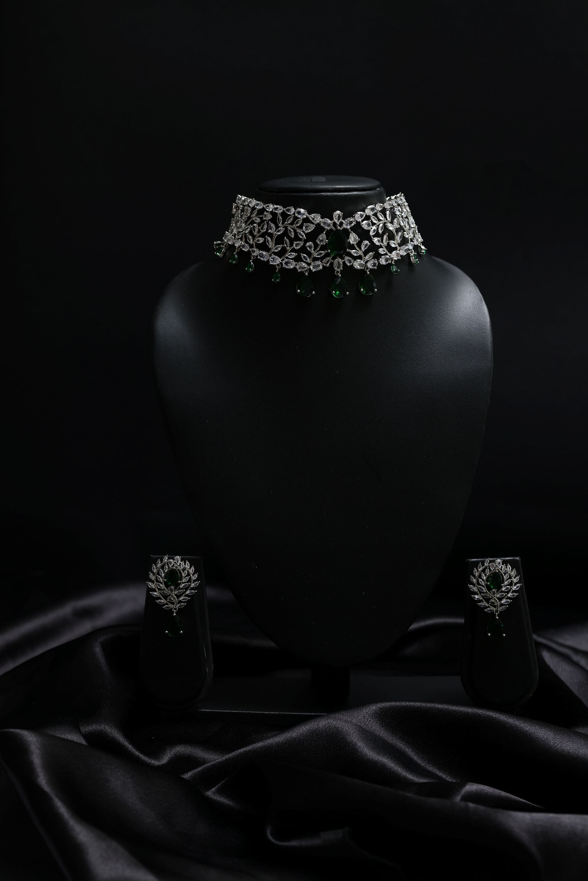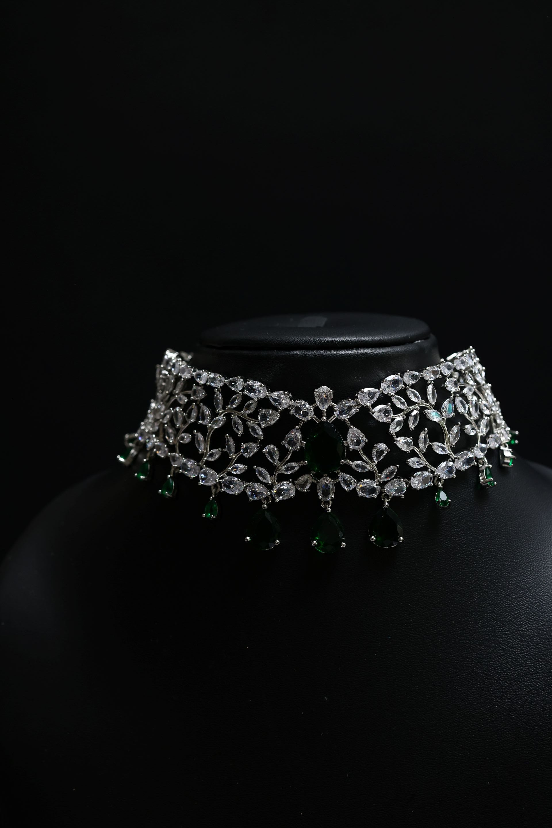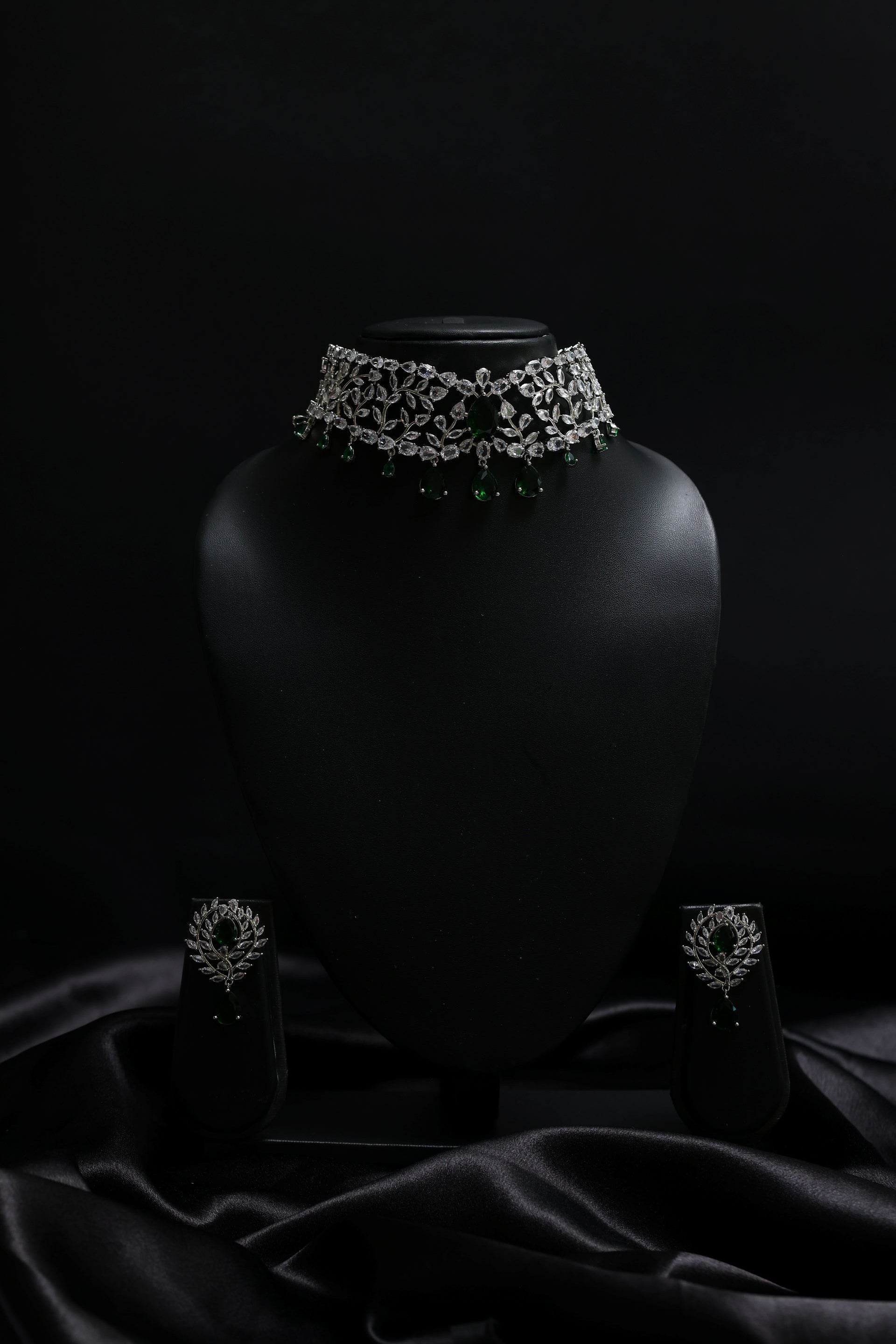 The design features an intricate lattice of marquise and round AAA+ Cubic Zirconia shaped into elegant floral clusters. From the base of the choker, delicate emerald-green crystal droplets hang gracefully, adding fluidity, depth, and a rich jewel-toned glow. The statement earrings mirror this unique combination of floral sparkle and emerald dewdrops, completing the look with stunning symmetry.