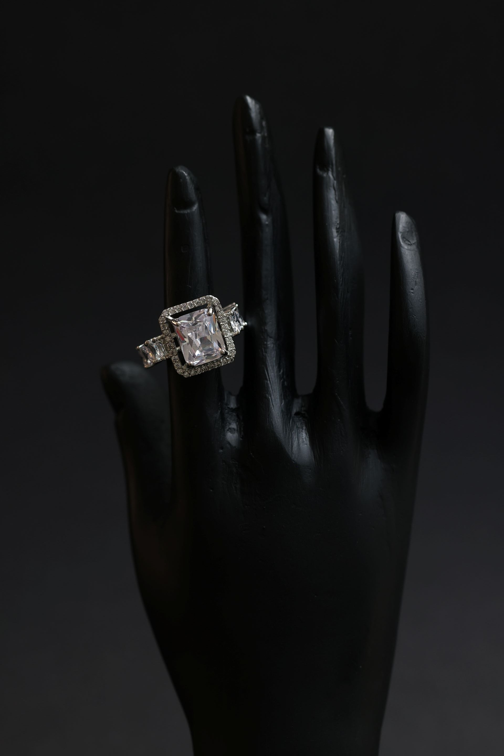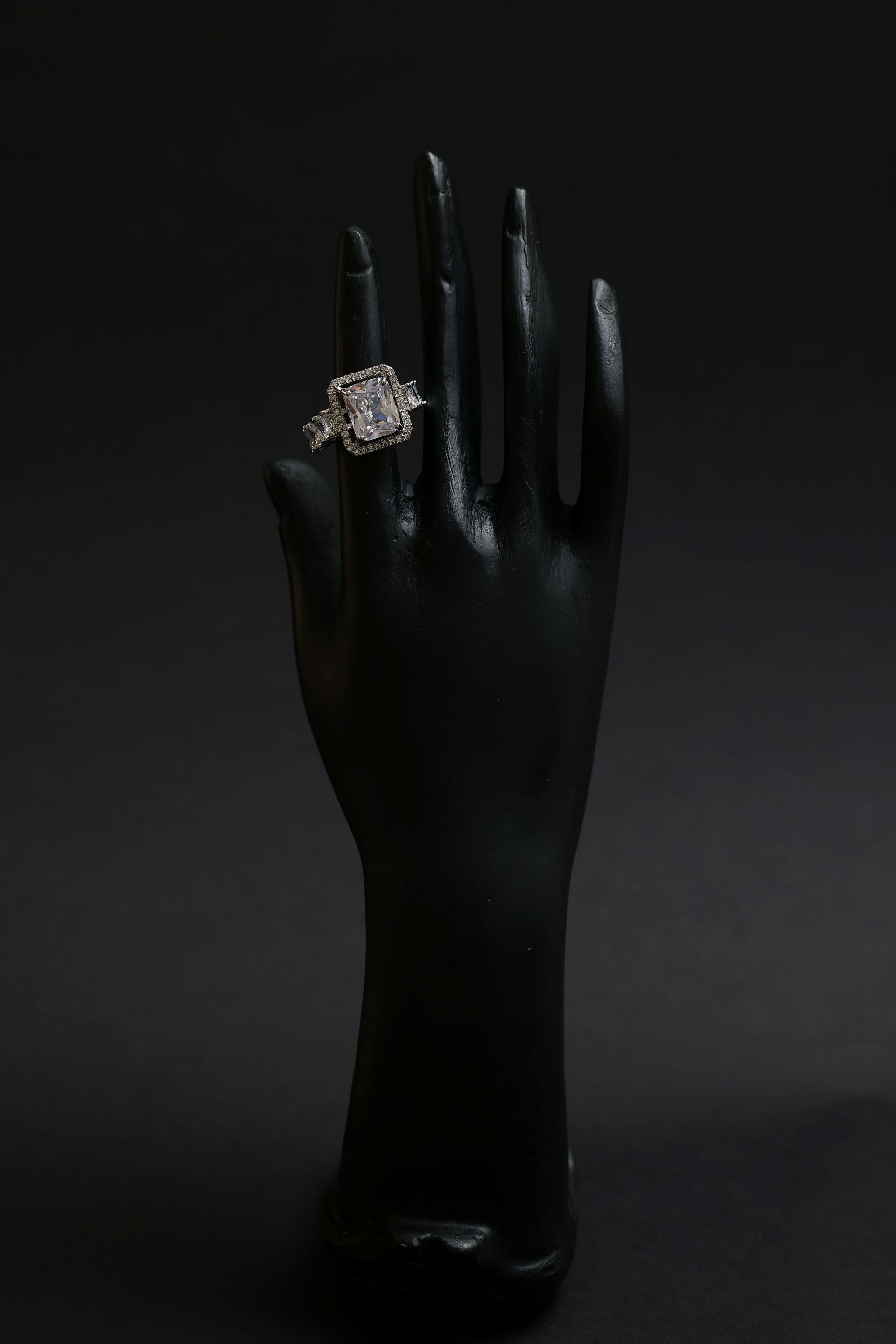 With its clean lines, striking geometry, and high-sparkle presence, this ring is perfect for cocktail evenings, engagement-inspired styling, festive celebrations, or luxurious daily wear. The refined silver-toned rhodium finish ensures durability and long-lasting brilliance, making it a timeless statement piece for every collection.