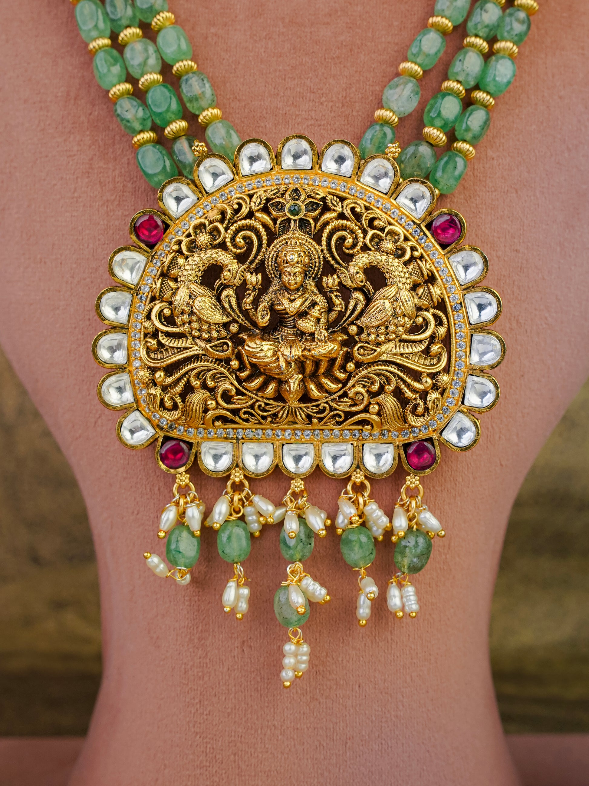 • The Pendant: At the heart of this set lies a grand, semi-circular pendant featuring a meticulously carved Goddess Lakshmi seated on a lotus, flanked by two peacocks—symbols of beauty and royalty.