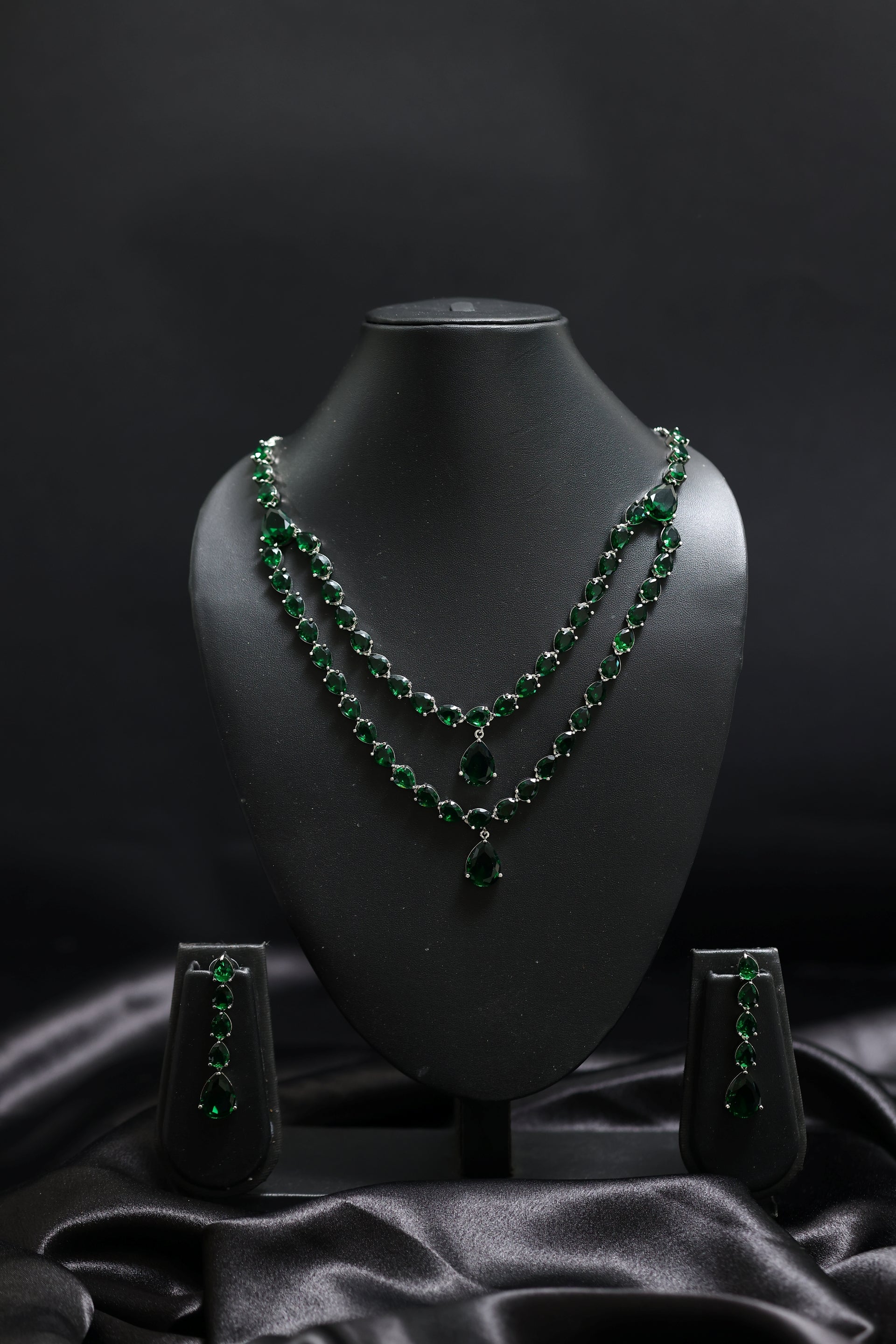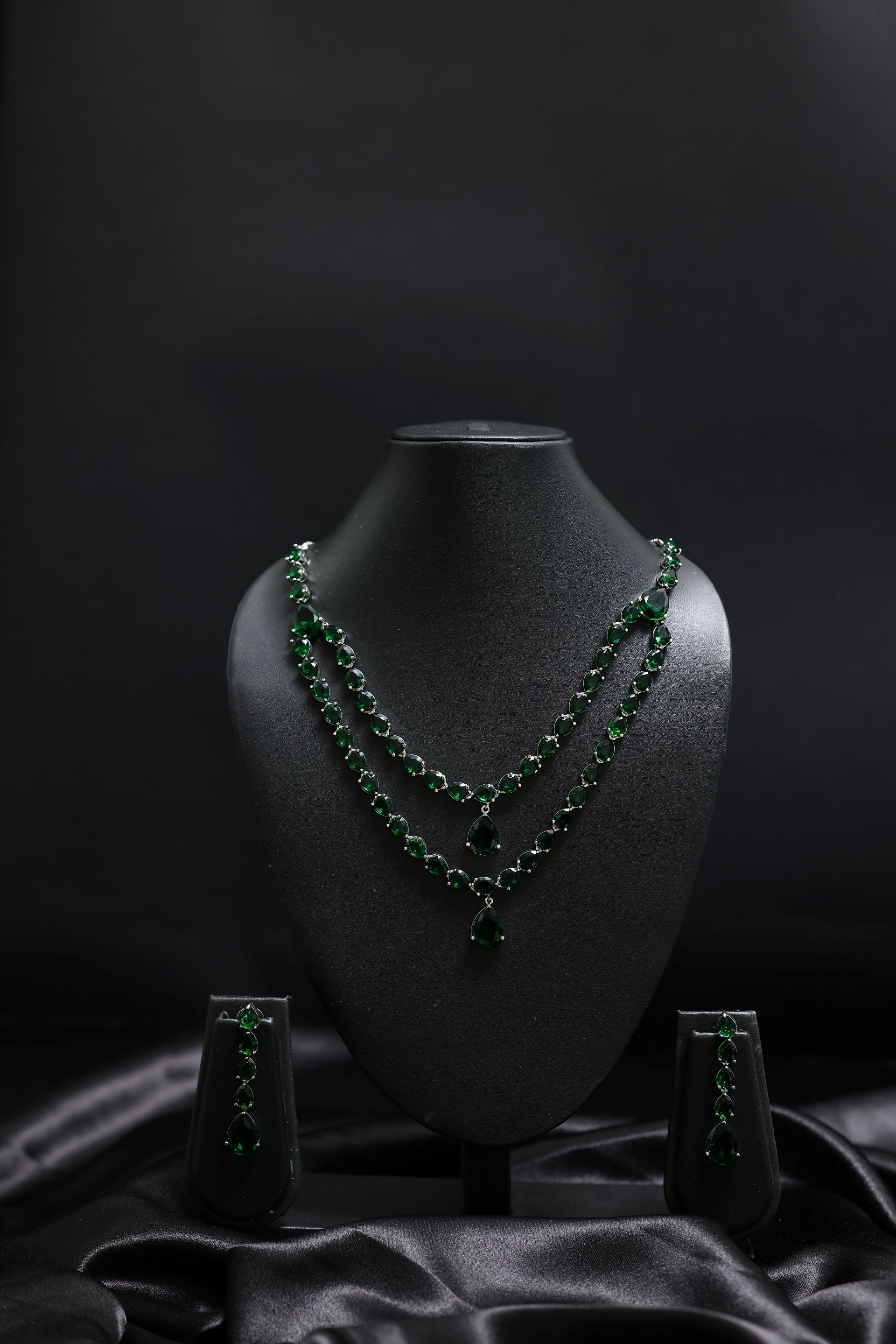 The necklace features two cascading layers of deep emerald-green crystals—each stone impeccably faceted to reflect a rich, jewel-toned luminosity. The teardrop centerpiece gracefully anchors the design, adding movement, depth, and timeless sophistication. Paired with long, matching drop earrings crafted in a seamless gradient of emerald crystals, the set creates a statement that is bold yet breathtakingly graceful.