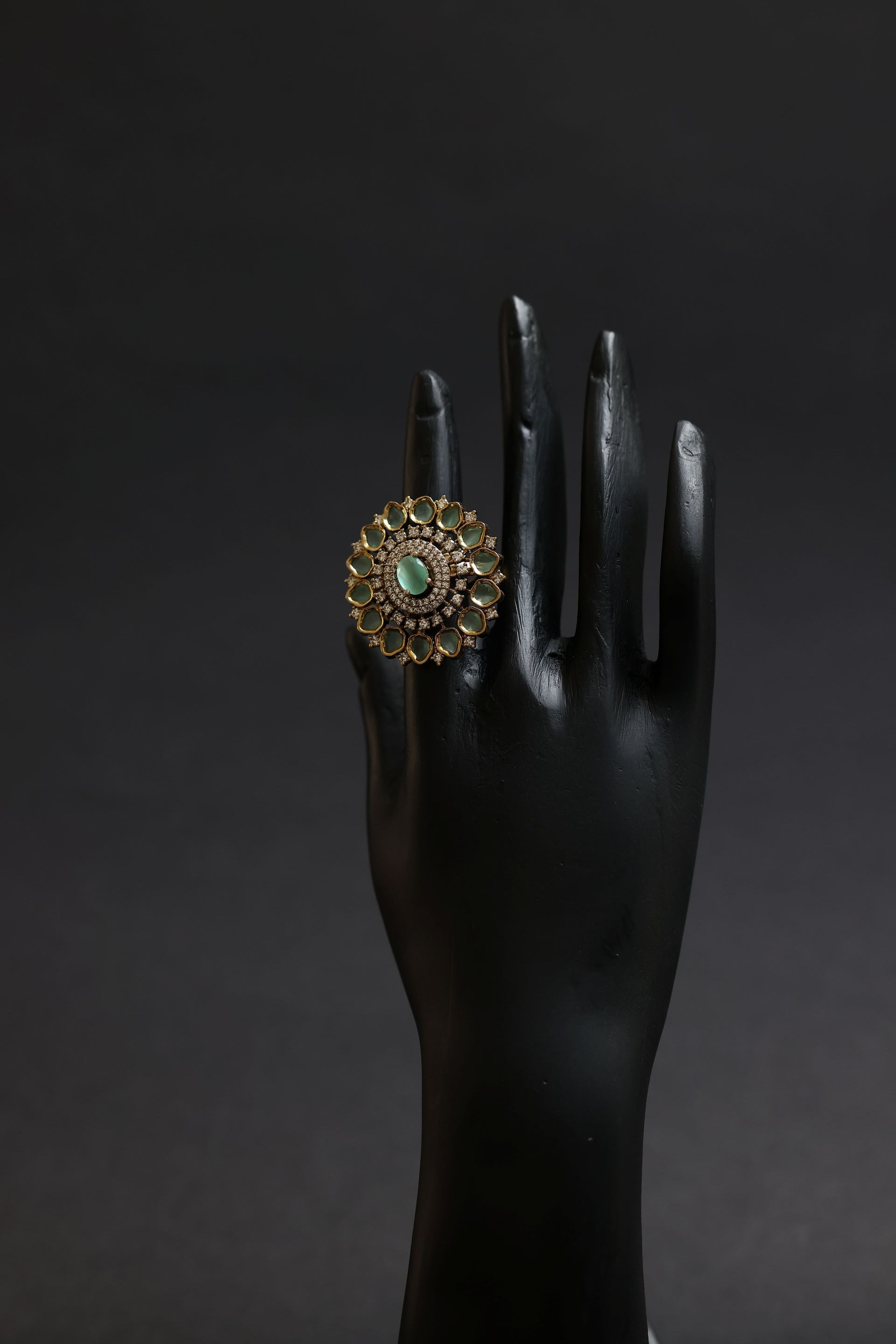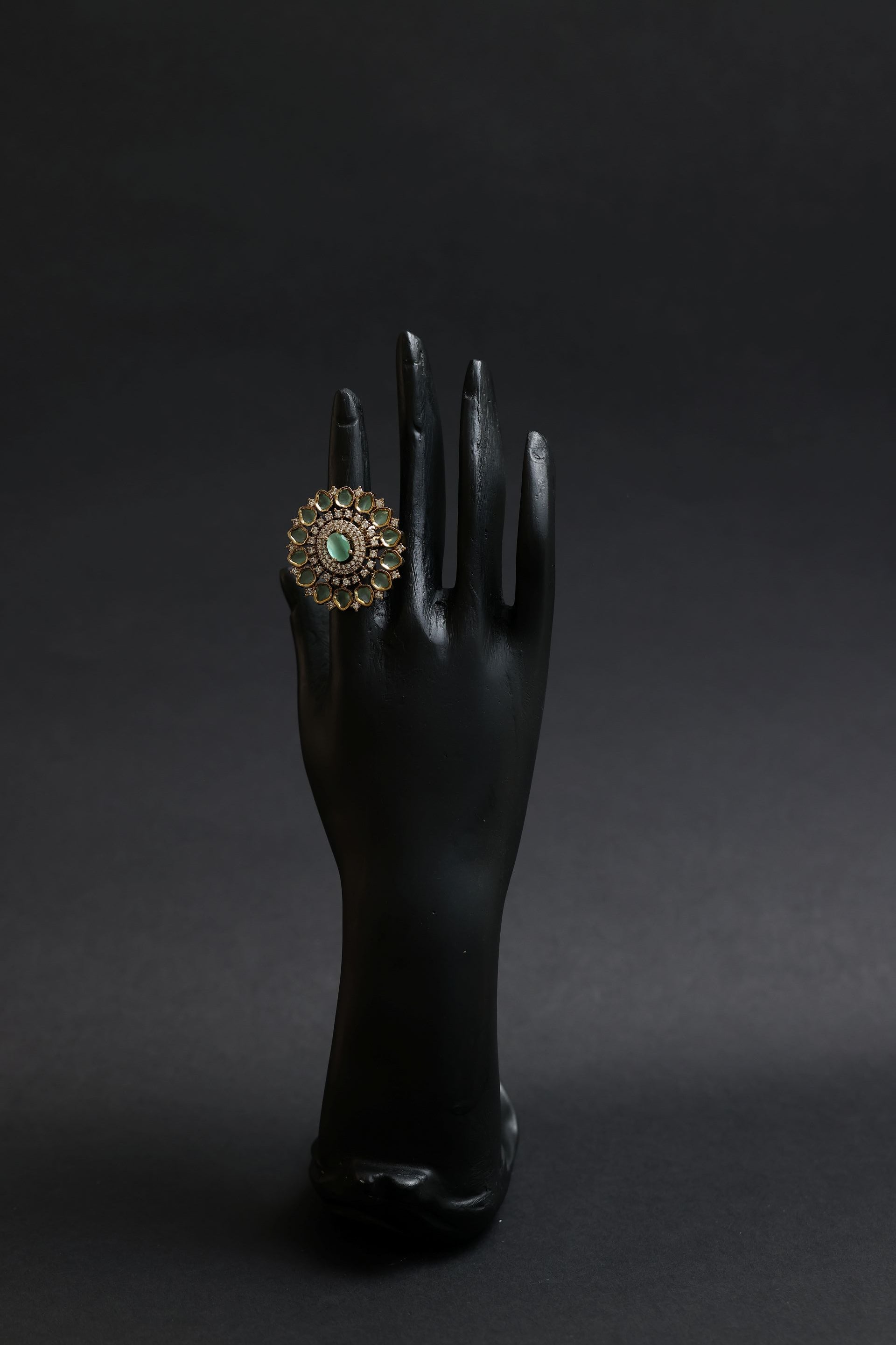 Base Metal: Premium Brass Polish: Rhodium Polish Stones: Emerald-Toned Crystal Center · Teardrop Green Stones · AAA+ Quality Cubic Zirconia Design: Floral Halo Motif · Dual Micro-Pavé CZ Layers · Teardrop Petal Border Ring Type: Adjustable Statement Ring Occasion: Bridal · Festive · Cocktail · Party Wear · Traditional & Heritage Styling