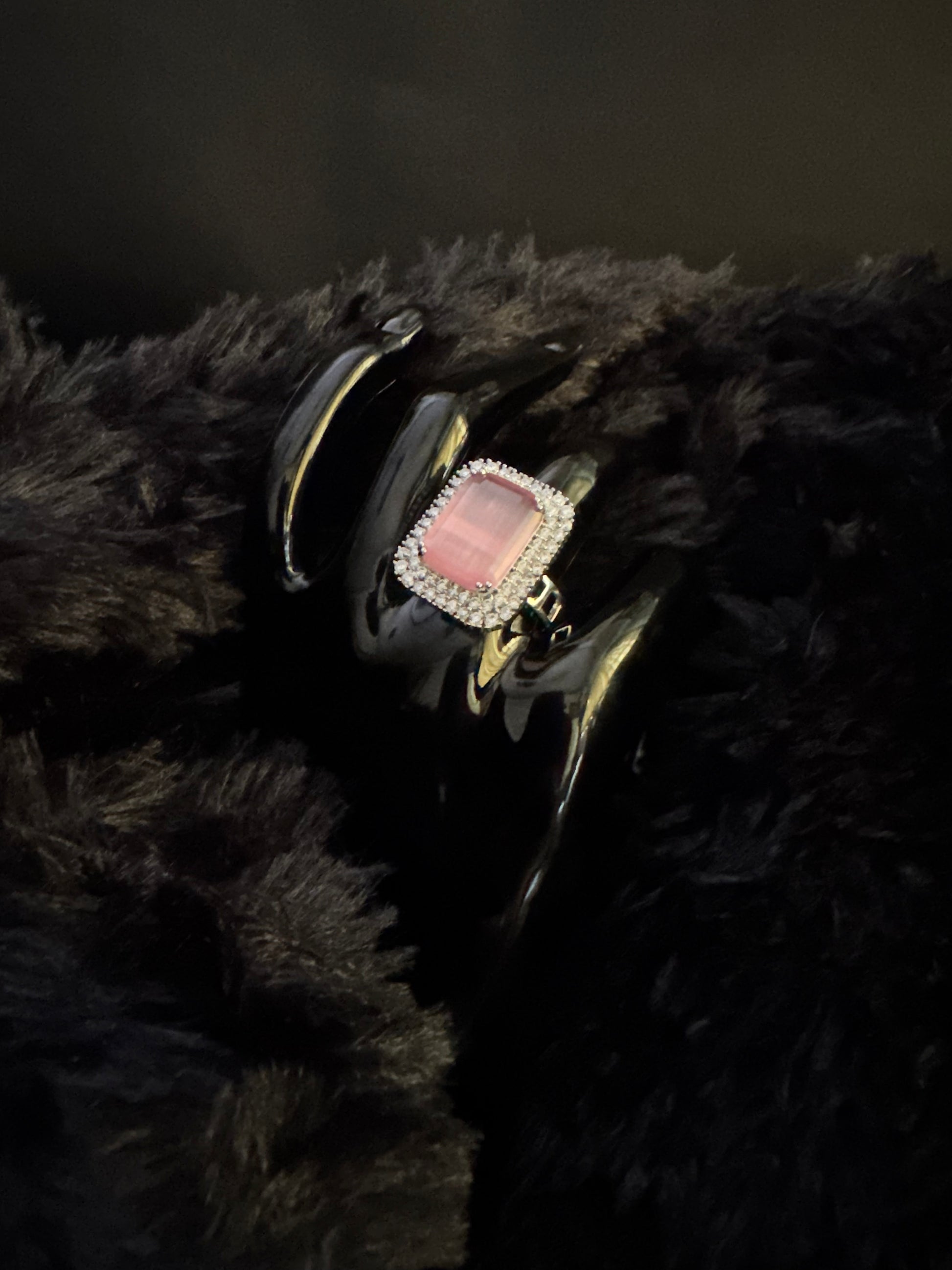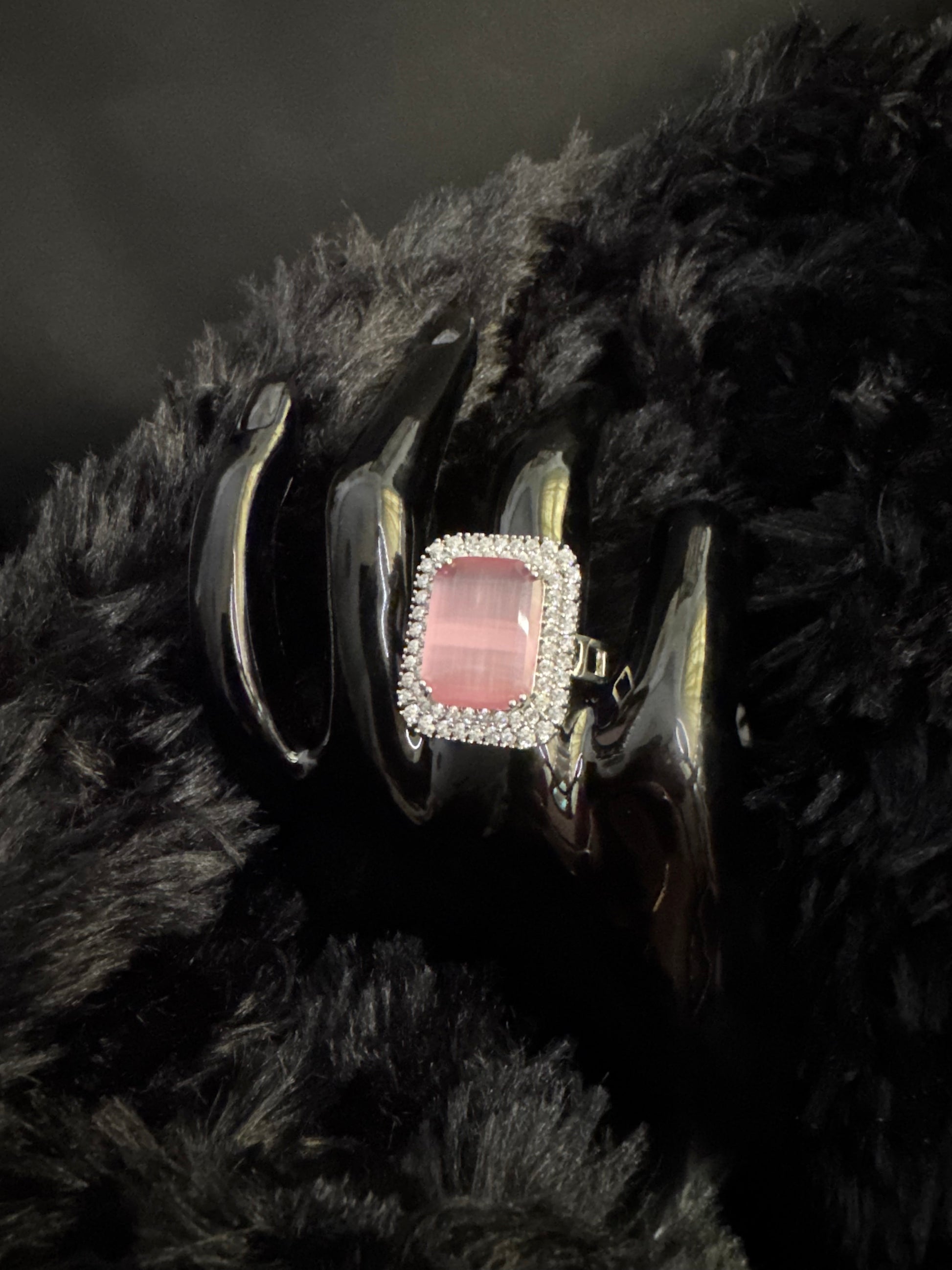 At its center rests a stunning blush-pink cat-eye stone, cut into a refined cushion silhouette that glows with ethereal luminosity. The solitaire is framed by a halo of premium AAA+ quality Cubic Zirconia, enhancing its brilliance and adding a refined touch of sparkle. The clean, minimal yet sophisticated design makes it a versatile masterpiece suitable for every cherished moment.