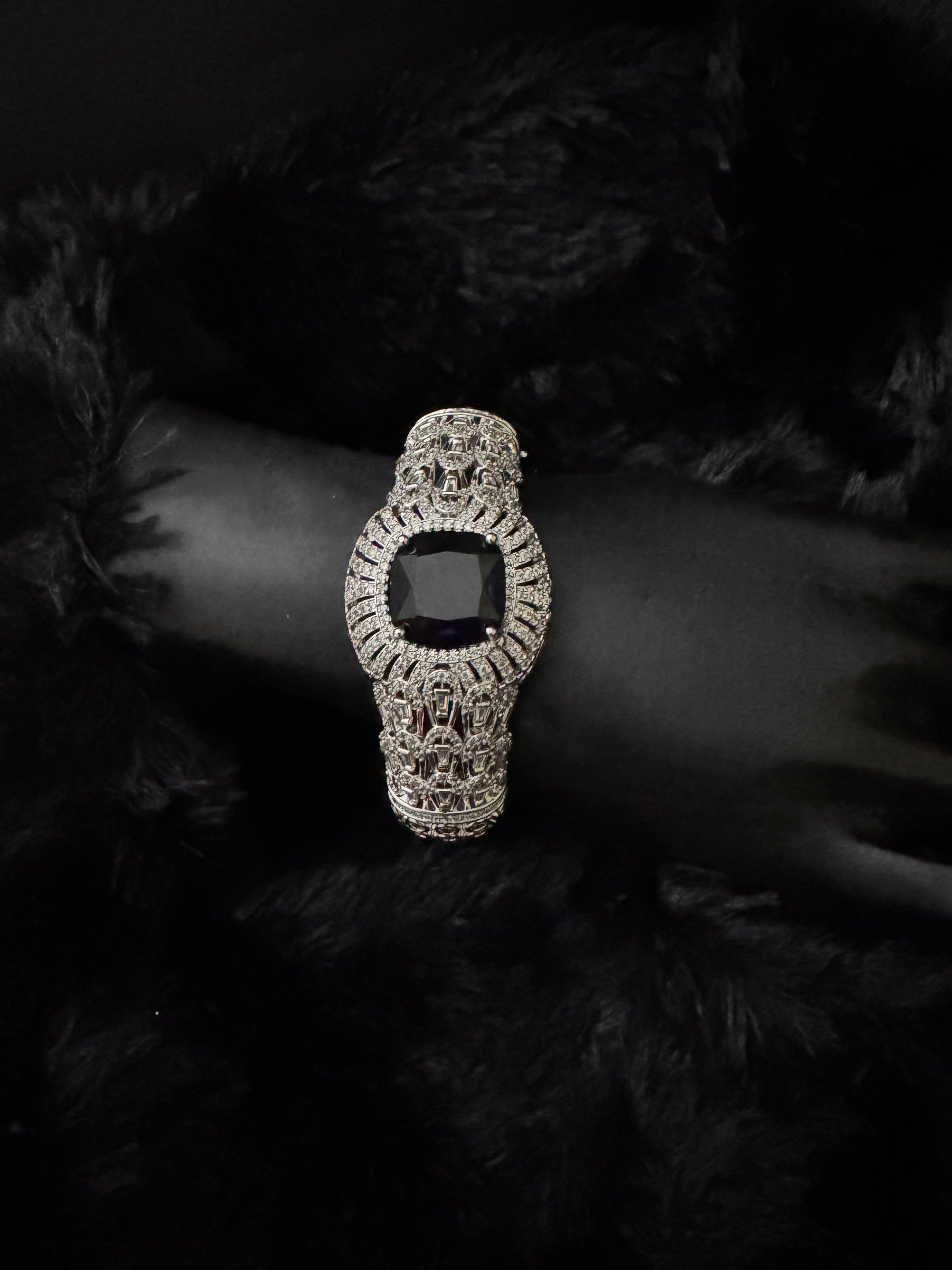 The Noir Empress Majesty Cuff is a dramatic masterpiece crafted for women who embrace powerful, high-fashion luxury. Designed in premium brass and finished with a gleaming rhodium-polished silver coating, this bracelet features an extraordinary fusion of sculpted artistry and bold gemstone elegance.
