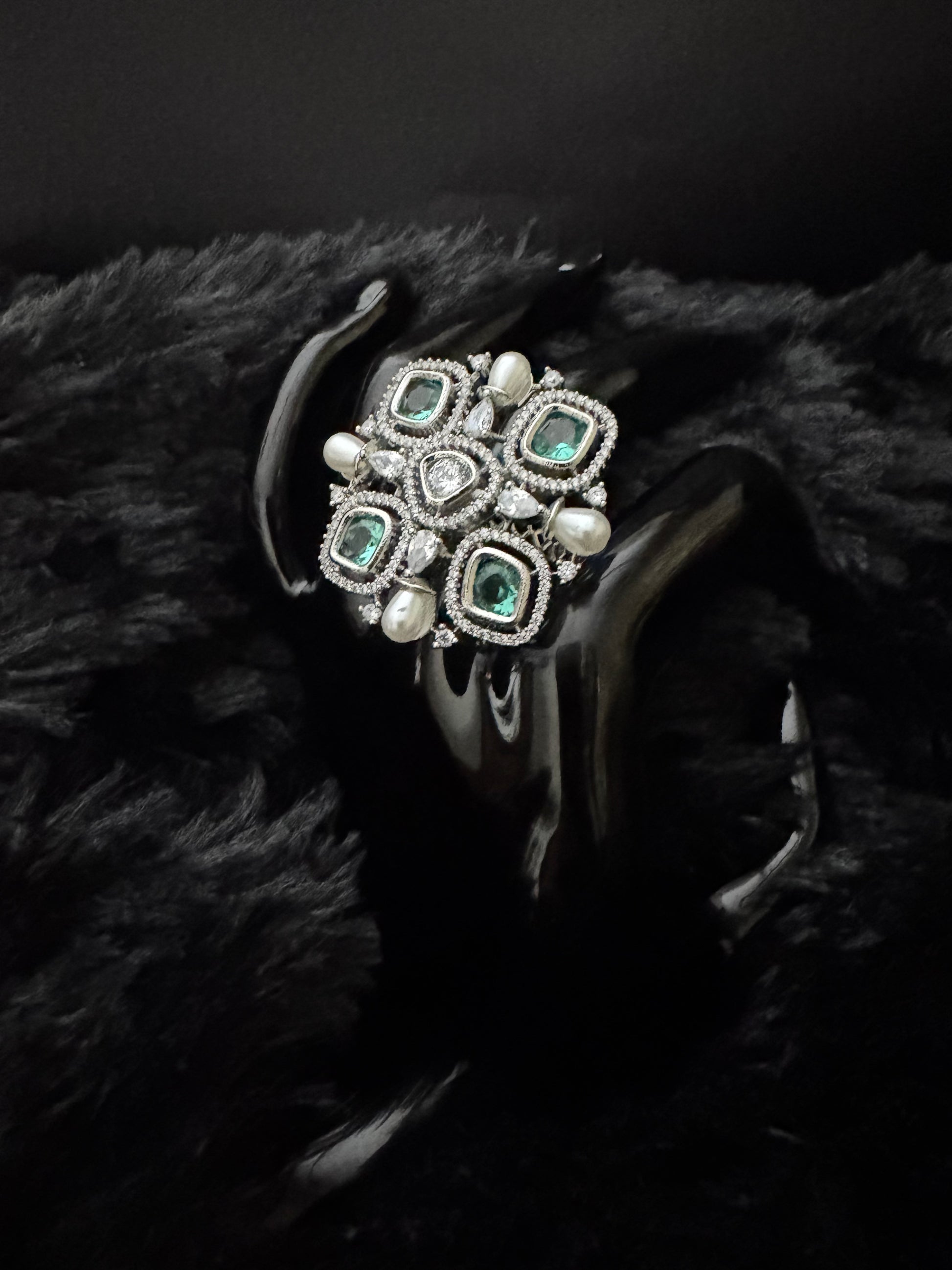 The Emerald Regal Royale Cocktail Ring is an exquisite blend of royal charm and contemporary craftsmanship. Designed to make an instant statement, this masterpiece is crafted in premium brass and finished with a luxurious rhodium-polished silver shine that enhances its brilliance.