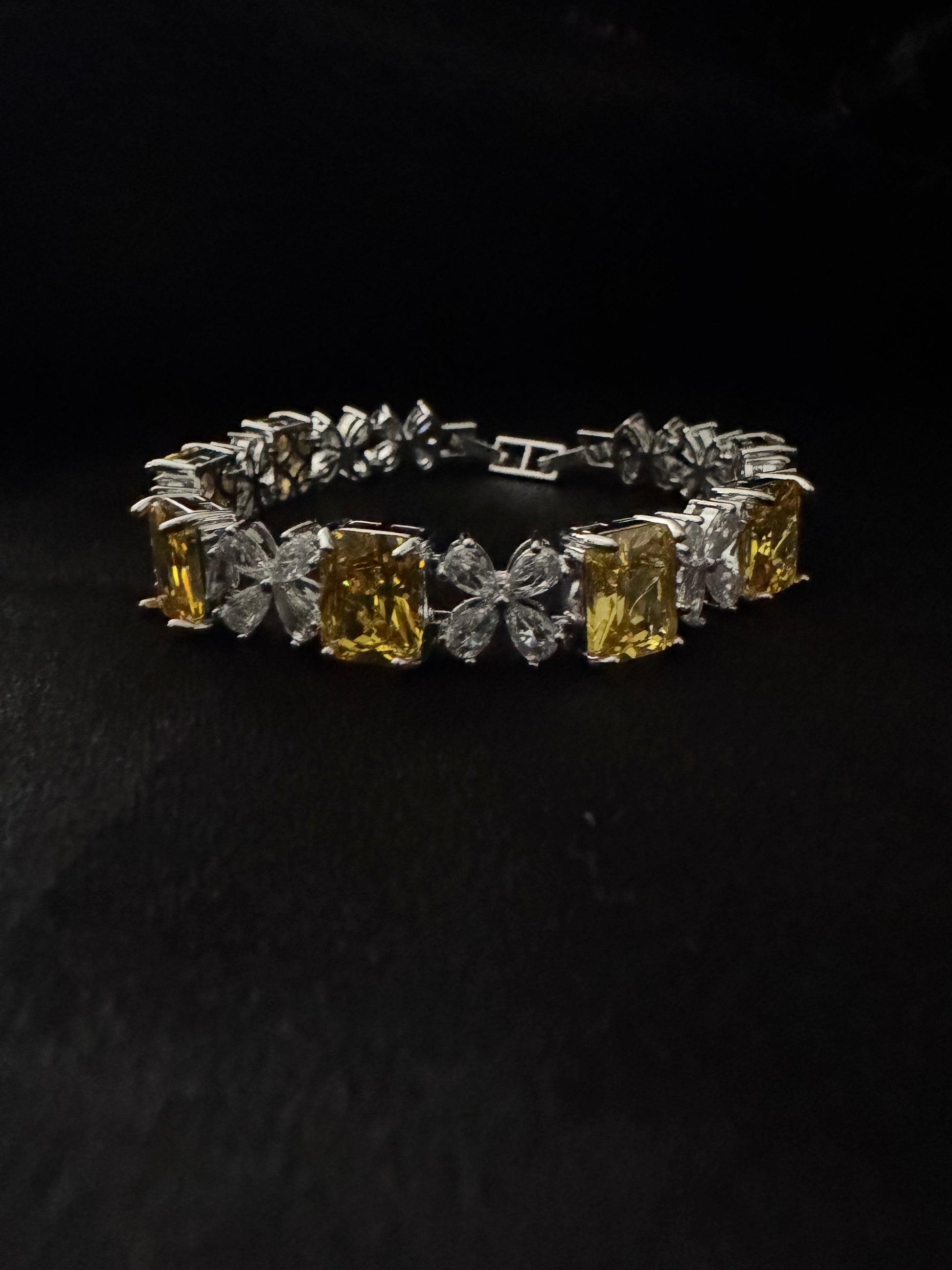The Lumiére Cluster Chain Bracelet is a sophisticated blend of modern styling and timeless sparkle. Crafted in premium brass and finished with a luxe rhodium-polished gold plating, this bracelet features a series of beautifully arranged premium AAA+ quality Cubic Zirconia stones in champagne and yellow tones. Each stone is meticulously hand-set, allowing the bracelet to shimmer gracefully with every movement. Its elegant chain-linked design offers a lightweight feel while maintaining a luxurious presence on the wrist. Perfect for refined everyday wear or adding a subtle glow to evening looks, it is a versatile piece for every jewellery lover.