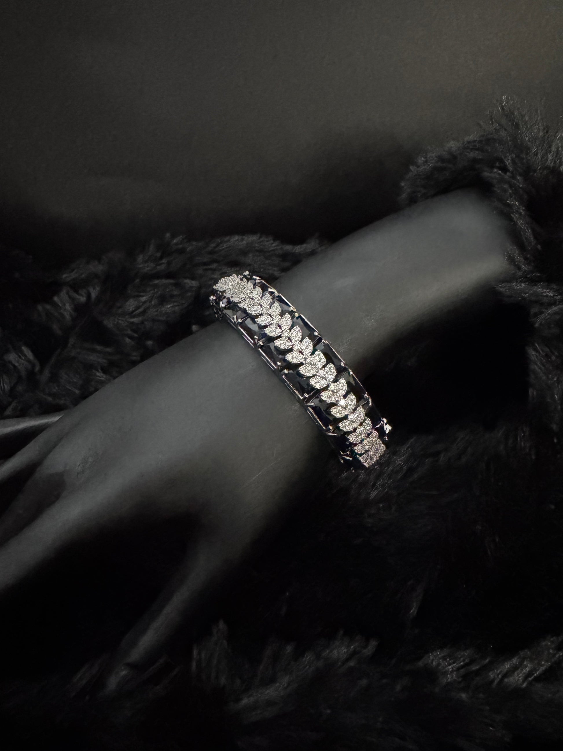 The bracelet features a sophisticated dual-band structure, with an intricate leaf-inspired CZ arrangement set along the center. Each AAA+ quality Cubic Zirconia stone is hand-set to reflect maximum sparkle, creating a seamless blend of elegance and statement glamour. The sleek, slender silhouette makes it an effortlessly wearable piece while still delivering high-impact shine.