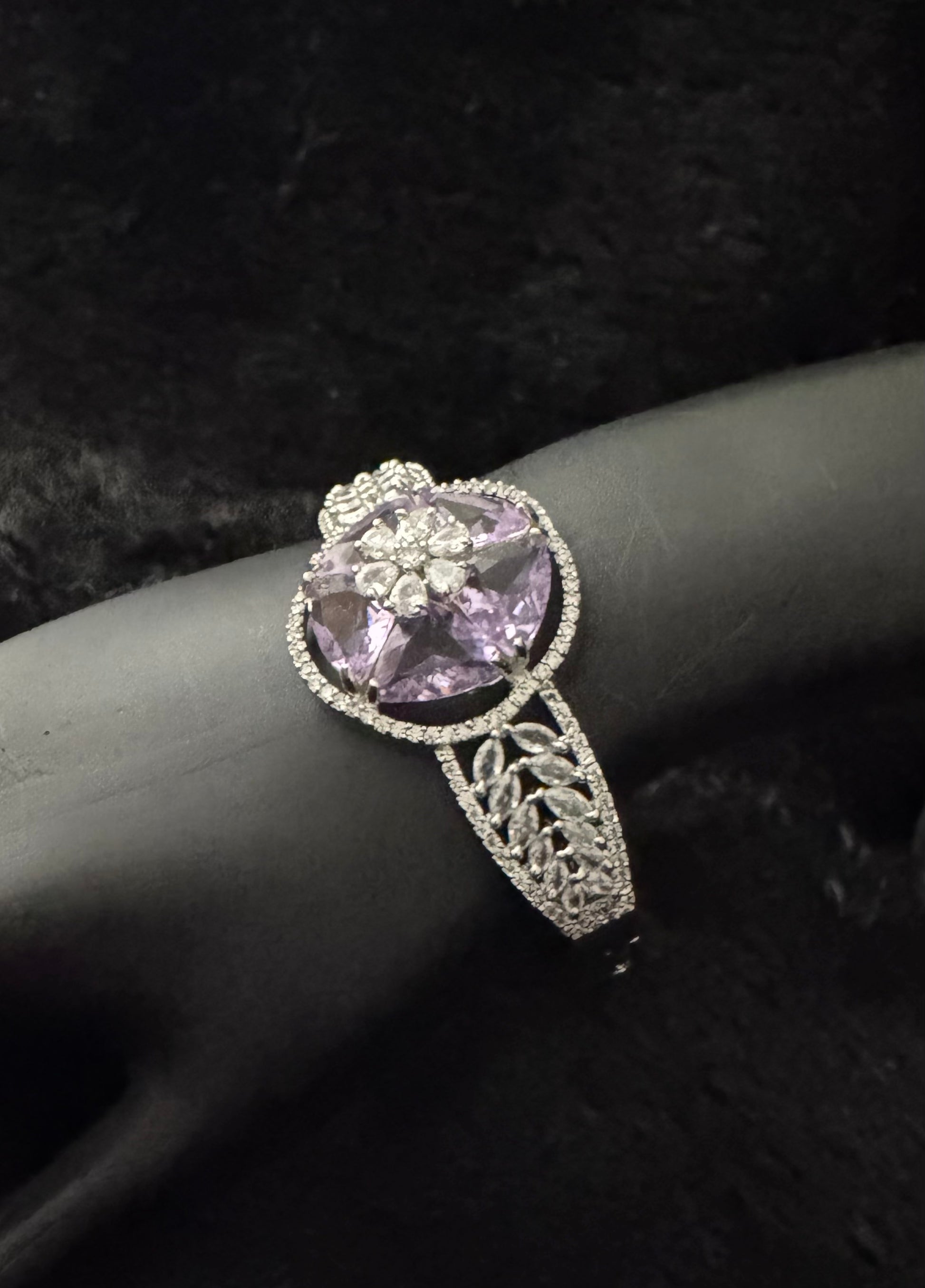 The Amethyst Bloom Radiant Cuff Bracelet is a statement piece that celebrates refined elegance and artistic detailing. Handcrafted in premium brass and finished with a luxe rhodium-polished silver plating, this bracelet showcases a captivating amethyst-hued centerpiece, framed with intricate stonework. Studded with premium AAA+ quality Cubic Zirconia, each crystal is precision-cut to enhance brilliance, adding a soft, luminous sparkle to the bold floral design. The open-cuff silhouette offers a comfortable fit while giving the piece a sophisticated, high-fashion appeal. Perfect for soirées, festive occasions, and elegant evening wear, this bracelet adds an unforgettable touch of glamour to any ensemble.
