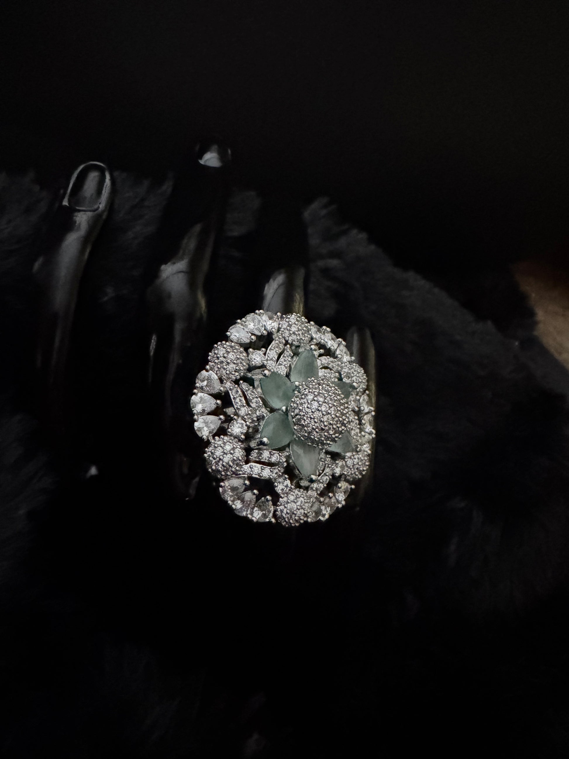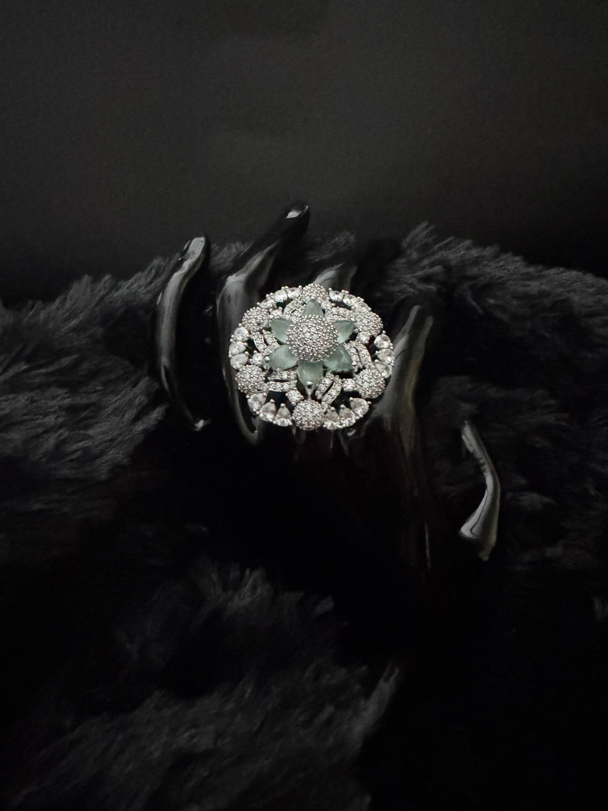 Specifications Base Metal: Premium Brass Polish: Rhodium-finished Silver Stones: AAA+ Quality Cubic Zirconia & Emerald-Tone CZ Center Stone Design: Floral Halo • Intricate Lattice Work • Regal Statement Profile Band: Adjustable Comfort Fit Occasion: Bridal · Festive · Cocktail · Red Carpet