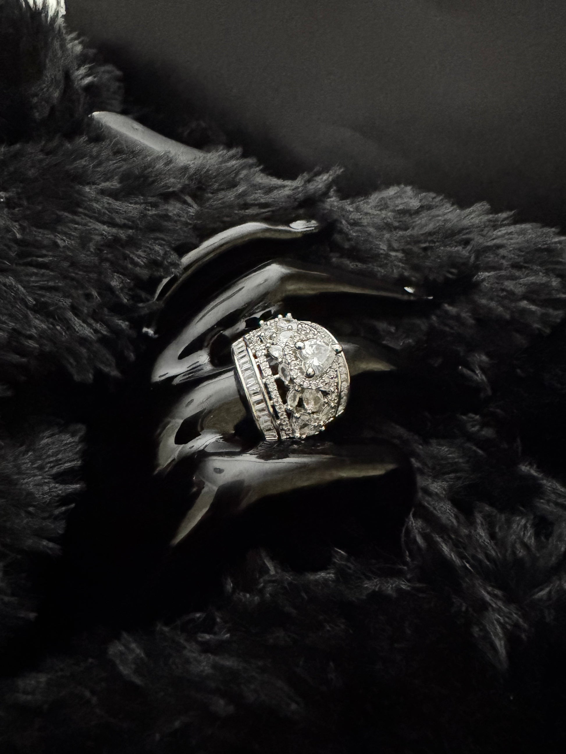 Its majestic dome silhouette is adorned with layers of AAA+ quality Cubic Zirconia, arranged in intricate concentric patterns that radiate like a crown of pure brilliance. The multi-band architectural design adds depth, volume, and a luxurious vintage charm, making this piece a true symbol of regality.
