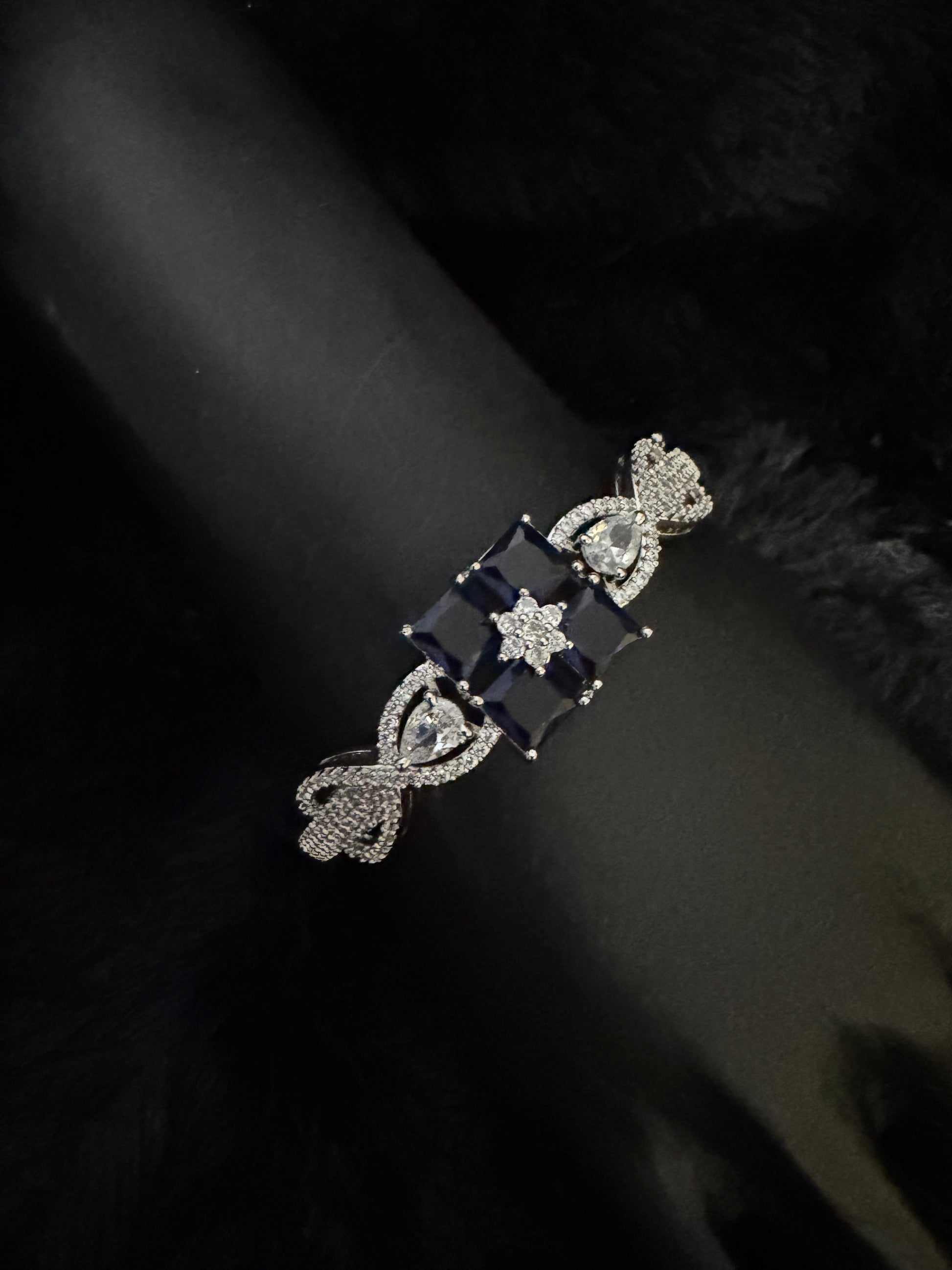 The centerpiece features four deep midnight-blue princess-cut stones, arranged in a regal cluster and accented with a shimmering CZ floral motif. Surrounding this central composition are intricate loops of pavé-set premium AAA+ quality Cubic Zirconia, adding a flowing, high-jewellery finish to the design. Pear-cut CZ stones enhance the bracelet further, giving it depth, symmetry, and an undeniable red-carpet charm.