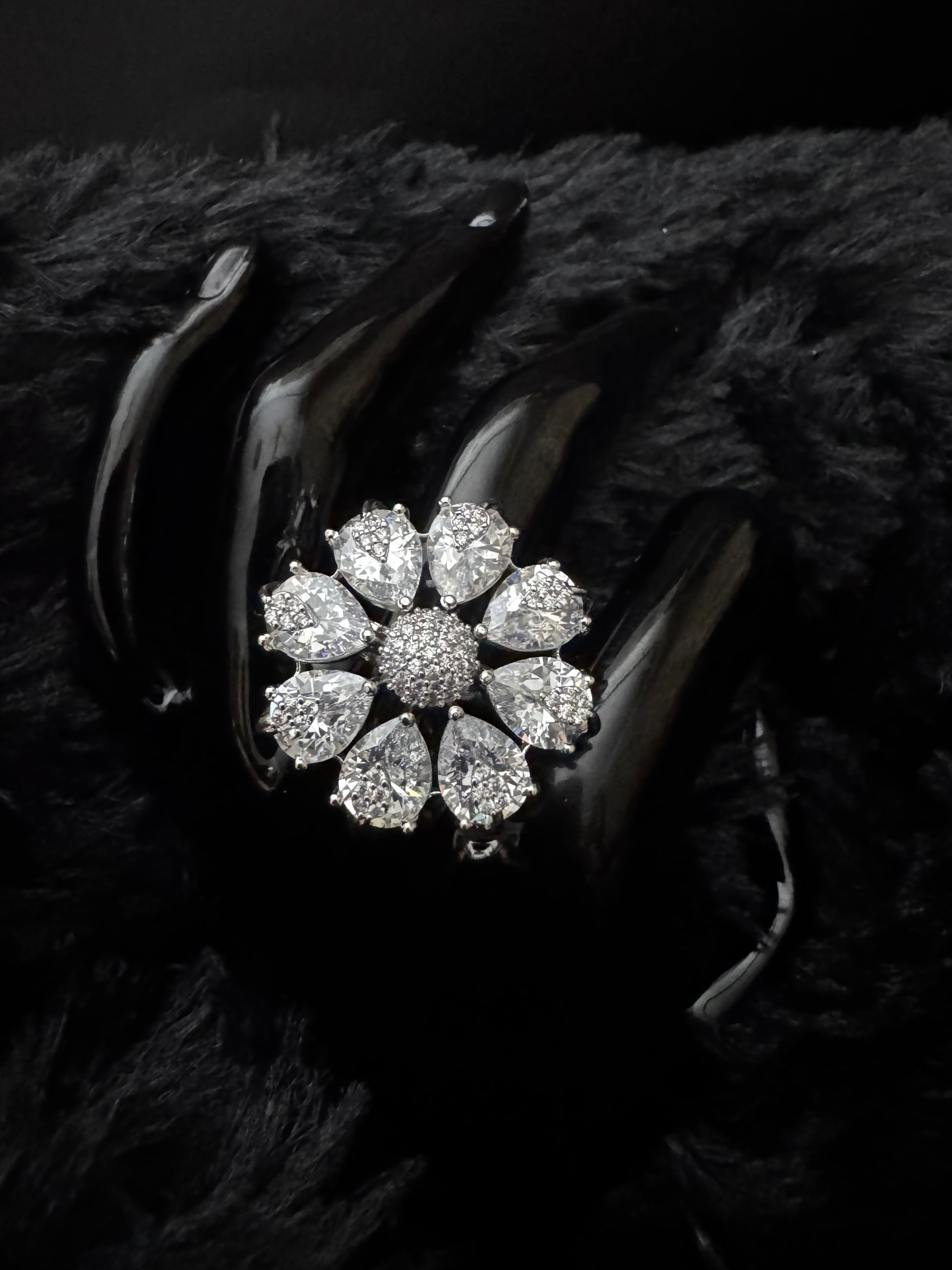 The ring features an exquisite floral silhouette formed with meticulously cut AAA+ quality Cubic Zirconia, arranged in petal-like clusters that radiate from the centre like a blooming diamond flower. Each stone reflects light with unmatched clarity, creating a dazzling brilliance that elevates any ensemble from ordinary to unforgettable.
