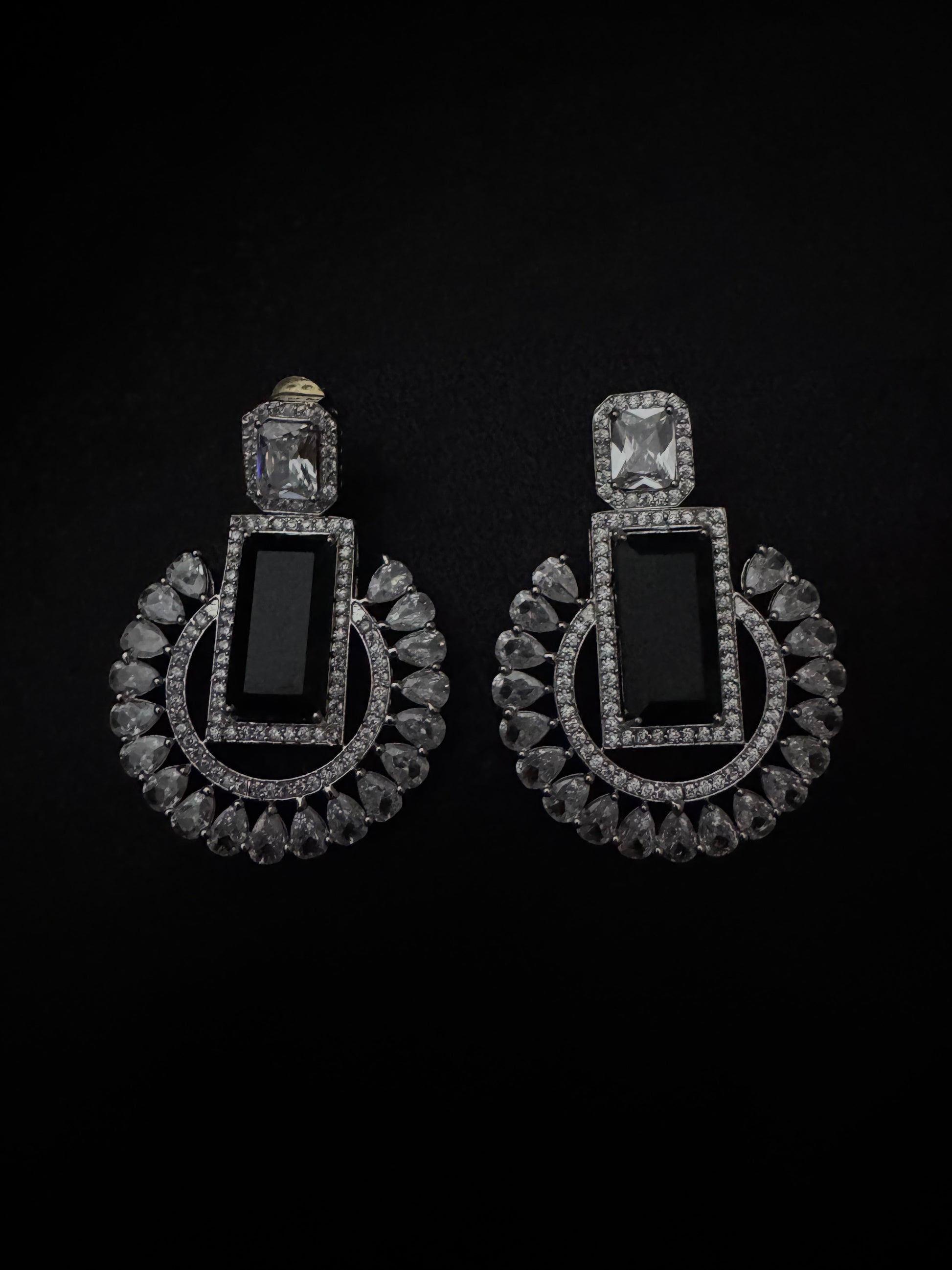 The Noir Radiance Halo Statement Earrings are crafted for those who embrace bold glamour with refined sophistication. Made from premium brass and finished with an elegant rhodium-polished silver plating, these earrings feature striking black rectangular stones framed with intricate halos of premium AAA+ quality Cubic Zirconia. The concentric circular design is embellished with shimmering teardrop CZ stones, creating a breathtaking halo effect that catches the light with every movement. Finished with a brilliant crystal-cut top stud, this pair blends modern geometry with luxurious sparkle. Perfect for evening galas, cocktail nights, festive celebrations, and standout fashion moments.