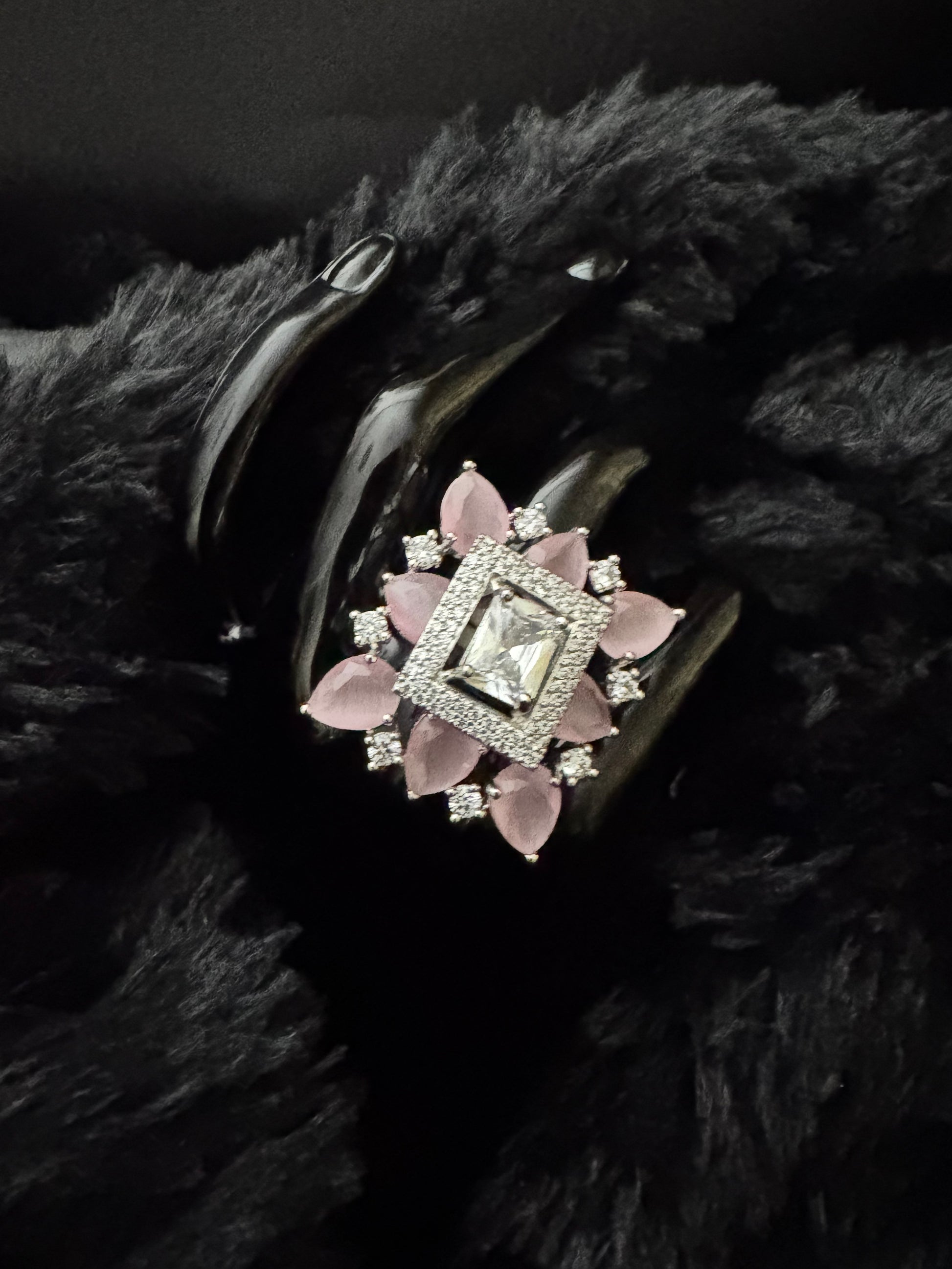 At its centre sits a radiant, emerald-cut clear CZ stone framed by a halo of micro-pavé AAA+ quality Cubic Zirconia. Surrounding it is a blooming arrangement of soft blush-pink pear-cut stones, forming a floral-inspired silhouette that exudes grandeur and charm. Every facet of this design glimmers with high sparkle, making the ring a true masterpiece of modern luxury.