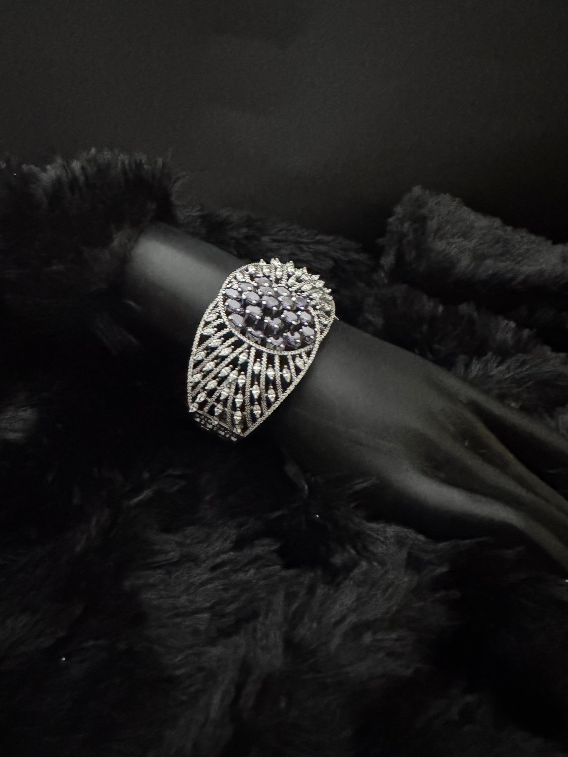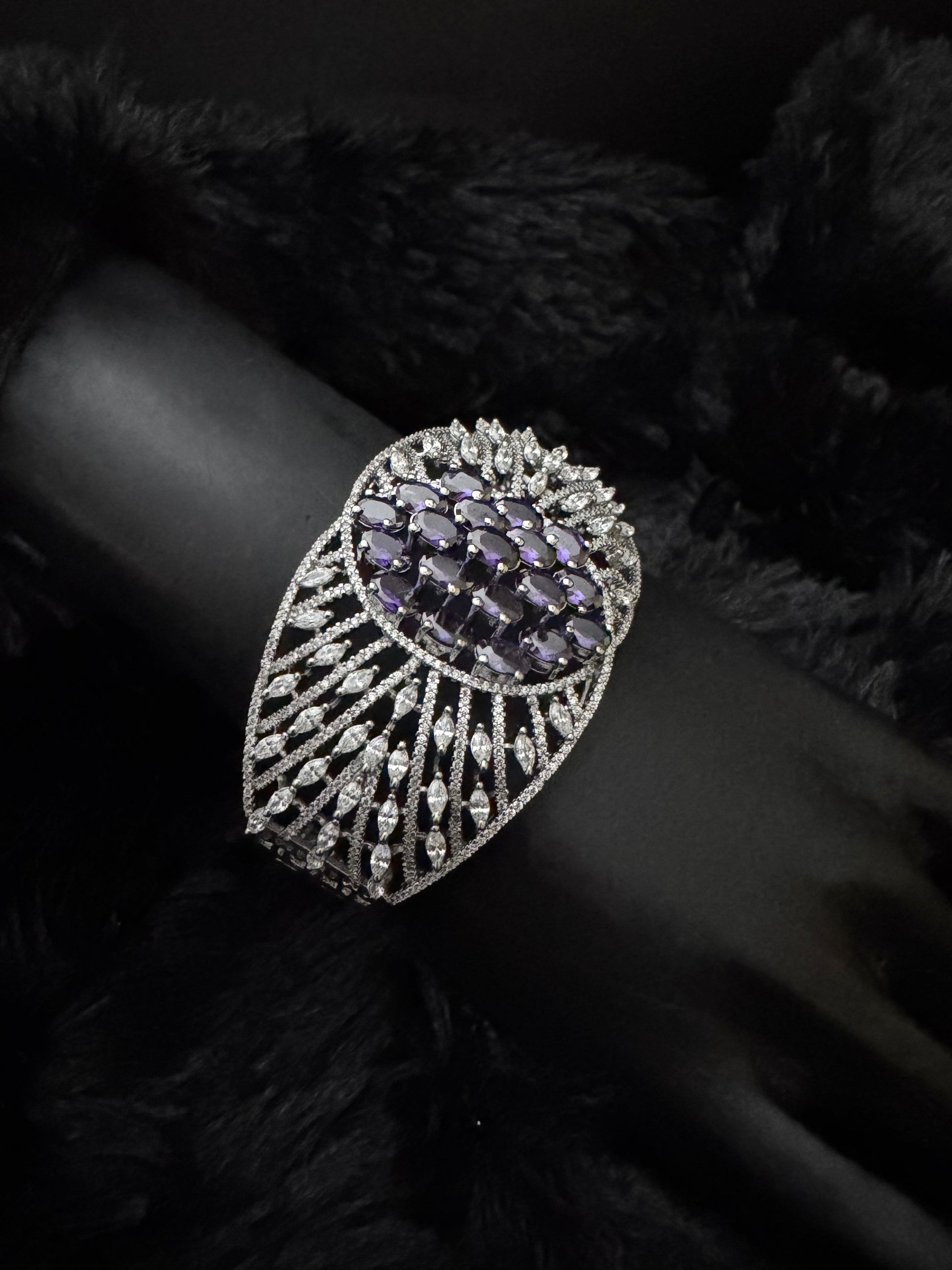 The centerpiece features a stunning cluster of oval-cut amethyst-toned stones, arranged in a galaxy-like formation that radiates hypnotic depth and brilliance. Surrounding this is an elaborate burst of premium AAA+ quality Cubic Zirconia, forming an intricate openwork design that wraps gracefully around the wrist like a jeweled constellation.