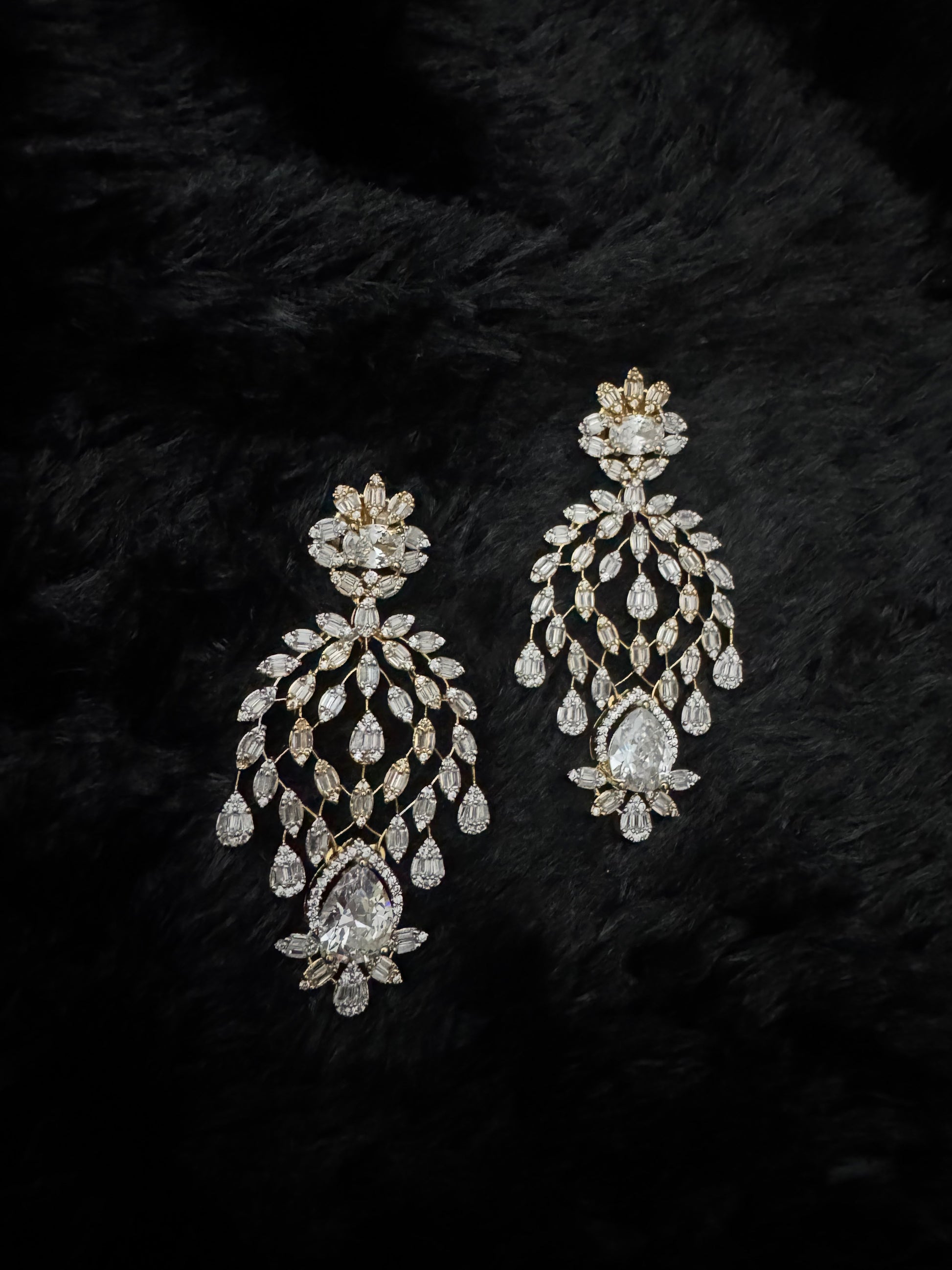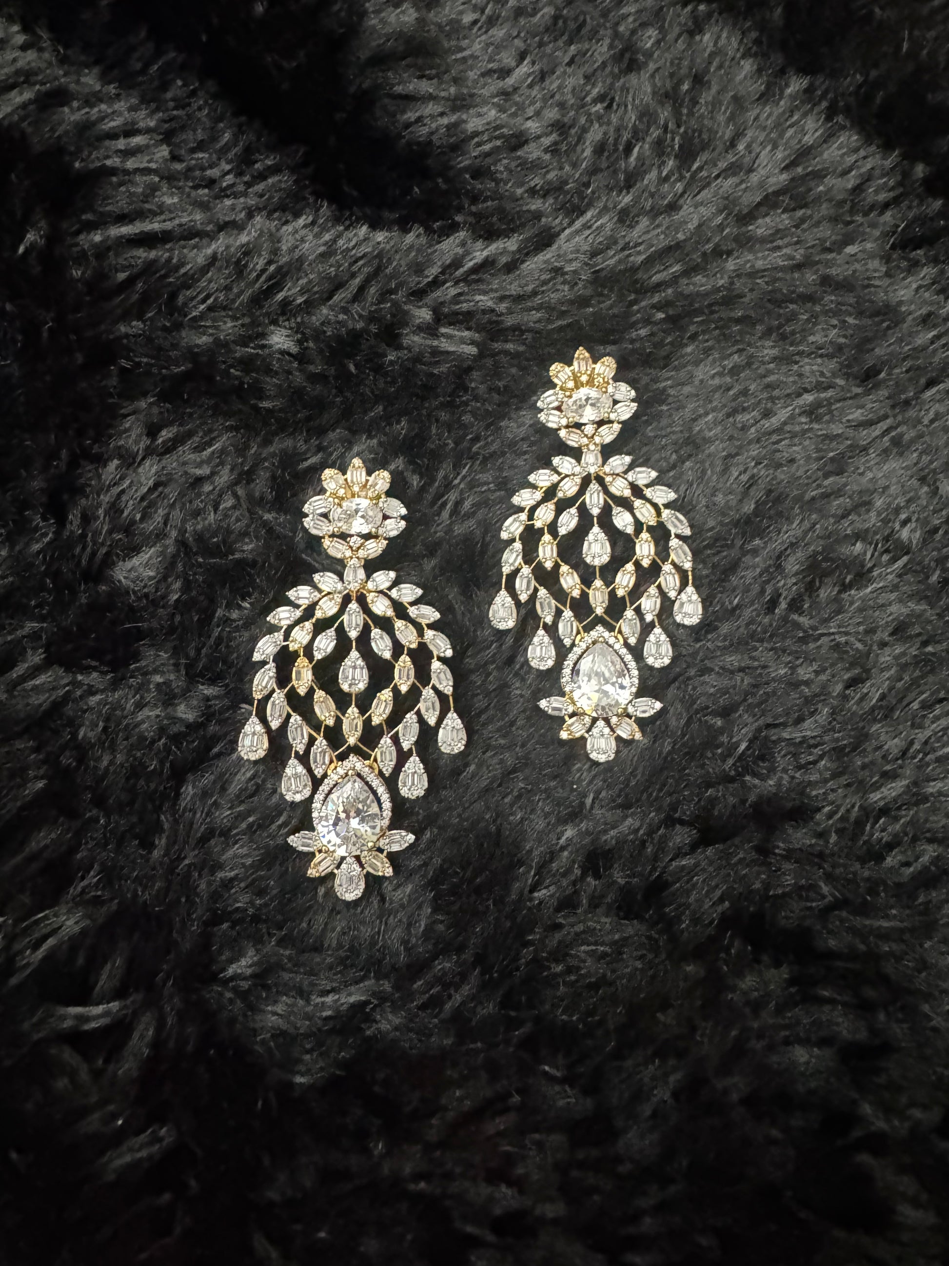 The Crystal Aureté Royale Chandelier Earrings are a masterpiece of refined luxury and intricate craftsmanship. Handcrafted in premium brass and finished with a radiant gold-polished, this pair features an ornate cascading silhouette studded entirely with premium AAA+ quality Cubic Zirconia. The design begins with a delicate floral cluster at the top, unfolding into beautifully arranged marquise and teardrop CZ strands that create a fluid chandelier effect. At the center of the composition rests a dazzling oversized pear-cut crystal, framed with pavé CZ halos for exceptional brilliance and depth. Elegant, graceful, and undeniably luxurious, these earrings are an enchanting choice for weddings, receptions, festive soirées, and glamorous evening occasions.