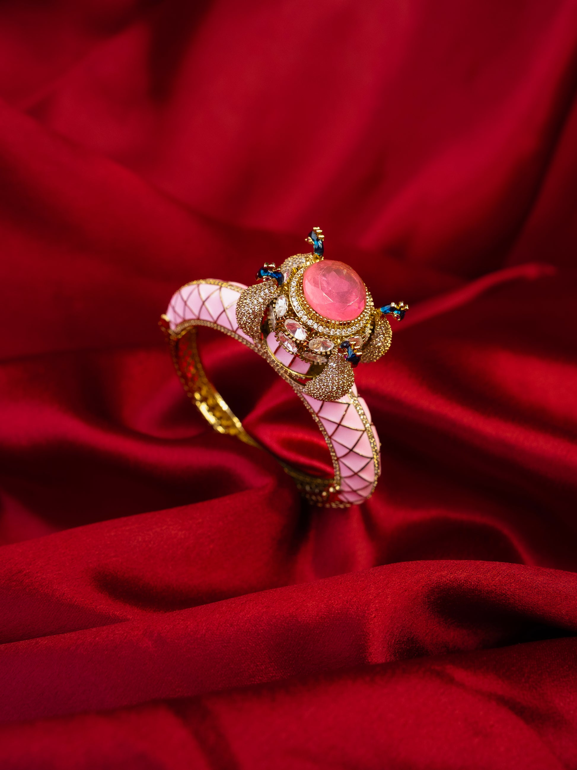 Stones Used Pink rose-tone stones, kundan-style glass stones, carved motifs, pearl clusters, pastel drop beads.