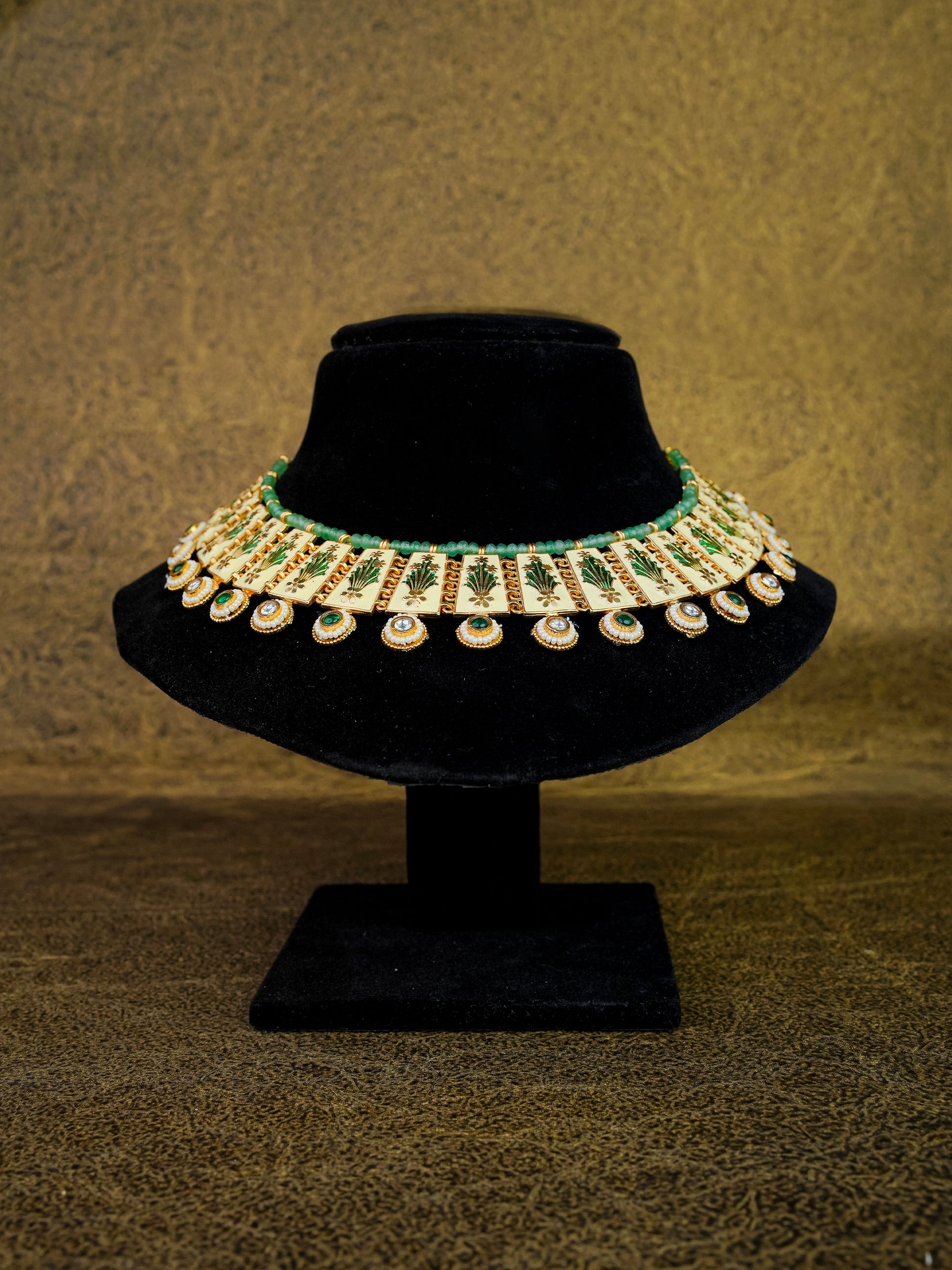 A refined blend of vintage artistry and contemporary elegance, the Haritima Enamel Heritage Choker Set is designed for those who appreciate detailed craftsmanship with a graceful finish. The choker features a structured sequence of rectangular enamel panels adorned with delicate green floral motifs, linked seamlessly to create a rich, symmetrical silhouette. Accented with kundan-style stones and subtle pearl detailing, the design is completed with a neat row of green beads along the neckline, adding balance and sophistication. Paired with matching statement earrings, this set is ideal for festive occasions, weddings, and elegant ethnic ensembles, offering a polished look without overpowering the attire.