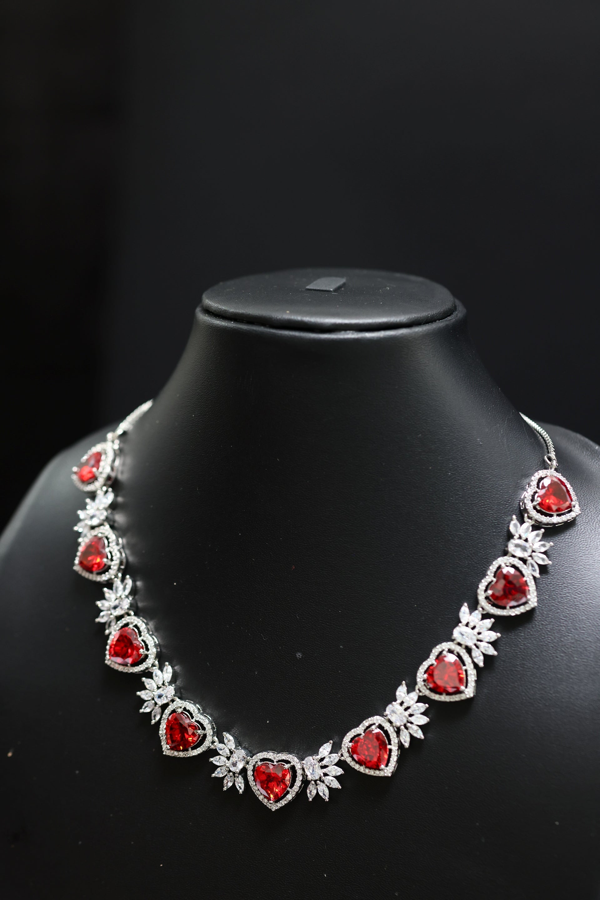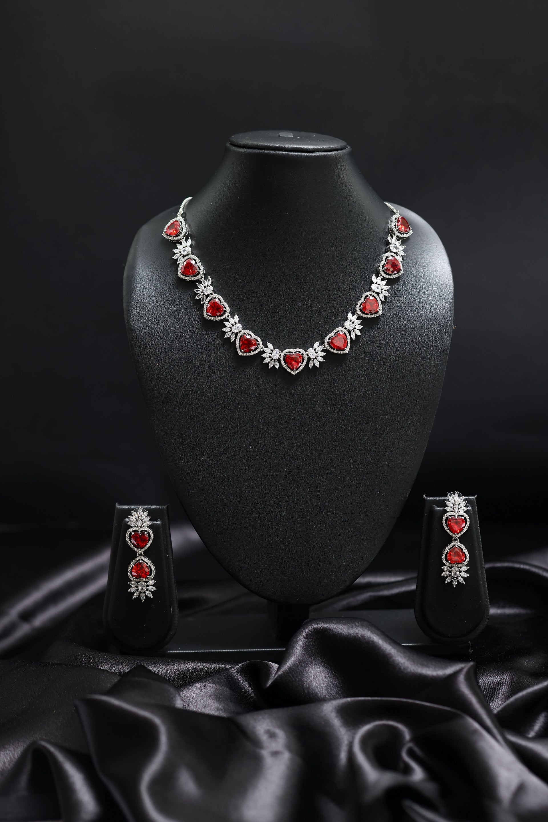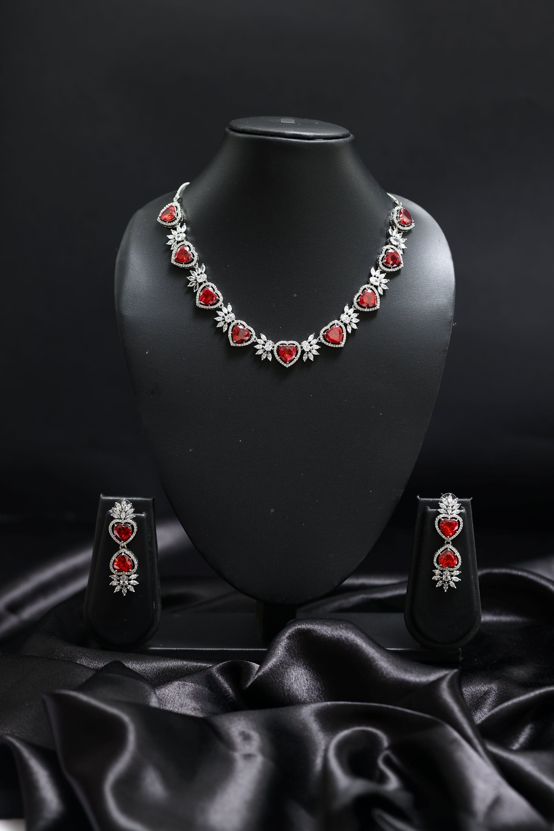 The necklace features vivid crimson heart-cut stones, each encased in a halo of shimmering AAA+ Cubic Zirconia that mirrors the luxury of high-grade diamonds. Delicately placed floral motifs add a regal charm, making the entire piece glow with a soft, feminine radiance. The matching long earrings echo the same dual-heart design, making the set a perfect blend of sophistication and glamour.