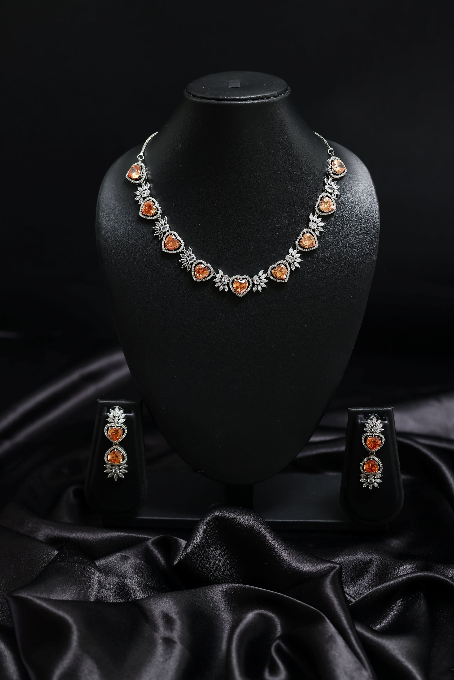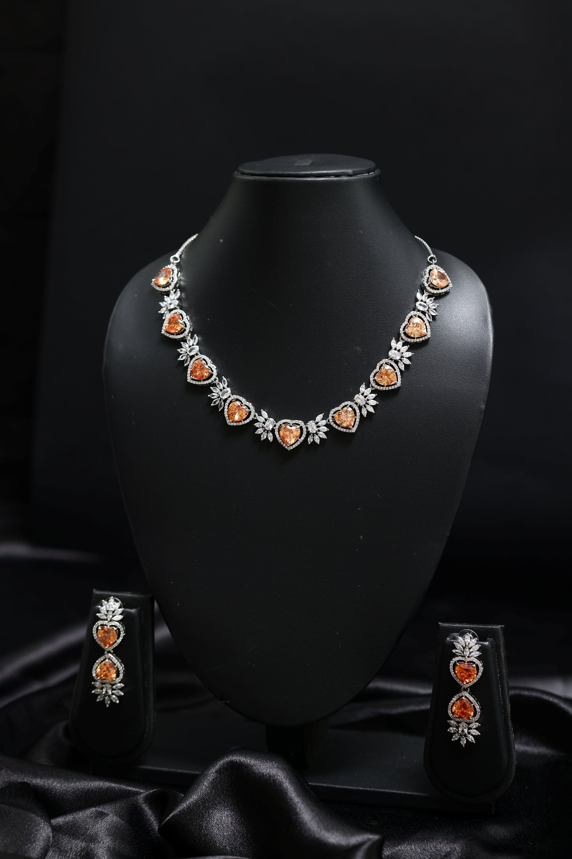 The necklace features glowing amber-orange heart-cut stones, set within a sparkling halo of AAA+ quality Cubic Zirconia. Floral clusters accent each heart, giving the design a sophisticated, couture-inspired charm. The warm gemstone tones paired with the icy brilliance of CZ create a luxurious, high-contrast effect perfect for evening glamour.