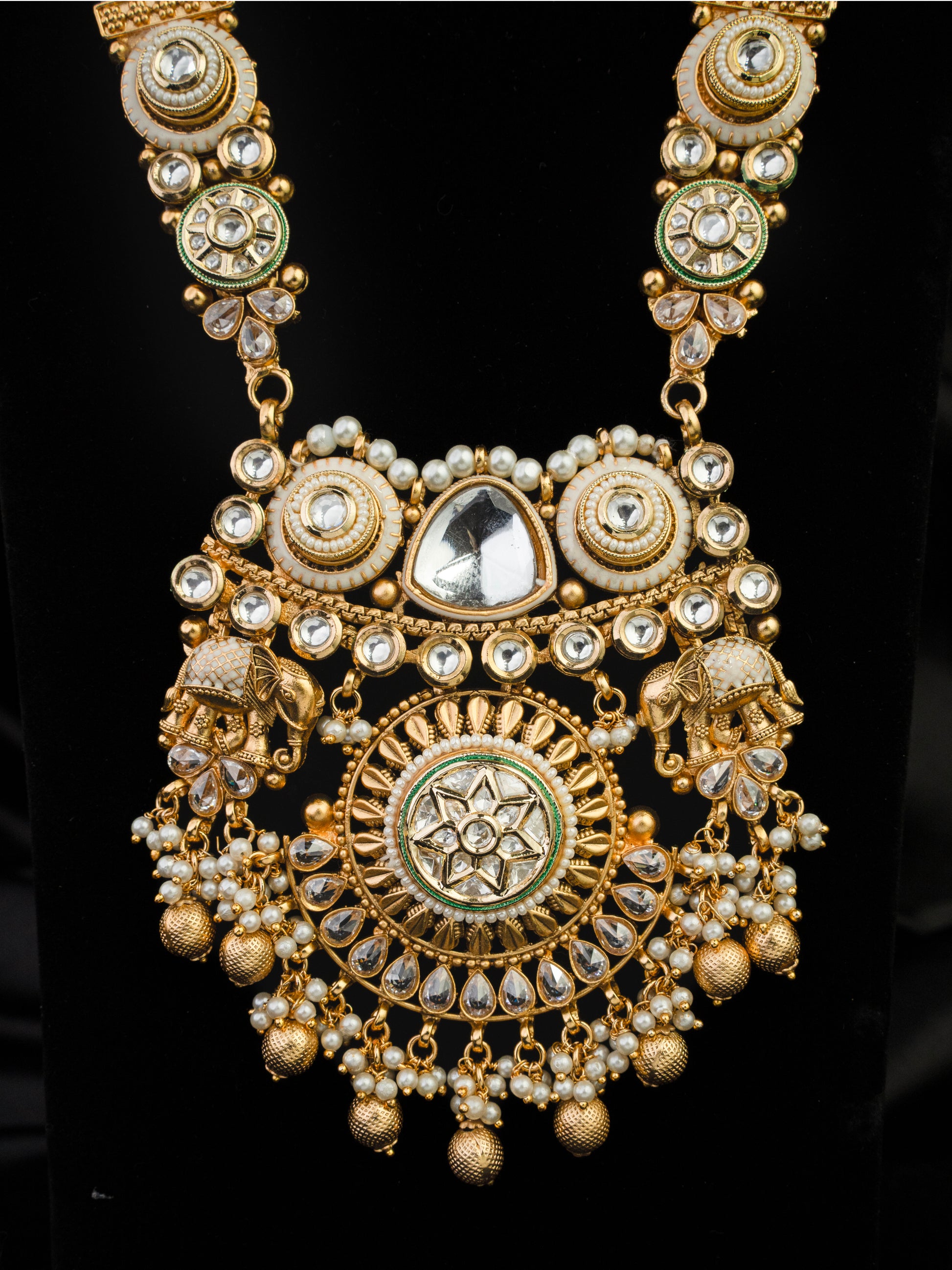 Elevate your bridal aura with the Heritage Elephanté Kundan Bridal Set—a grand heirloom ensemble crafted for the bride who embodies regality and timeless grace. Featuring intricate elephant-motif medallions, mirror-cut kundan stones, pearl-laced cascades, and ornate detailing, this magnificent set blends royal artistry with bridal opulence. The layered necklace, jhumka danglers, maang tikka, and nath come together to create a statement that is both majestic and unforgettable.