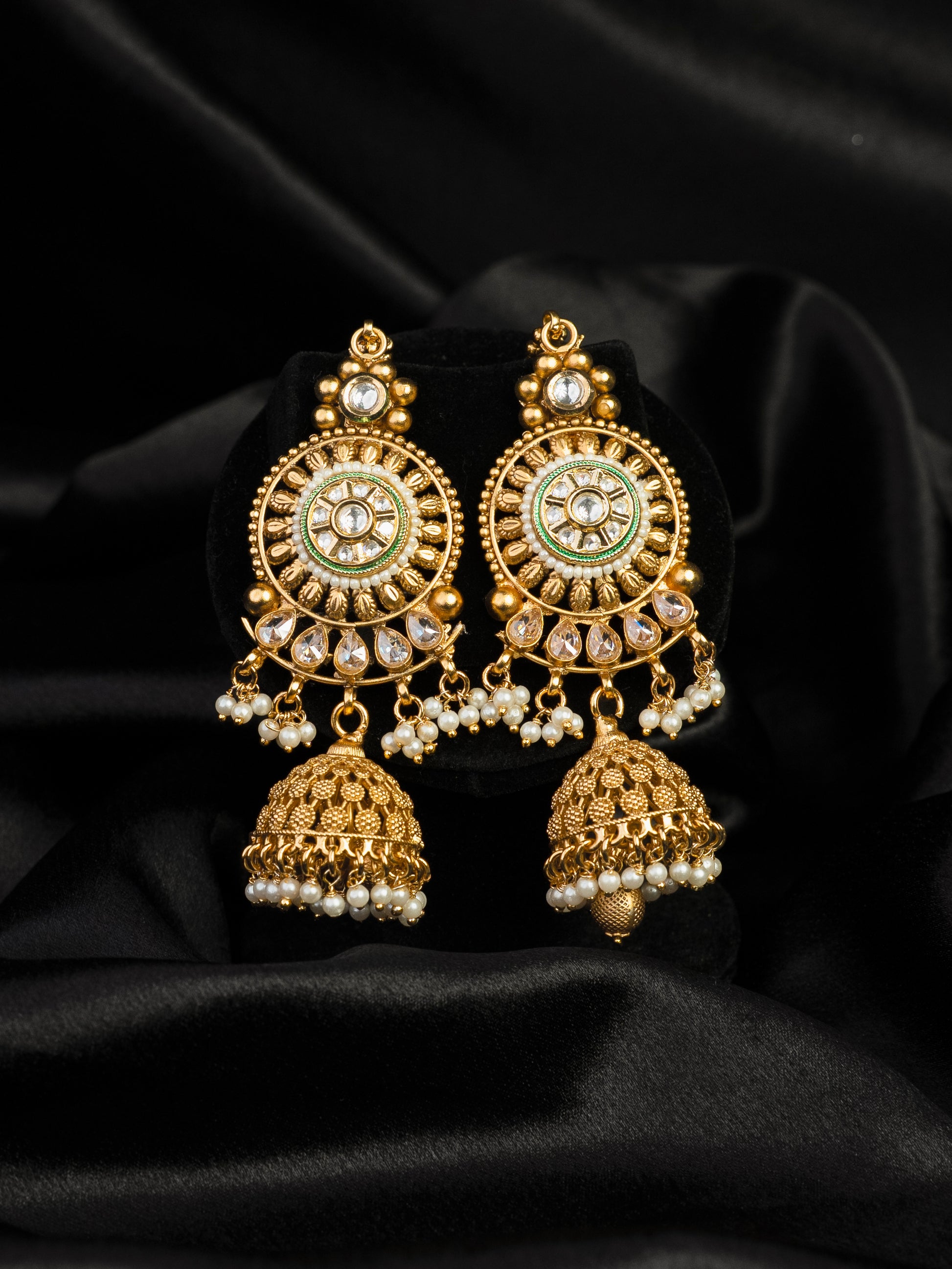 Specifications Metal Base Premium copper alloy with antique gold finish. Polish High-grade antique gold polish on a copper base. Stones Used Kundan-style glass stones, mirror-cut stones, pearl drops, carved beads, antique-gold bola drops.