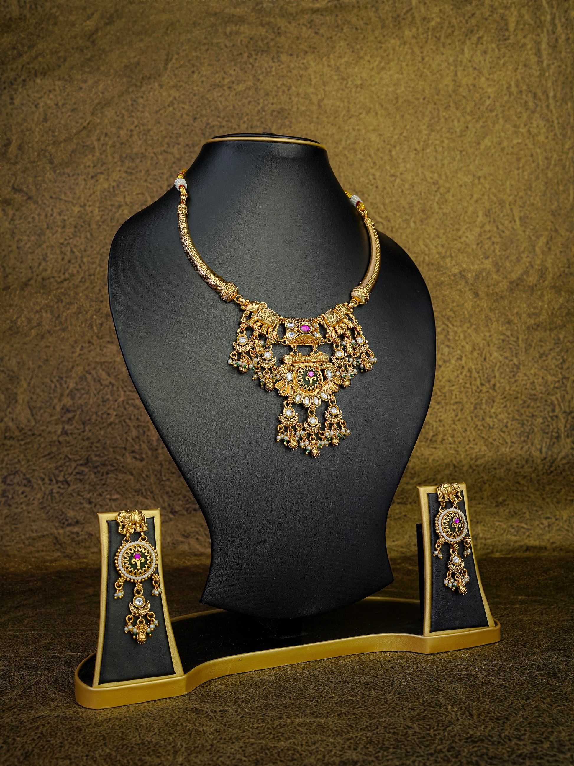 • The Collar: The set features a sleek, structured golden hasli-style collar that transitions into the ornate central motif, ensuring the piece sits perfectly against the décolletage.