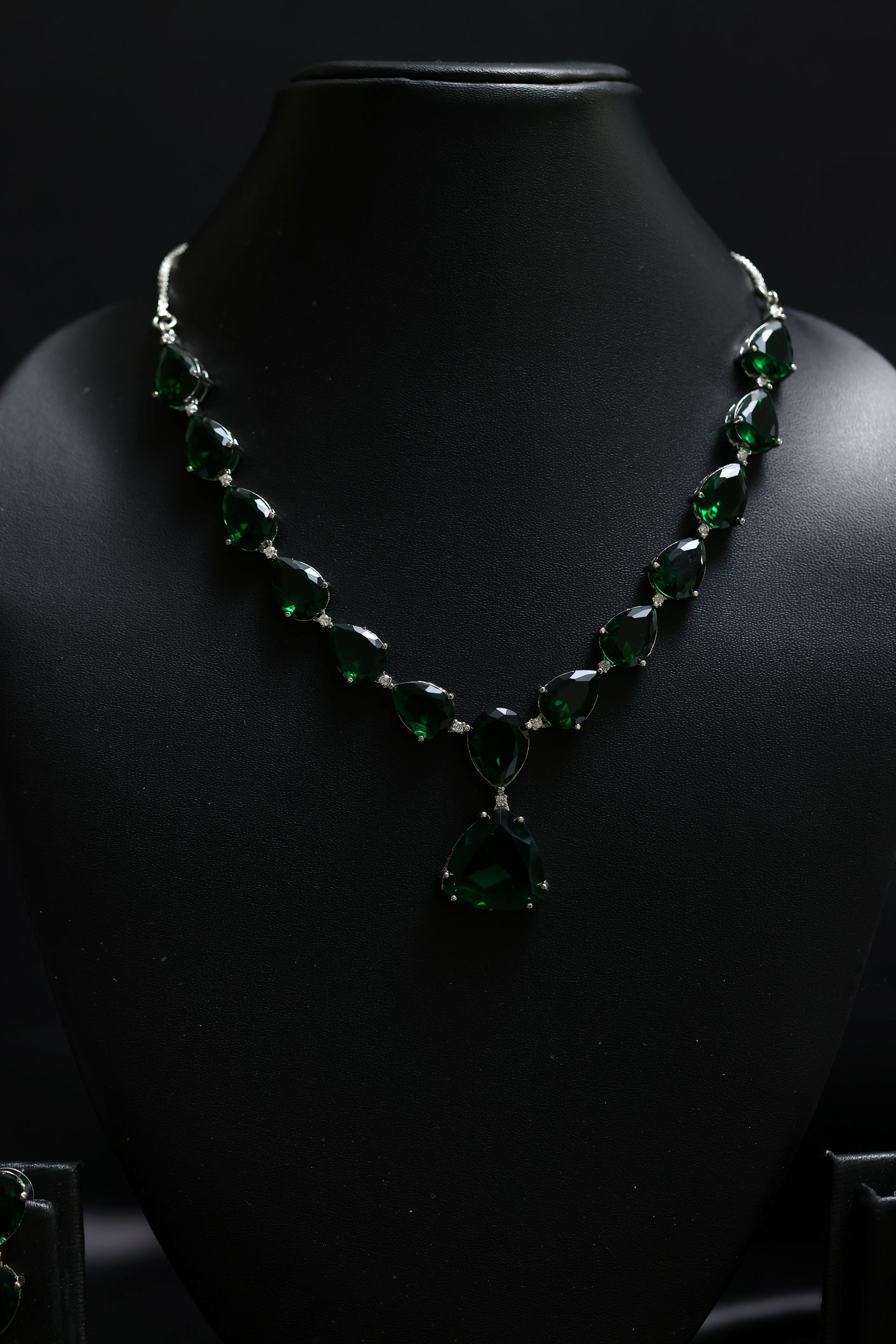 The necklace features a sequence of deep emerald-green teardrop crystals paired with brilliant-cut AAA+ Cubic Zirconia, arranged in an elegant alternating pattern. The design flows gracefully into a statement emerald centre drop—faceted to perfection and halo-framed with shimmering CZ stones for maximum brilliance. The coordinated earrings echo the same triple-teardrop motif, creating a cohesive, luxurious silhouette that enhances every neckline beautifully.