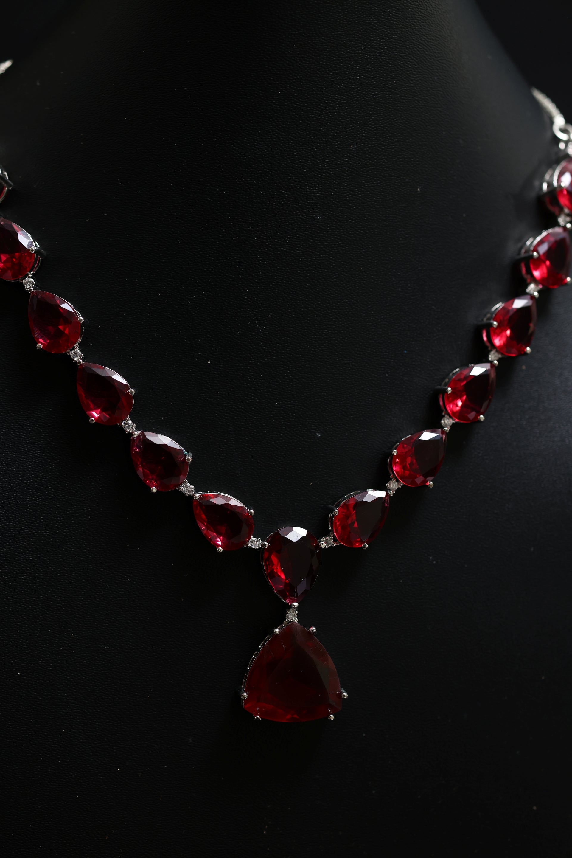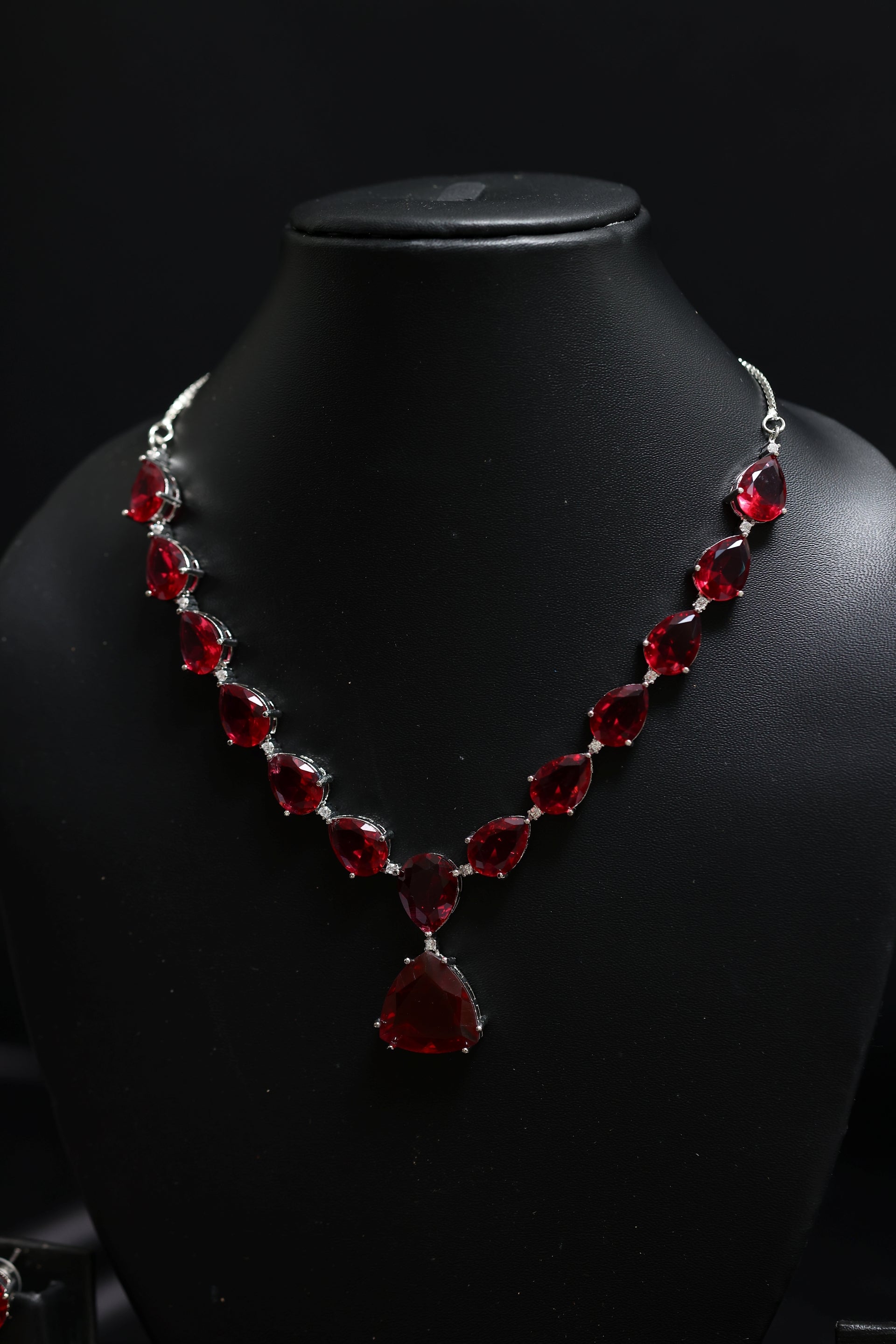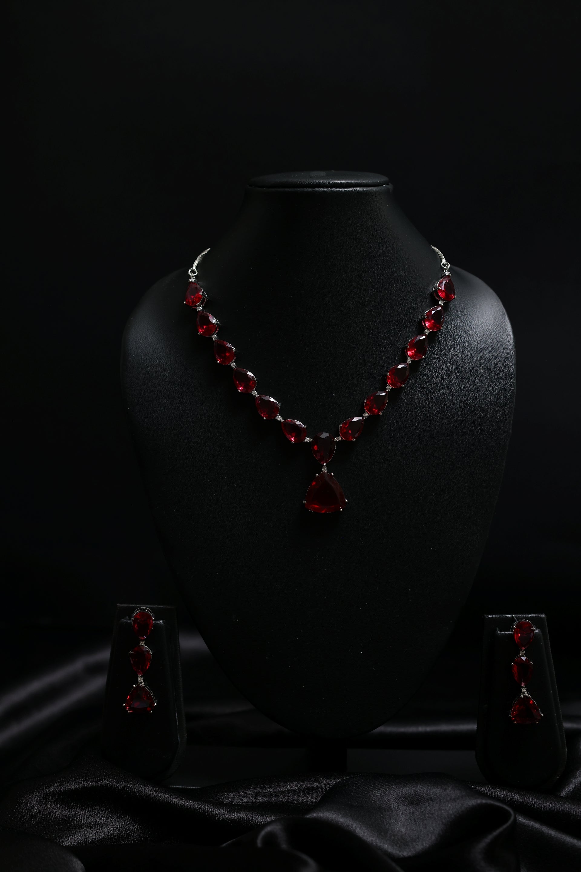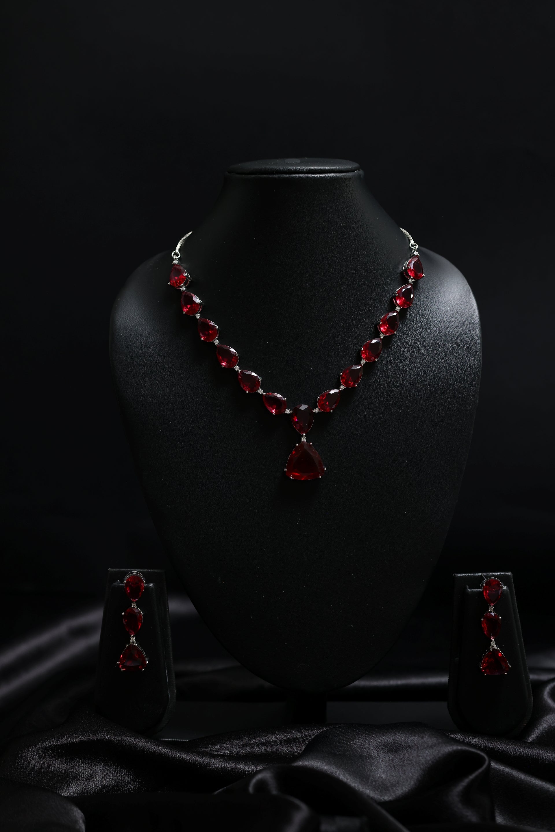 The necklace showcases a stunning sequence of deep scarlet pear-cut crystals, each faceted to perfection for a dramatic gemstone glow. The centrepiece drop adds movement and allure, enhancing the neckline with a refined V-shaped silhouette. Accompanied by matching triple-drop earrings, the set creates a cohesive, striking statement ideal for evenings where elegance must command attention.
