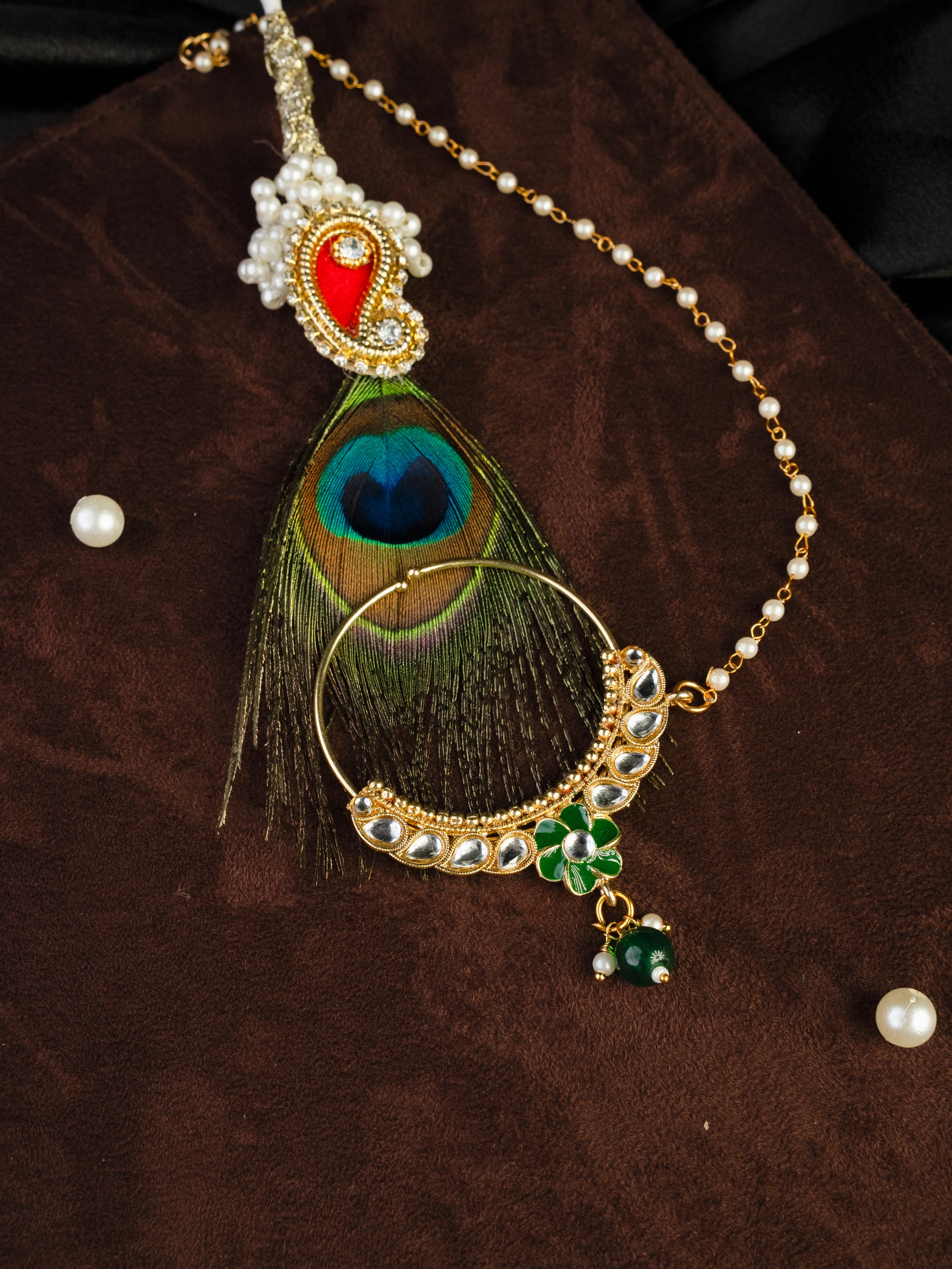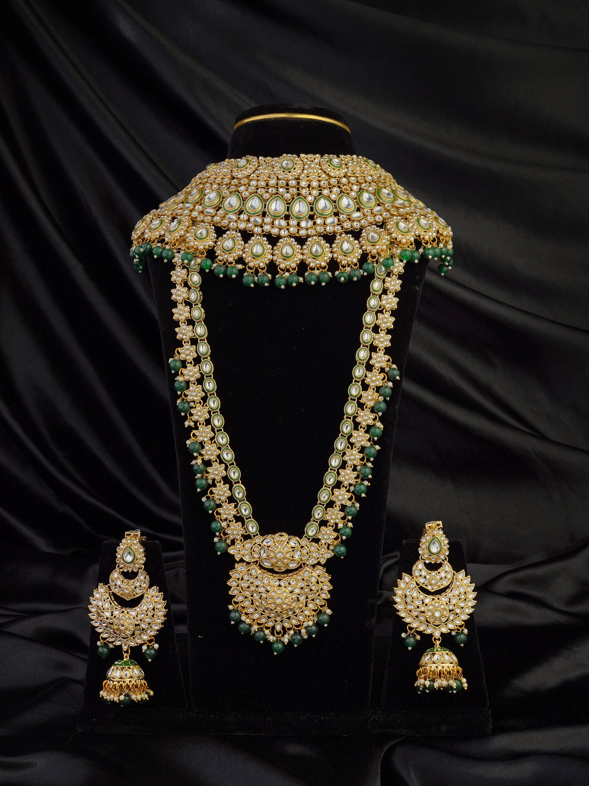 Step into timeless grandeur with the Maharani Smaragda Bridal Ensemble, a masterpiece crafted to echo the regal splendor of royal wedding heirlooms. Designed in classic kundan artistry with rich emerald tones, this ensemble blends opulence with intricate detailing—perfect for the bride who desires an unforgettable statement of heritage and luxury. The choker blooms with hand-set polki-style kundan, bordered with fine green enamel touches and finished with deep emerald bead hangings. The long necklace mirrors the same royal language, cascading elegantly with floral kundan clusters and emerald droplets, forming a breathtaking layered bridal look. Paired with elaborately detailed chandbali earrings, a statement passa, and an ornate nath, the ensemble carries the aura of a queen adorned for her most cherished moment. A true collector’s treasure—majestic, enduring, and crafted to illuminate every frame. Specifications Metal Base: Copper alloy with premium antique gold finishing. Polish: High-grade antique gold polish on a copper base. Stones Used: Kundan-style glass stones, polki-tone stones, green enamel highlights, emerald-tone beads, pearl drops.
