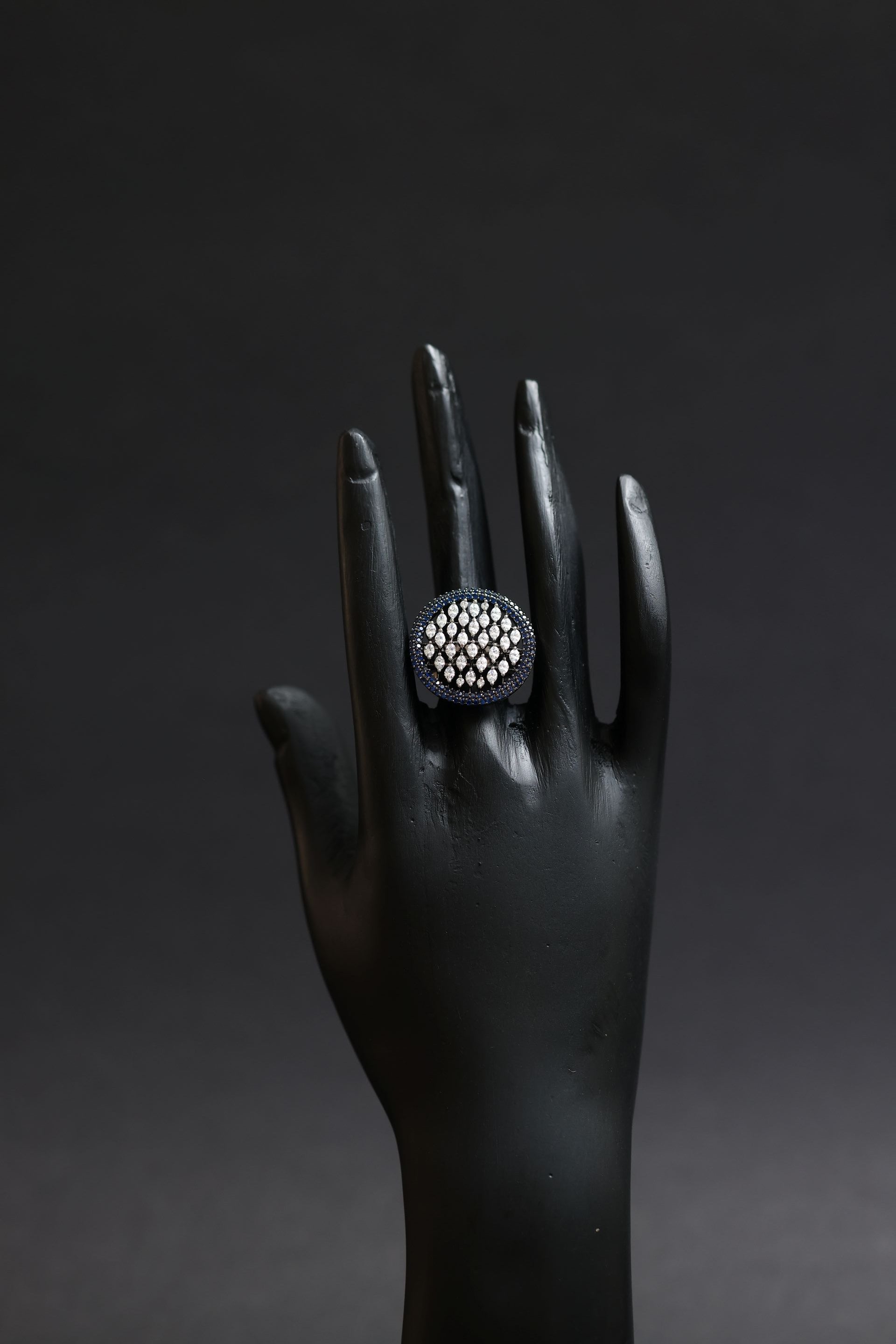 Base Metal: Premium Brass Polish: Rhodium Polish – Silver Base Stones: AAA+ Quality Cubic Zirconia · Micro-Pavé CZ Honeycomb Layout Design: Elevated Dome Motif · Black Contrast Base · High-Sparkle CZ Pattern Ring Type: Fixed Size Statement Ring Occasion: Cocktail · Party Wear · Evening Glam · Festive Styling · Modern Luxury Looks