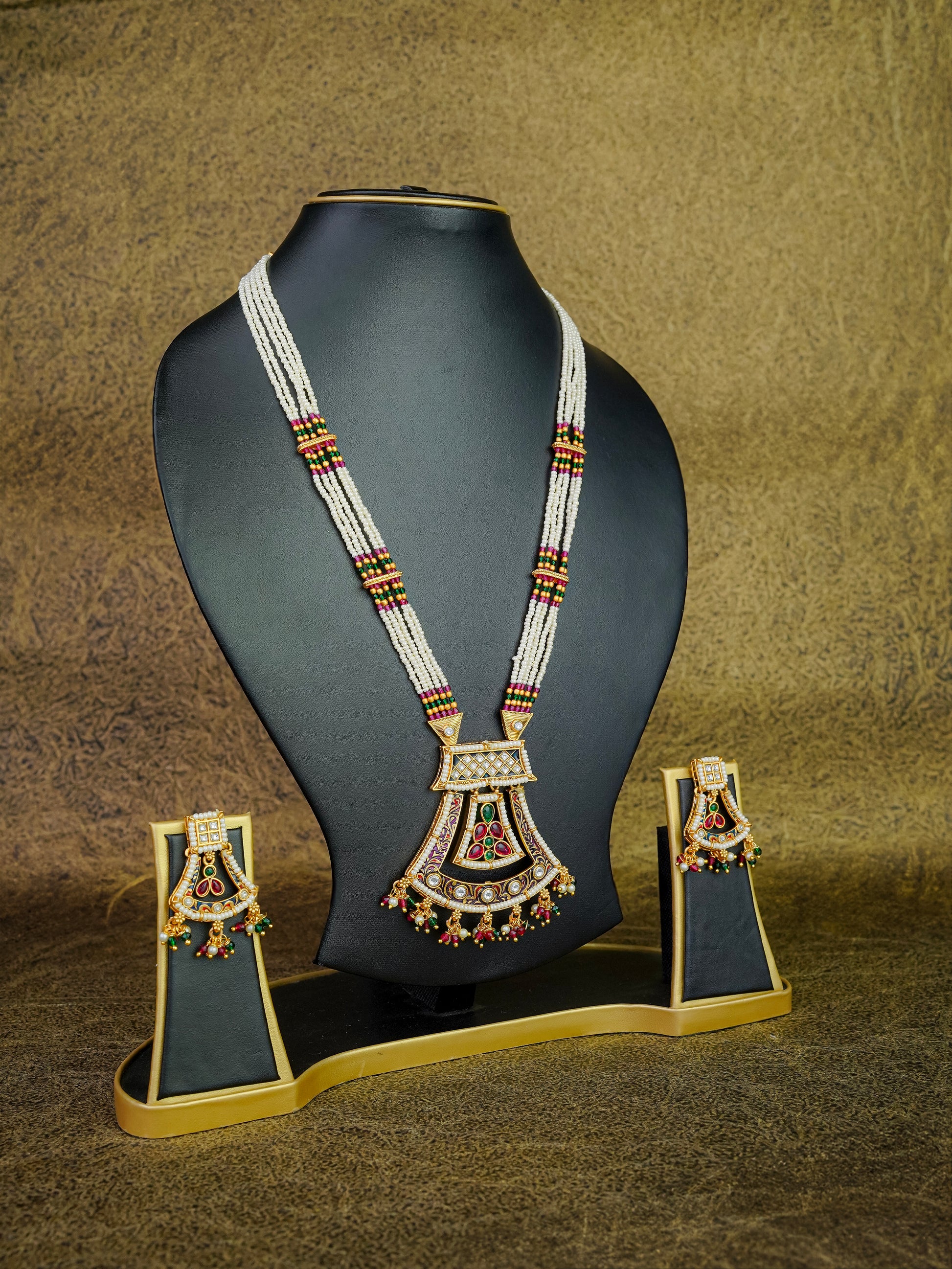 Experience the grandeur of a bygone era with this exquisitely handcrafted long-form necklace set. Designed for the woman who seeks a regal silhouette, this piece combines the delicate texture of seed pearls with bold, artistic enamel-work, creating a timeless heirloom that commands attention.