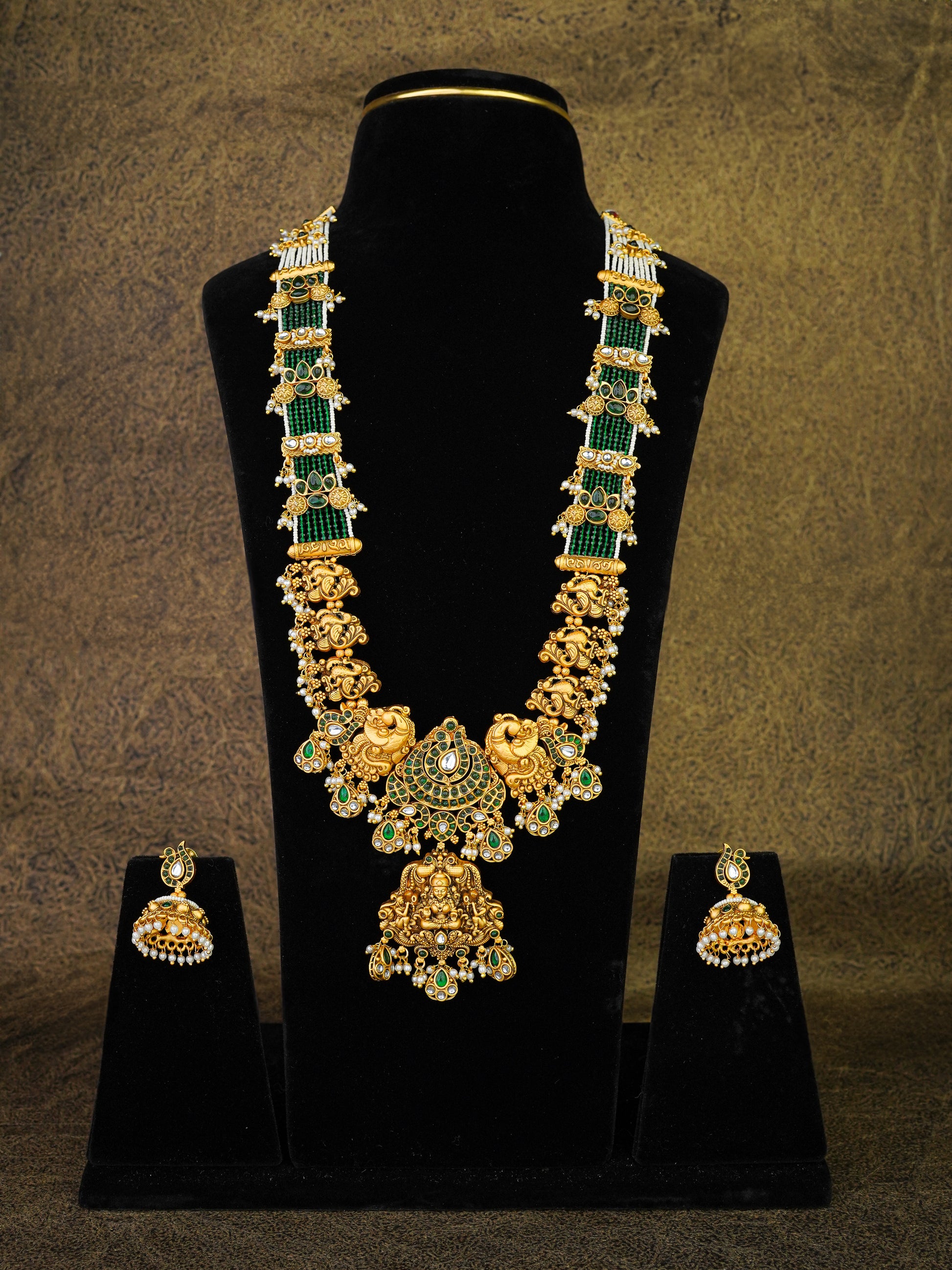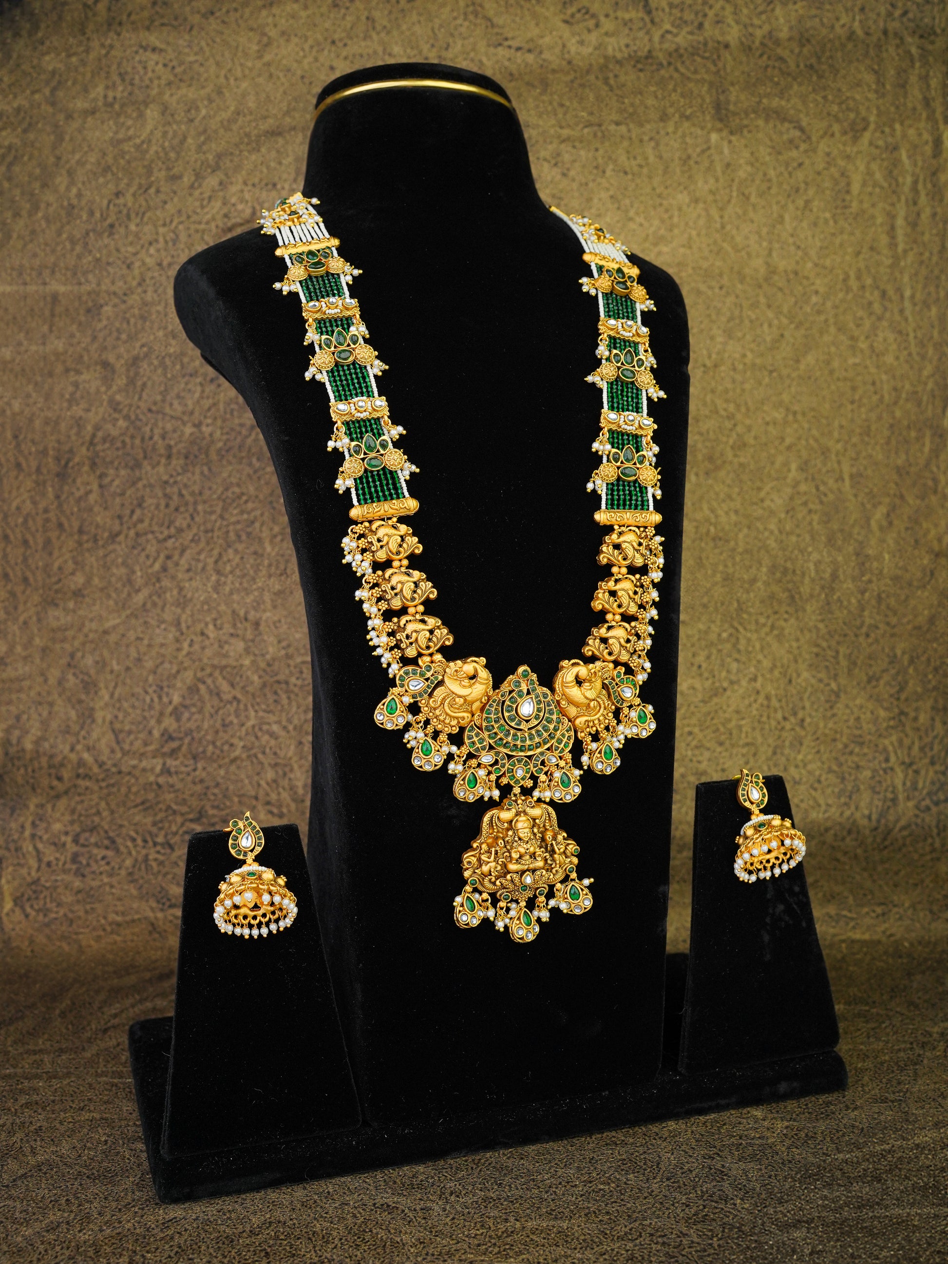 ✨ Specifications Metal Base: Copper alloy Polish: Premium antique gold temple finish Stones Used: Kundan glass stones, emerald-green stones, temple-style stone accents, micro pearls Design Details: Temple-inspired motifs, layered green bead strands, sculpted gold elements, pearl danglers Set Includes: Long temple haar, jhumka earrings Occasion: Heritage wear, temple ceremonies, traditional rituals, cultural and heirloom occasions