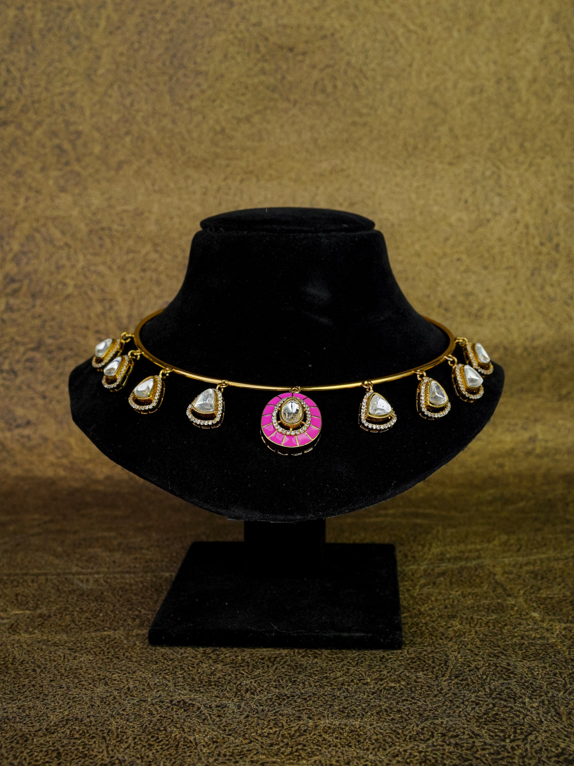 • The Centerpiece: The focal point is a magnificent circular medallion featuring a radiant Kundan-set stone at its heart, framed by a vibrant rose-pink enamel (Meenakari) border. This "pop" of color adds a playful yet regal touch to the golden palette.
