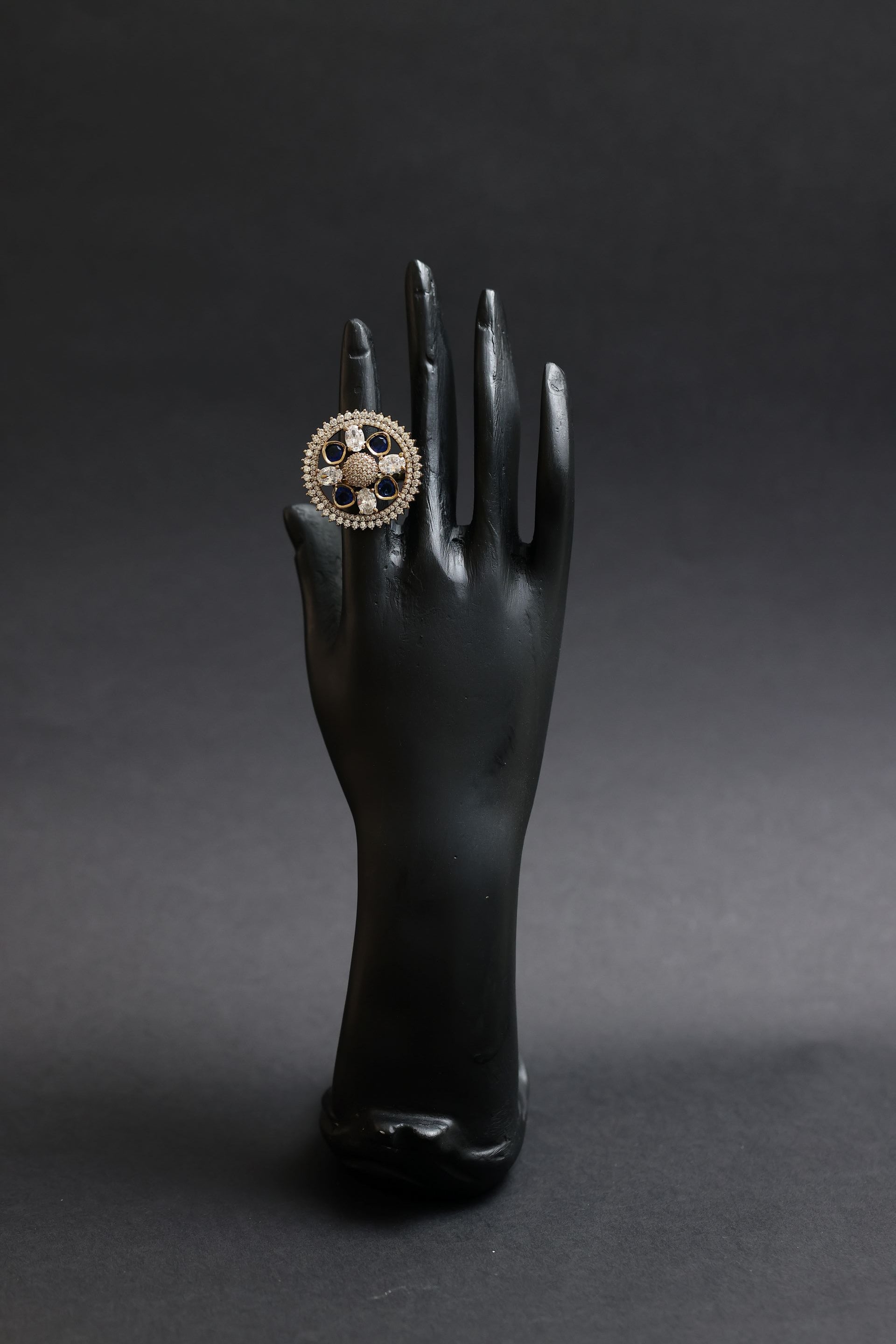 Base Metal: Premium Brass Polish: Rhodium Polish Stones: Sapphire-Toned Studs · AAA+ Quality Cubic Zirconia · Micro-Pavé CZ Dome Design: Circular Orbit Motif · Sapphire & Zircon Alternating Layout · Doubled Bead Detailing Ring Type: Adjustable Statement Ring Occasion: Bridal · Festive · Cocktail · Party Wear · Royal & Heritage Styling