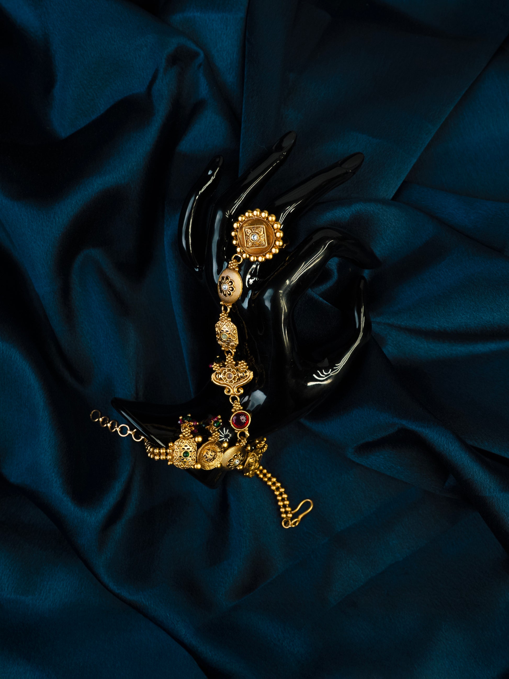 ✨ Specifications: Metal Base: Copper alloy with premium antique gold finishing. Polish: High-grade antique gold polish on a copper base. Stones Used: Pastel cabochon stones (pink, mint, aqua), kundan-style glass stones, carved floral motifs, bead drops, mini pearl clusters. Components: Multi-layered necklace, matching earrings, hathphool, mathapatti/maang tikka. Style: Heritage · Grand Bridal · Pastel Royal Occasions: Wedding · Reception · Traditional Bridal Ceremonies