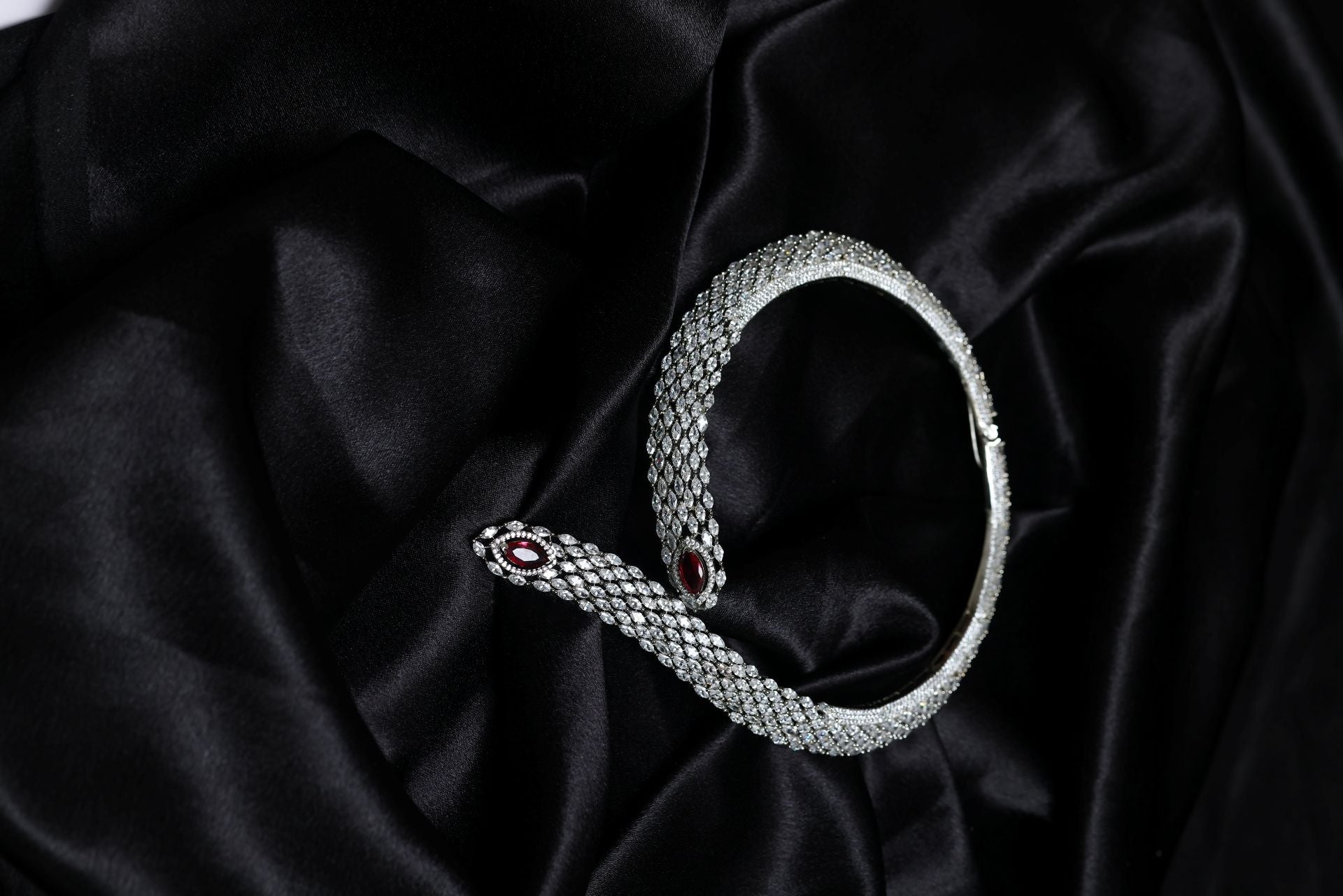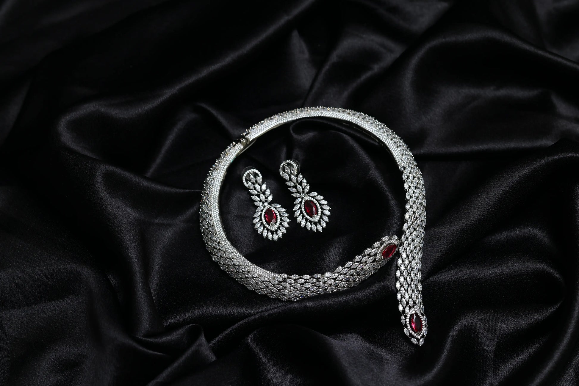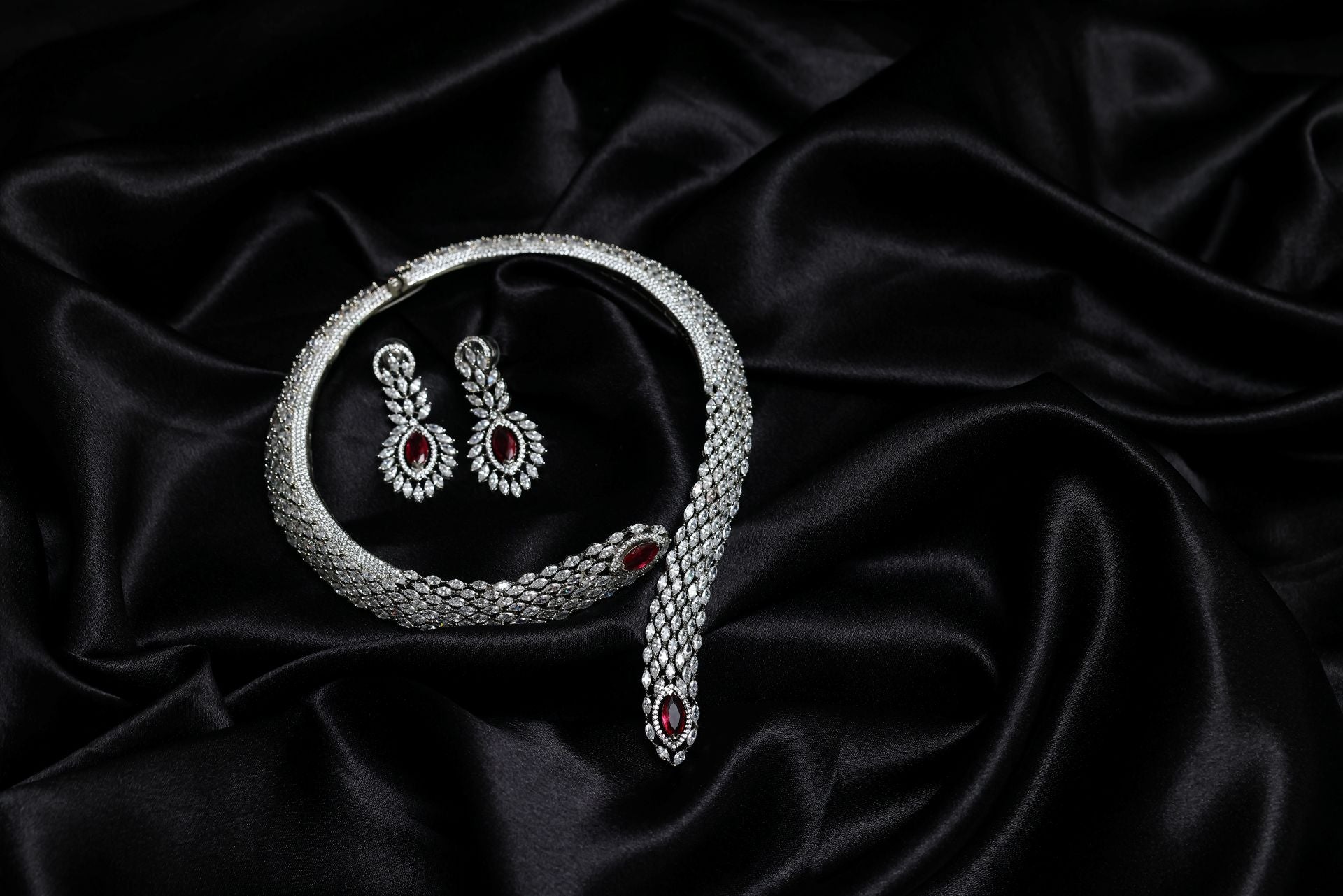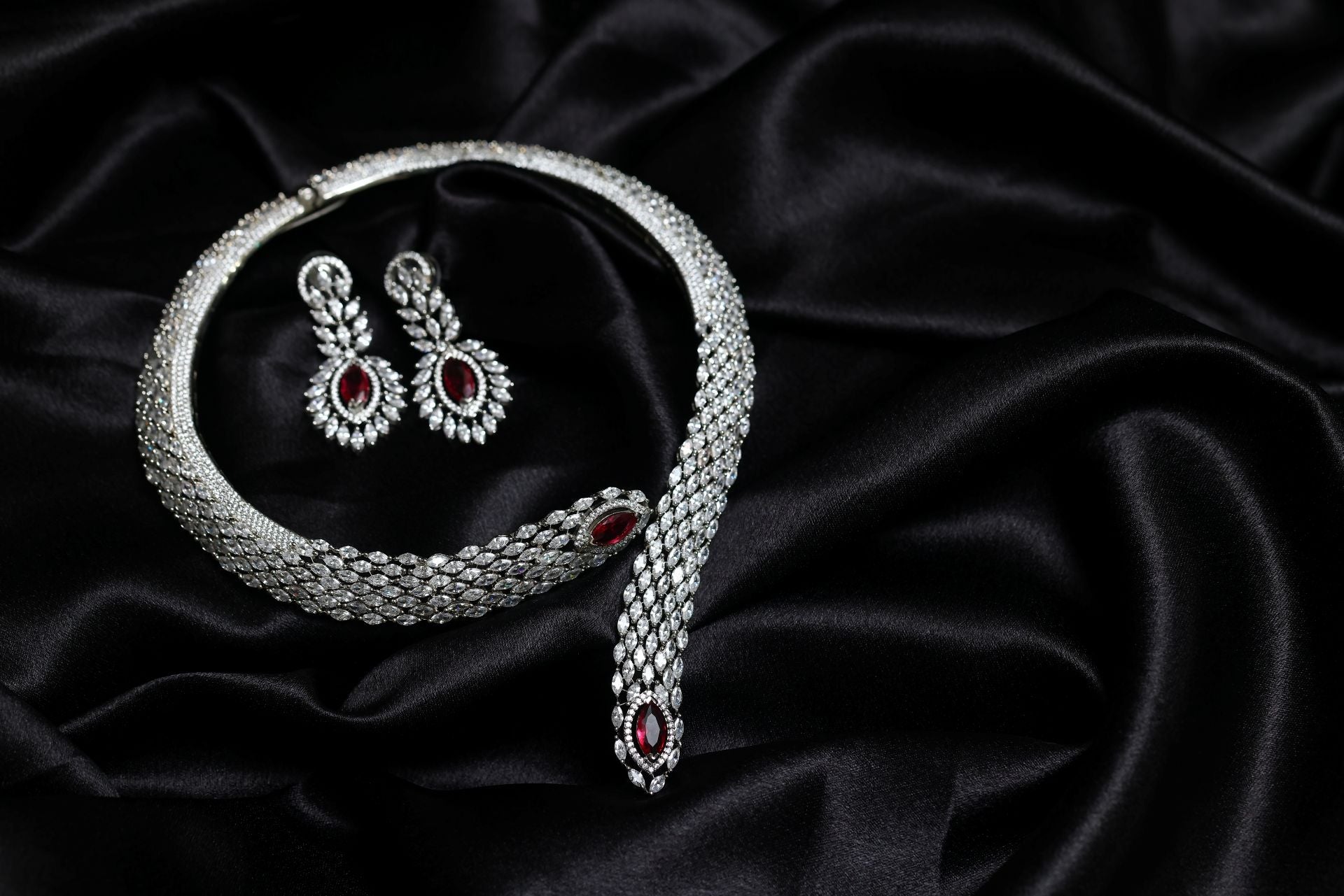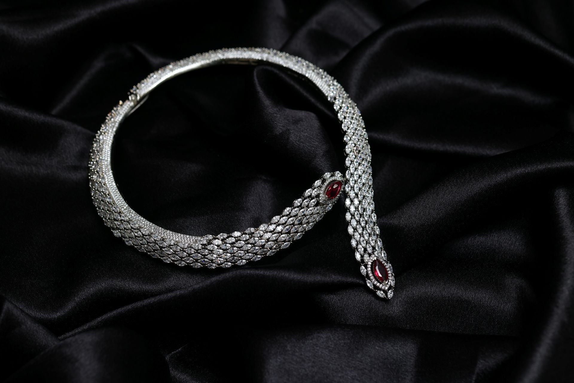 The necklace features a dramatic serpent-inspired silhouette woven with hundreds of marquise-cut AAA+ Cubic Zirconia stones, creating a fluid, armor-like texture that hugs the neckline with royal precision. At both ends of the choker lies a stunning deep-scarlet marquise crystal, framed in a halo of glittering CZs, adding a bold burst of colour and luxury.