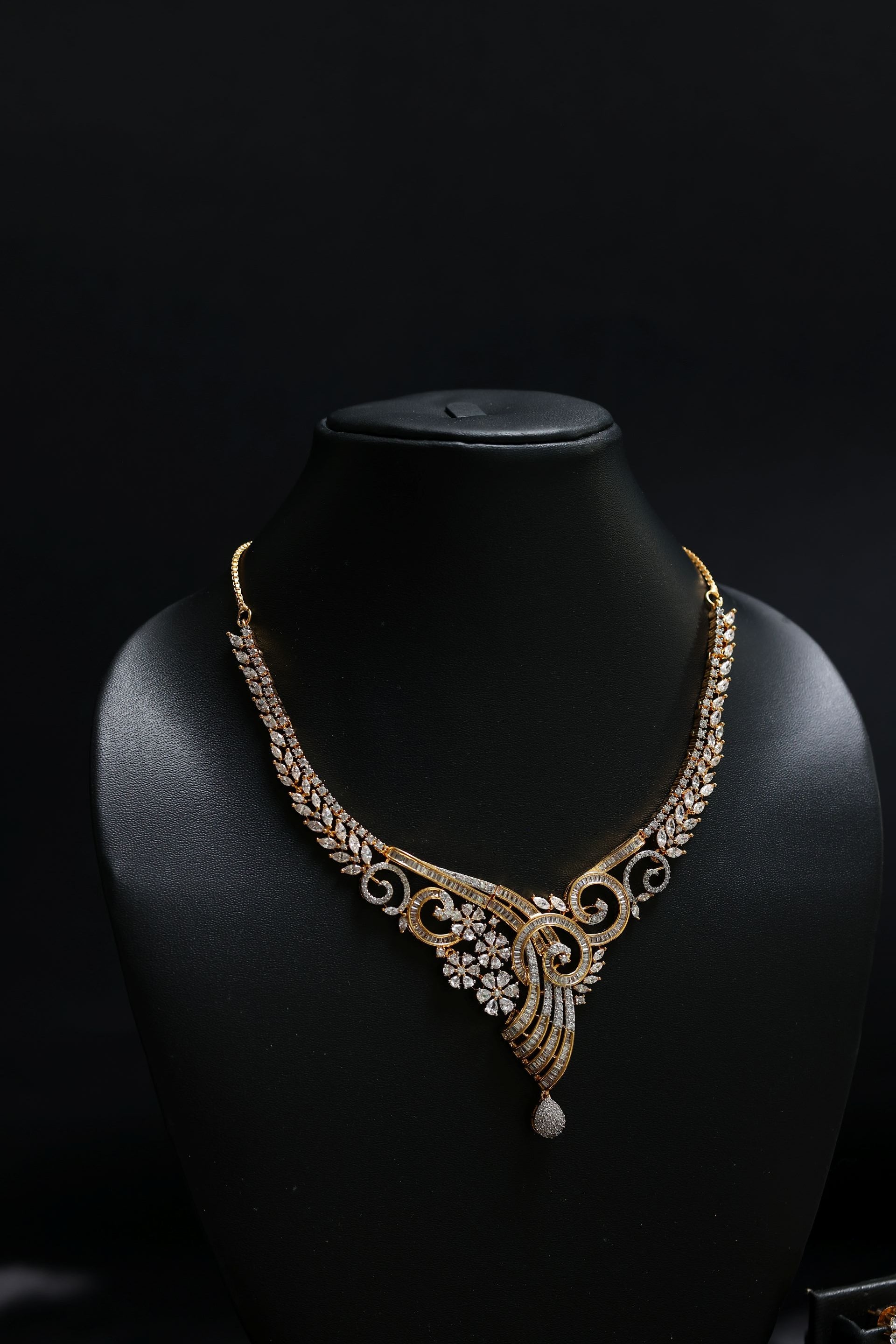 The Golden Royale Swirl Diamond Necklace Set is an ode to timeless luxury, artistic detailing, and graceful brilliance. Handcrafted from premium brass and finished in a rich gold-polished sheen, this necklace radiates the elegance of premium designer diamond jewellery.