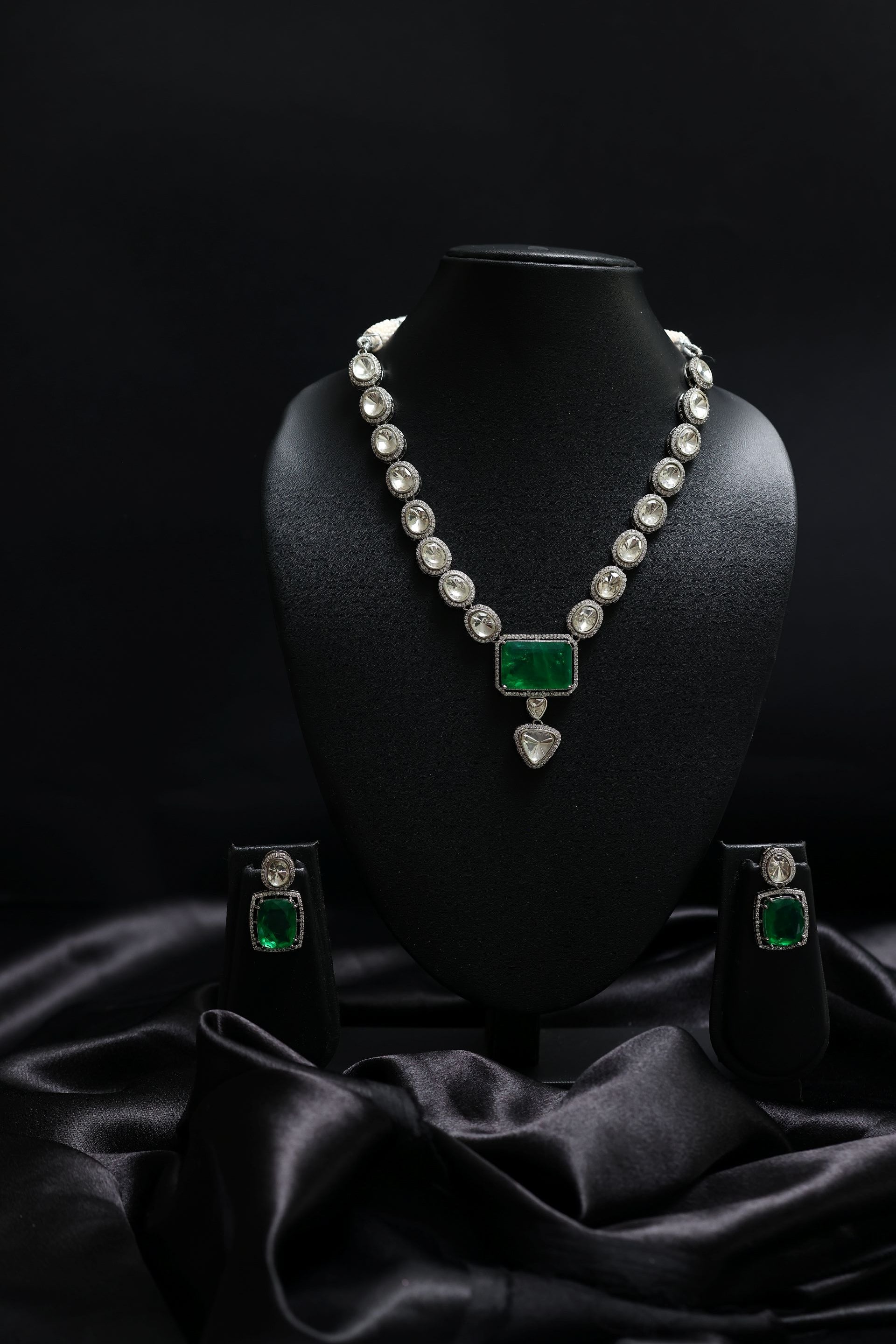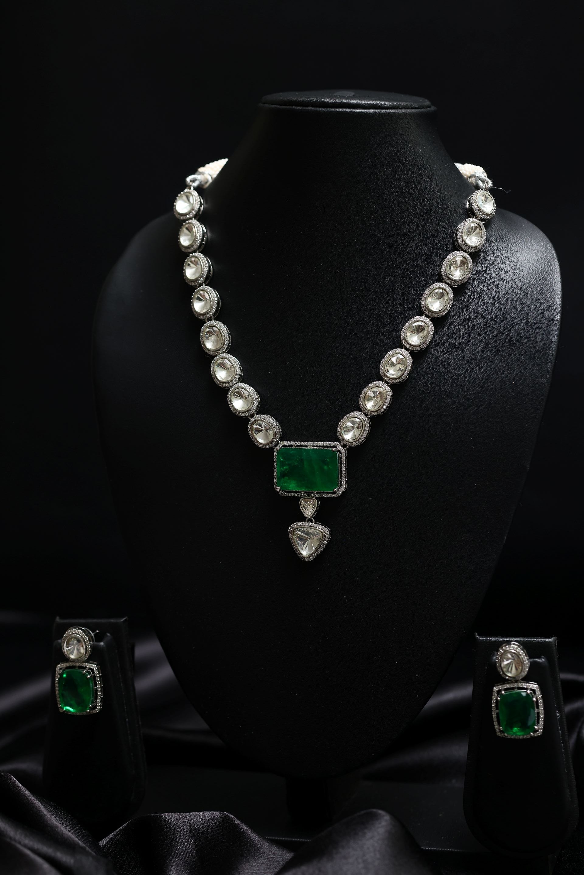 The Emerald Royale Solitaire Diamond Necklace Set is a breathtaking blend of regal sophistication and high-jewellery brilliance. Crafted from premium brass and finished in a lustrous rhodium-polished silver tone, this set radiates the majestic charm of fine emerald couture pieces.