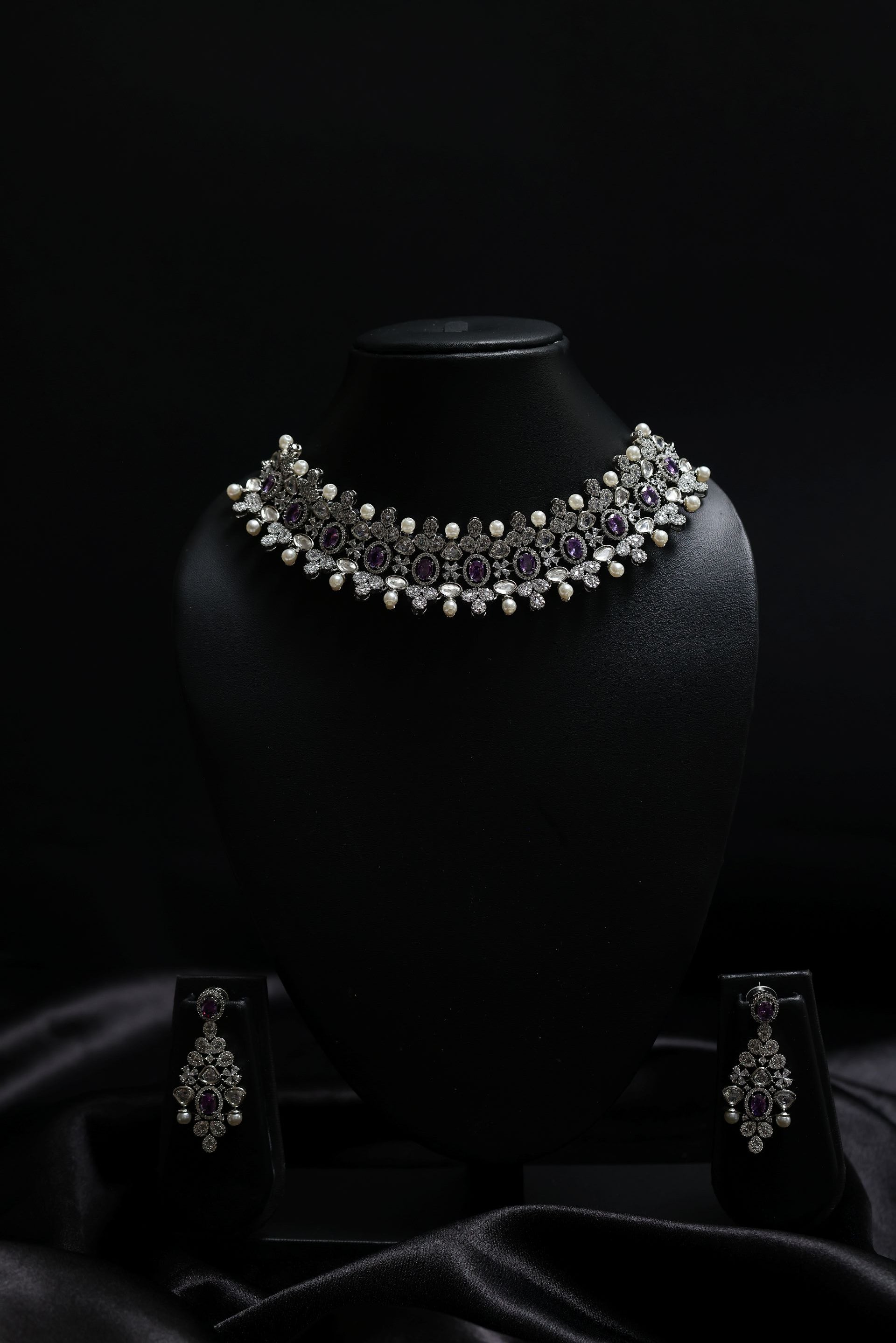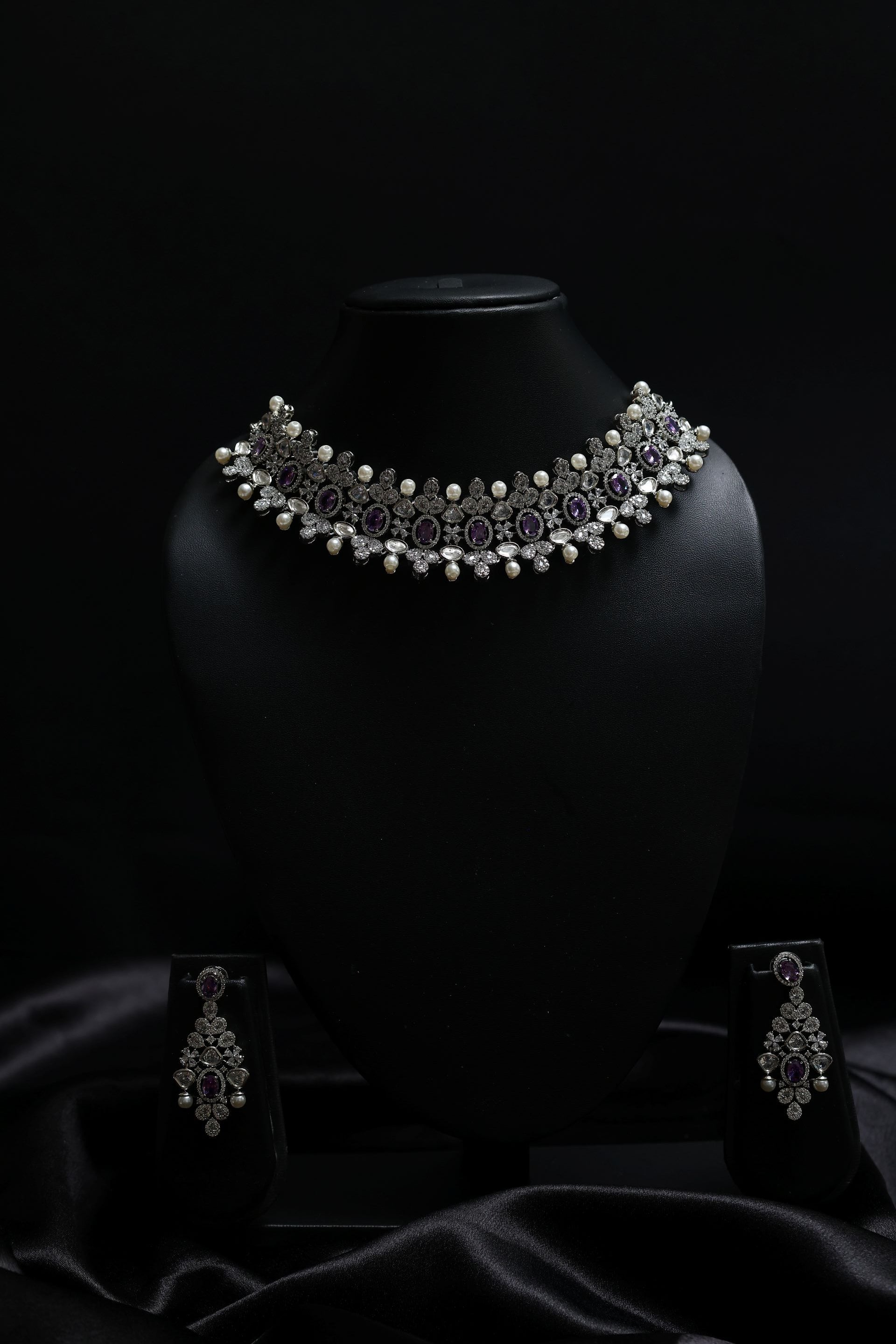 The Vintage Choker With Amethyst, Pearls & Diamonds Necklace Set is a masterpiece of regal craftsmanship, blending the richness of Victorian design with contemporary luxury. Handcrafted from premium brass and finished in a luminous rhodium-polished silver, this statement choker radiates grandeur, elegance, and timeless beauty.