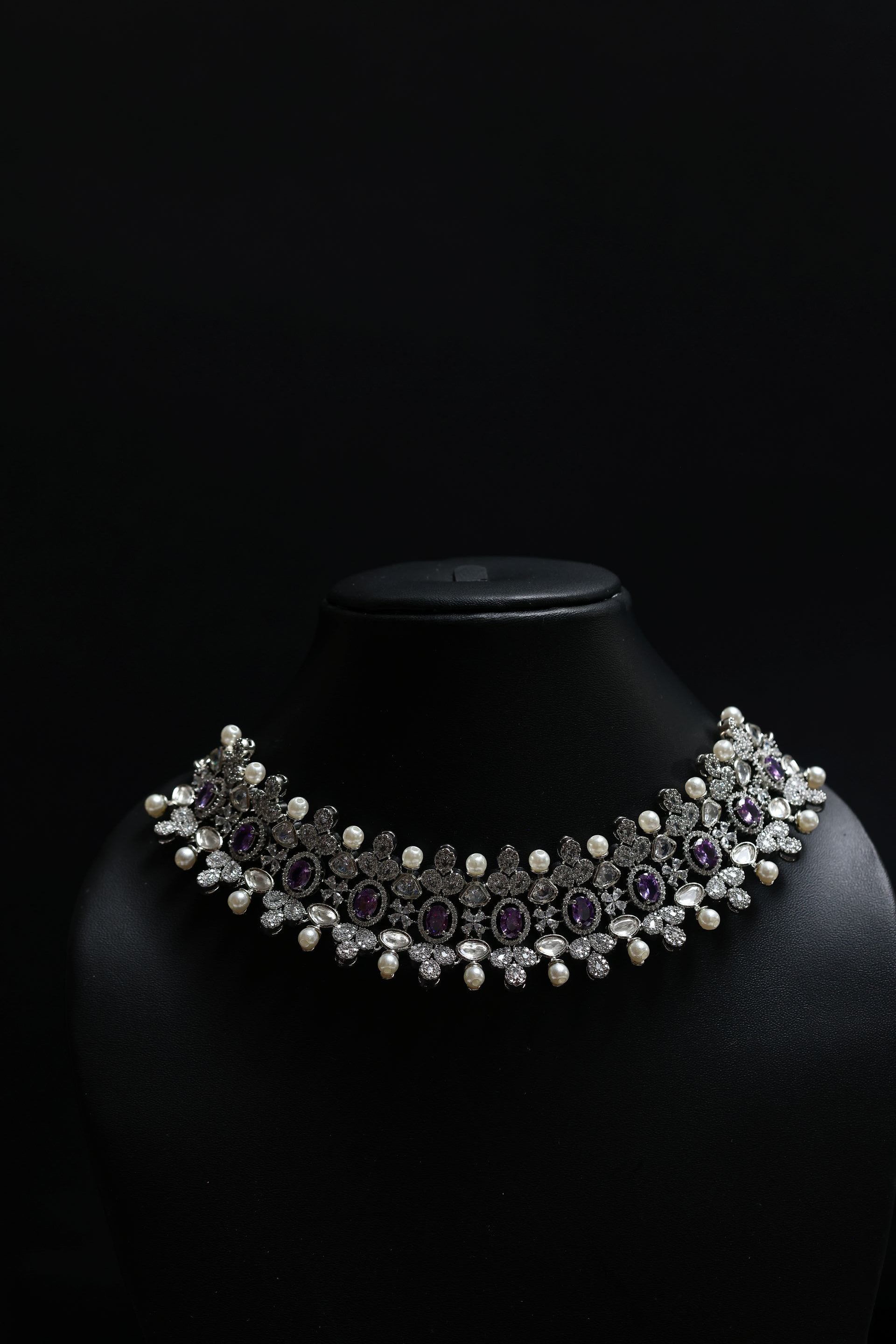 The choker features a magnificent arrangement of oval-cut amethyst crystals surrounded by brilliant AAA+ Cubic Zirconia floral clusters. Every stone is meticulously set to create a high-jewellery look that mirrors the finesse of couture diamond craftsmanship. A halo of delicate pearl drops borders the entire piece, adding heritage charm, fullness, and an opulent finish.
